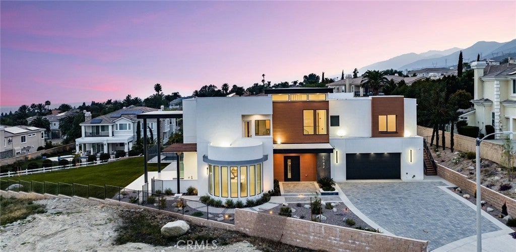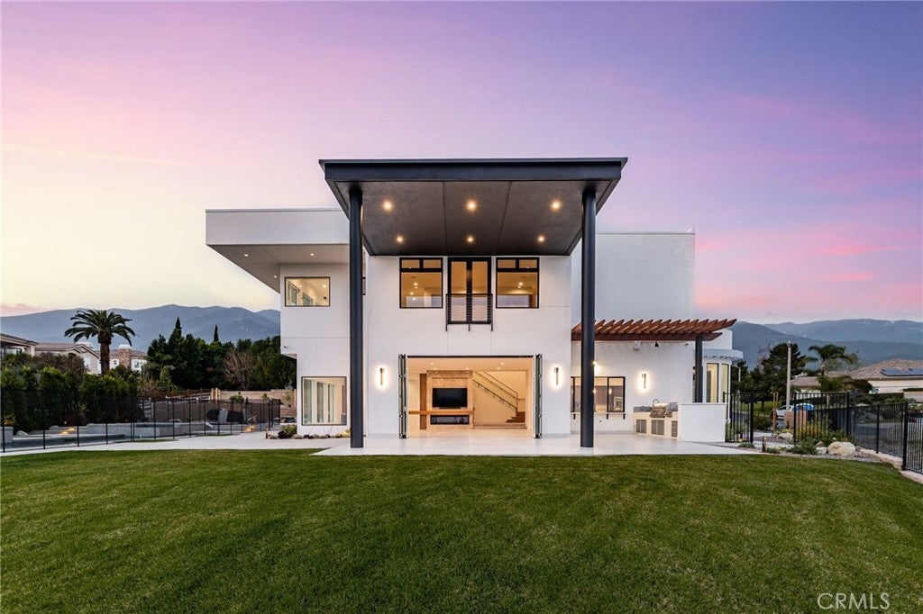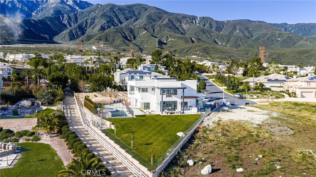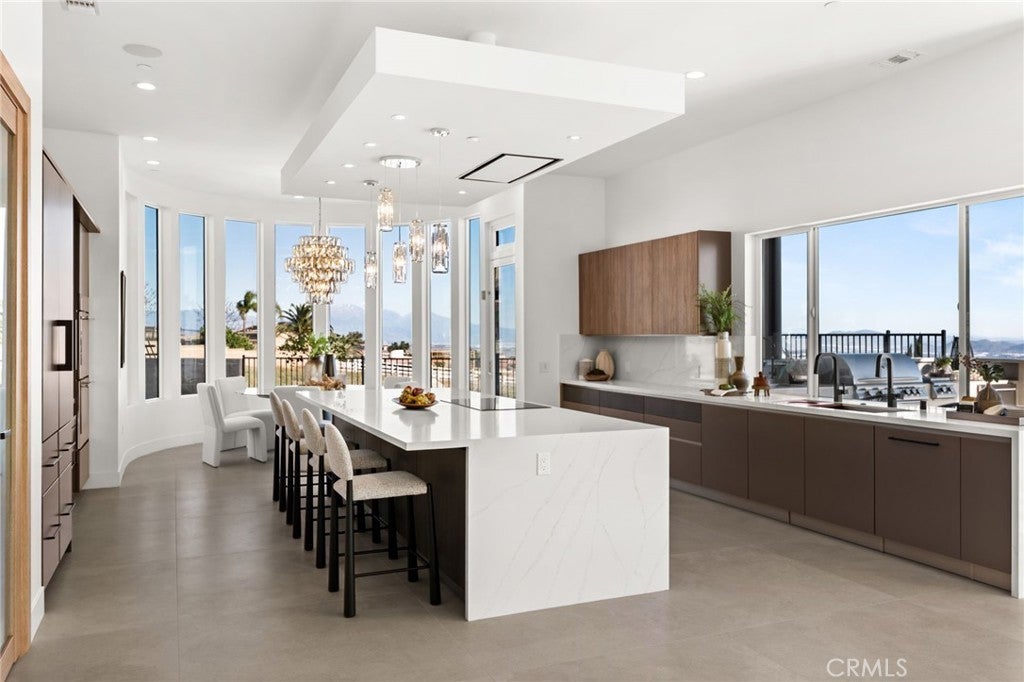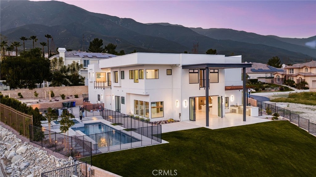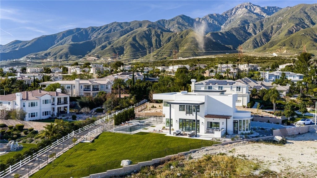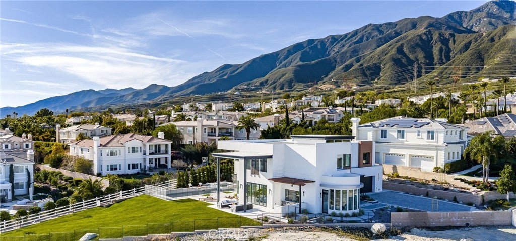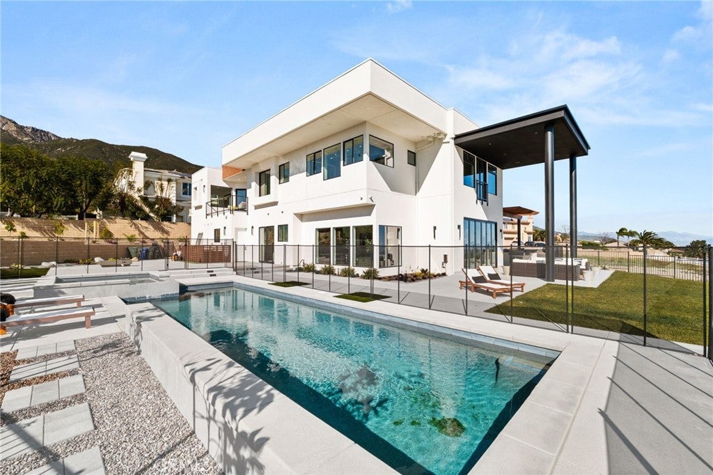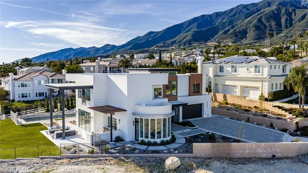 Welcome to The Summit House, an extraordinary modern architectural masterpiece boasting 3,963 square feet of exquisitely crafted living space in the main residence, perched at approximately 2,150 feet above sea level at the end of one of Rancho Cucamonga’s most private and elevated cul-de-sacs. This bespoke estate embodies a seamless fusion of precision engineering, sophisticated design, and elevated lifestyle. A striking 27-foot glass tower and floating portico announce your arrival, opening to a grand foyer defined by soaring ceilings and a sculptural glass staircase. The main living level is anchored by an 18-foot feature wall clad in slab marble with a fireplace, integrated bar, and expansive disappearing glass walls that dissolve the boundary between interior and resort-inspired grounds. Outside, 22-foot steel columns frame a covered patio overlooking a modern pool and elevated spa, meandering water features, a vineyard, orchard, and meticulously manicured lawns — all conceived for privacy, serenity, and visual harmony. The chef’s kitchen is a triumph of design, featuring Italian Stosa cabinetry, a dramatic 12-foot waterfall island, and fully integrated Thermador appliances. The residence offers three gourmet kitchens, opulent en-suite bedrooms, spa-caliber baths with advanced smart technology, and a primary suite with commanding mountain and valley views. An upper-level Sky Residence provides over 950 square feet of private quarters with its own entrance, kitchen, and bath — perfect for guests or extended family. Engineered for ultimate performance, the home is equipped with enterprise-grade networking, integrated security and surveillance, Lutron lighting, Sonos audio, multi-zone HVAC, dual tankless systems, and solar integration. With an approximately 30’ x 40’ finished showroom-style garage and meticulous attention to every detail, The Summit House is the pinnacle of modern architectural sophistication — where artful design meets unparalleled luxury living.