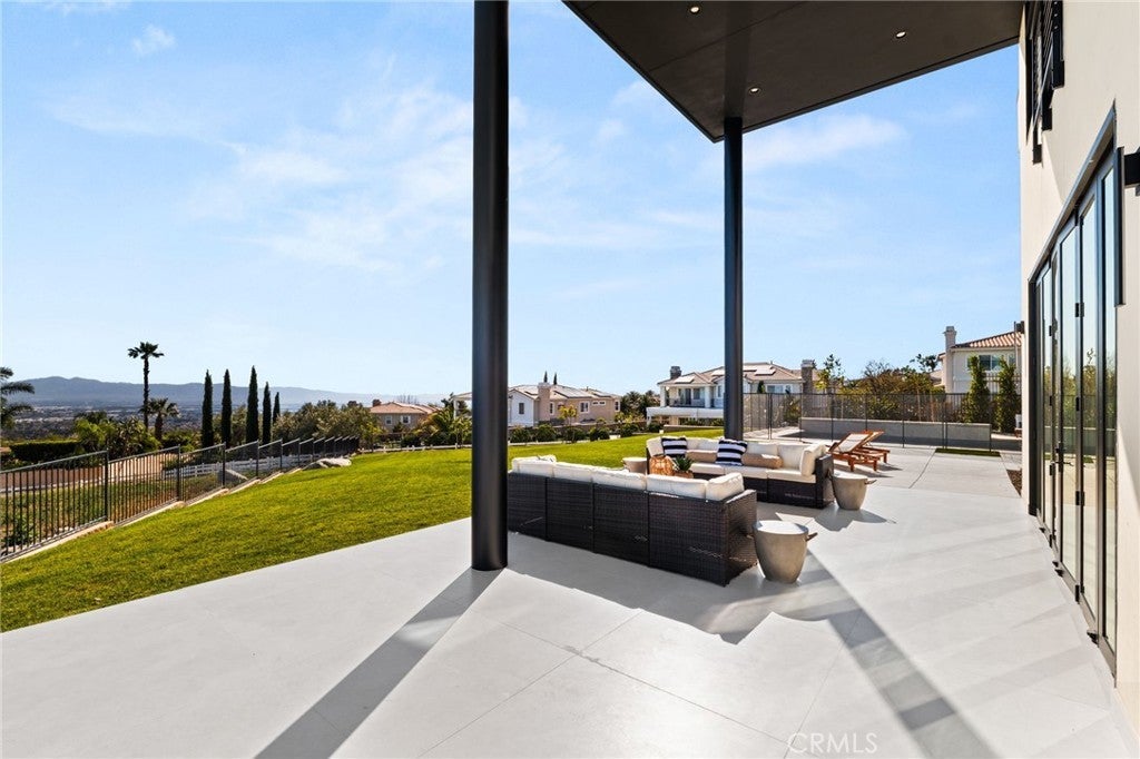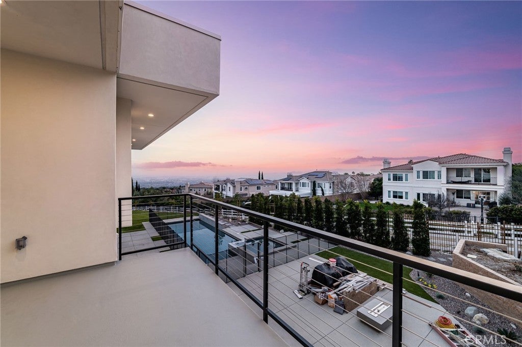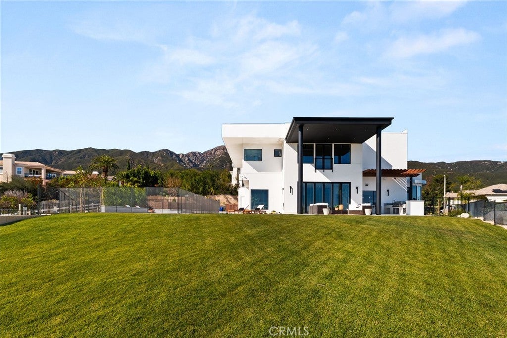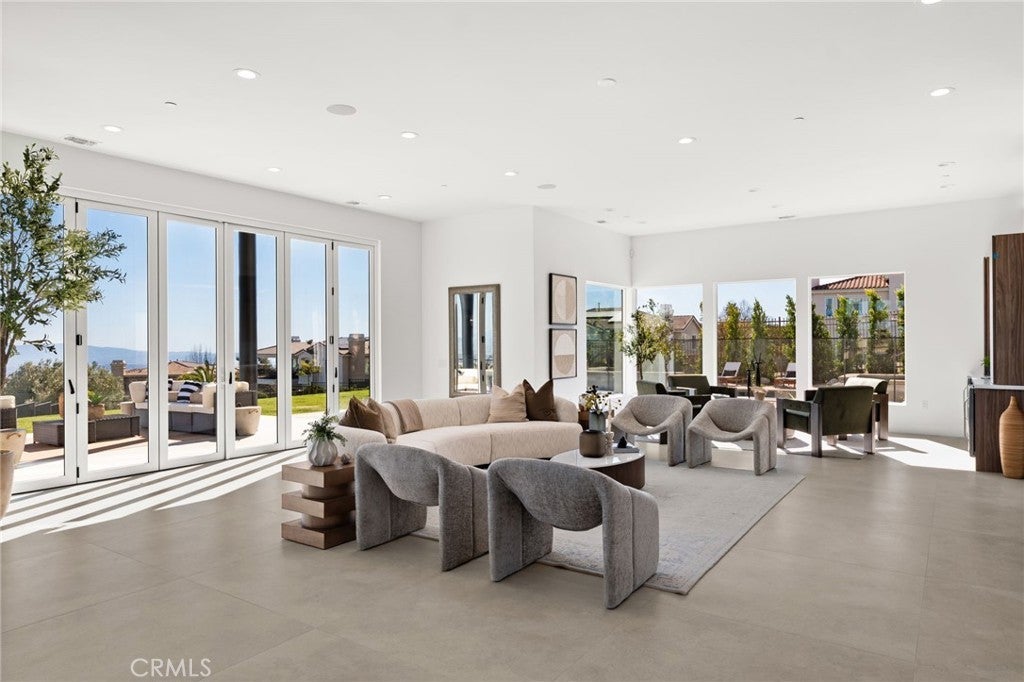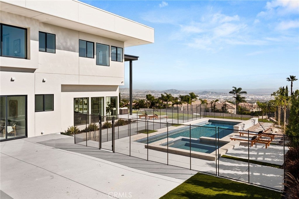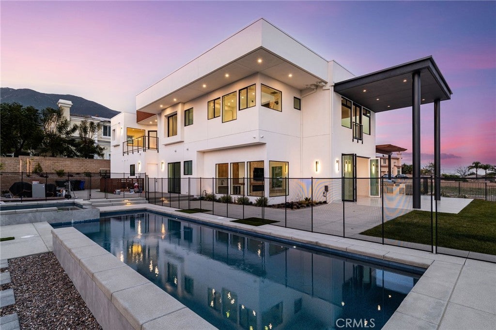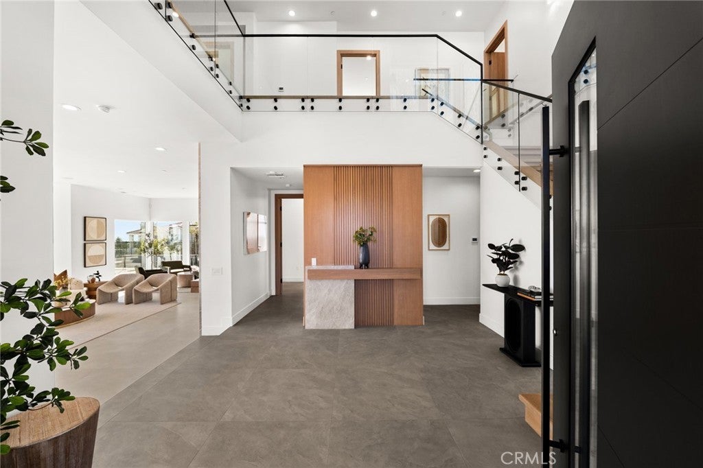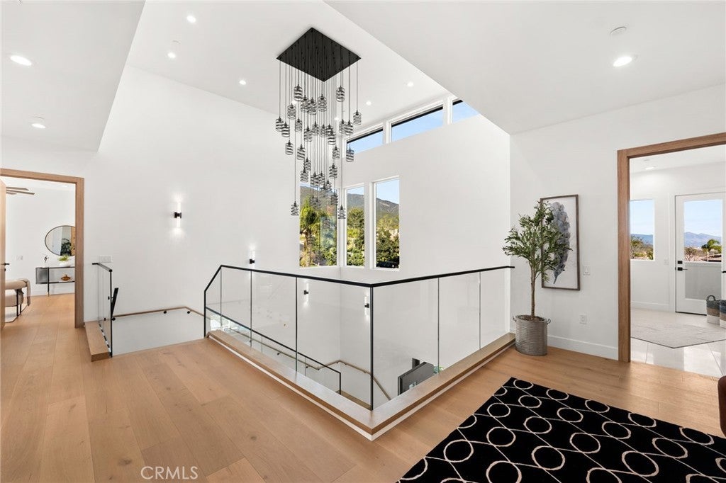 Welcome to The Summit House, an extraordinary modern architectural masterpiece boasting 3,963 square feet of exquisitely crafted living space in the main residence, perched at approximately 2,150 feet above sea level at the end of one of Rancho Cucamonga’s most private and elevated cul-de-sacs. This bespoke estate embodies a seamless fusion of precision engineering, sophisticated design, and elevated lifestyle. A striking 27-foot glass tower and floating portico announce your arrival, opening to a grand foyer defined by soaring ceilings and a sculptural glass staircase. The main living level is anchored by an 18-foot feature wall clad in slab marble with a fireplace, integrated bar, and expansive disappearing glass walls that dissolve the boundary between interior and resort-inspired grounds. Outside, 22-foot steel columns frame a covered patio overlooking a modern pool and elevated spa, meandering water features, a vineyard, orchard, and meticulously manicured lawns — all conceived for privacy, serenity, and visual harmony. The chef’s kitchen is a triumph of design, featuring Italian Stosa cabinetry, a dramatic 12-foot waterfall island, and fully integrated Thermador appliances. The residence offers three gourmet kitchens, opulent en-suite bedrooms, spa-caliber baths with advanced smart technology, and a primary suite with commanding mountain and valley views. An upper-level Sky Residence provides over 950 square feet of private quarters with its own entrance, kitchen, and bath — perfect for guests or extended family. Engineered for ultimate performance, the home is equipped with enterprise-grade networking, integrated security and surveillance, Lutron lighting, Sonos audio, multi-zone HVAC, dual tankless systems, and solar integration. With an approximately 30’ x 40’ finished showroom-style garage and meticulous attention to every detail, The Summit House is the pinnacle of modern architectural sophistication — where artful design meets unparalleled luxury living.