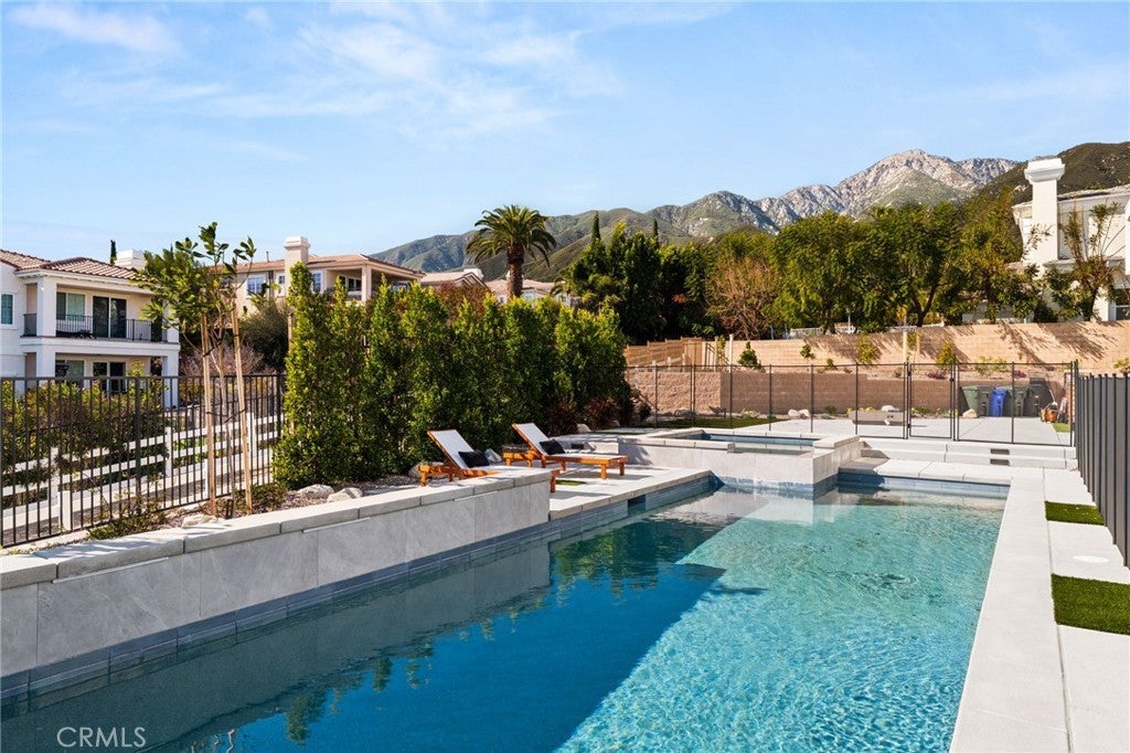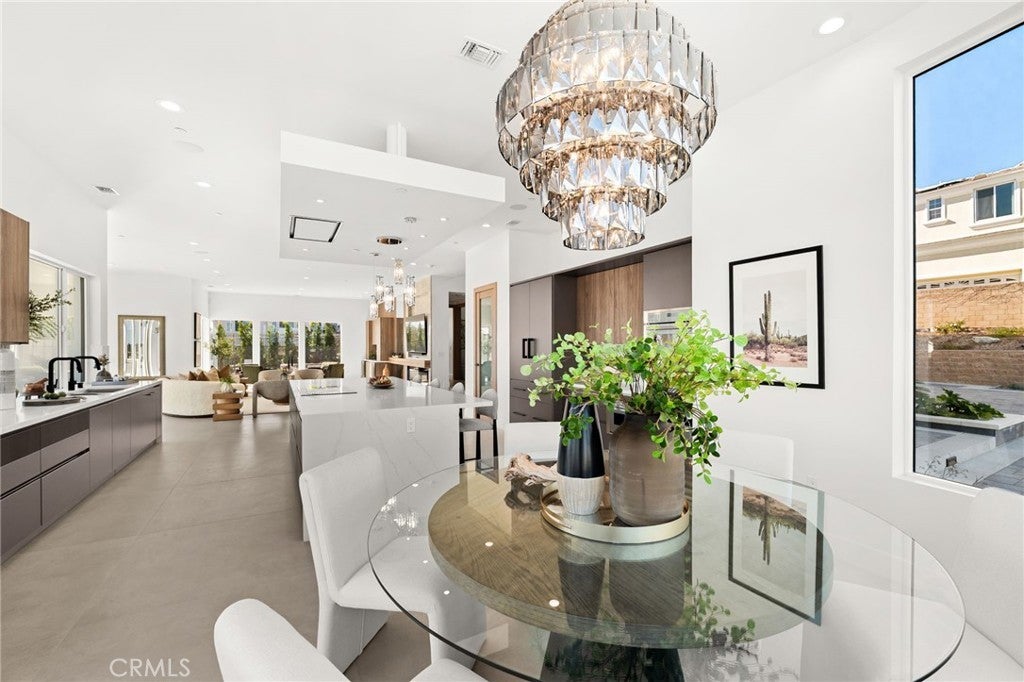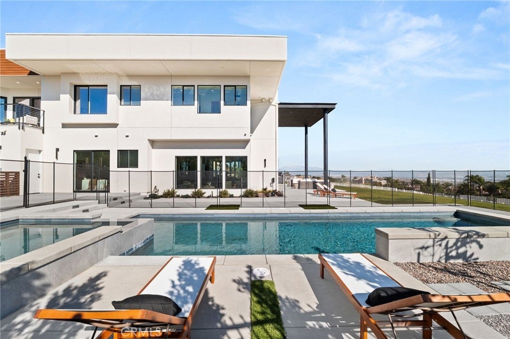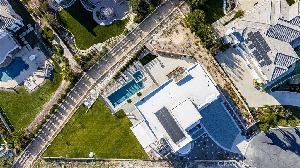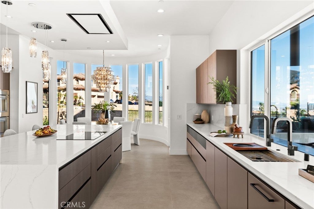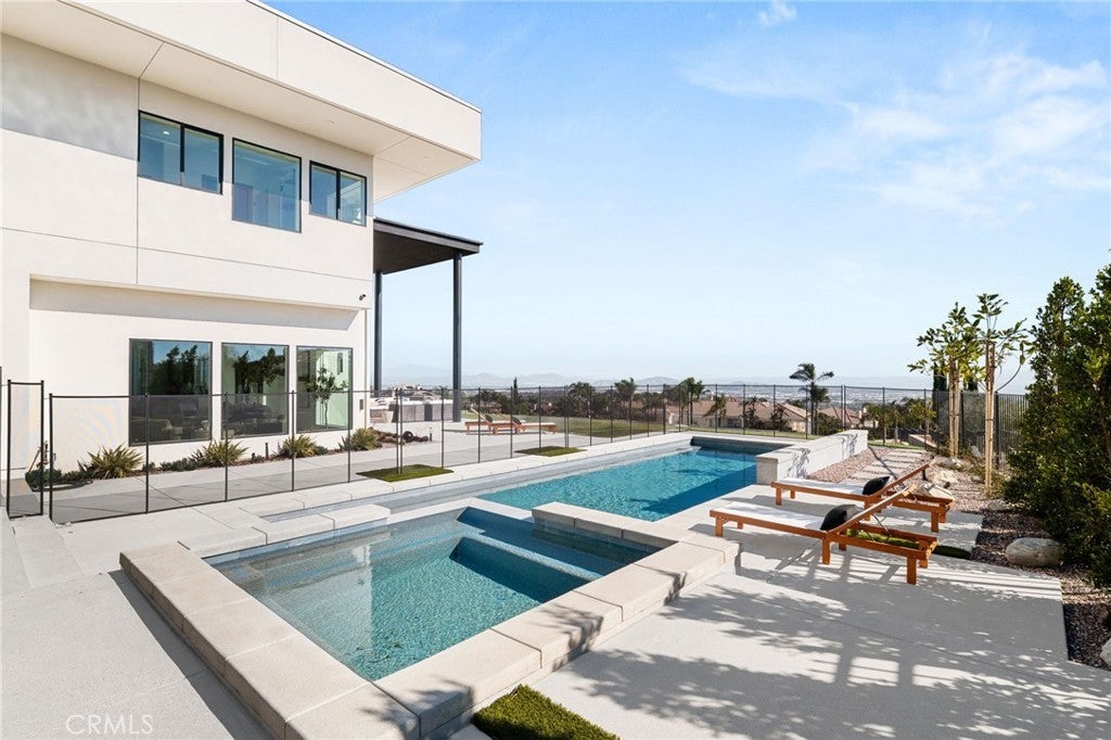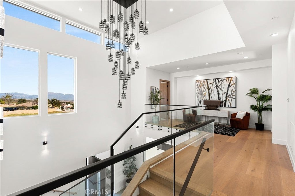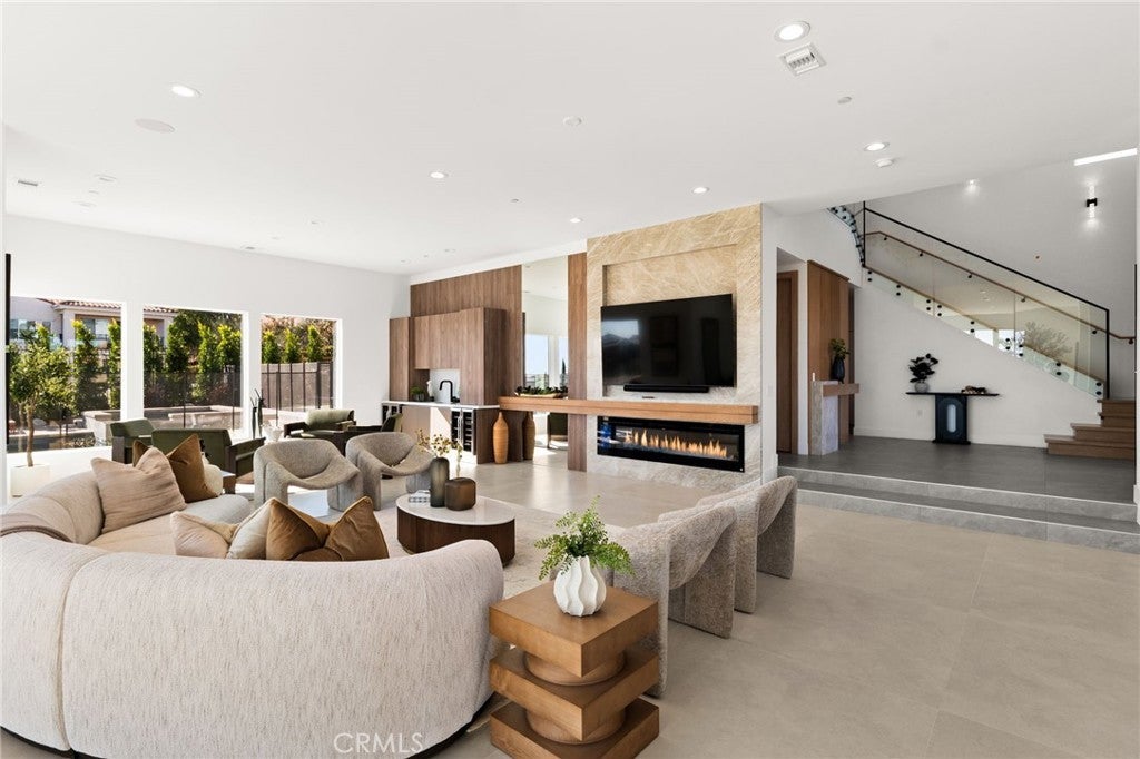 Welcome to The Summit House, an extraordinary modern architectural masterpiece boasting 3,963 square feet of exquisitely crafted living space in the main residence, perched at approximately 2,150 feet above sea level at the end of one of Rancho Cucamonga’s most private and elevated cul-de-sacs. This bespoke estate embodies a seamless fusion of precision engineering, sophisticated design, and elevated lifestyle. A striking 27-foot glass tower and floating portico announce your arrival, opening to a grand foyer defined by soaring ceilings and a sculptural glass staircase. The main living level is anchored by an 18-foot feature wall clad in slab marble with a fireplace, integrated bar, and expansive disappearing glass walls that dissolve the boundary between interior and resort-inspired grounds. Outside, 22-foot steel columns frame a covered patio overlooking a modern pool and elevated spa, meandering water features, a vineyard, orchard, and meticulously manicured lawns — all conceived for privacy, serenity, and visual harmony. The chef’s kitchen is a triumph of design, featuring Italian Stosa cabinetry, a dramatic 12-foot waterfall island, and fully integrated Thermador appliances. The residence offers three gourmet kitchens, opulent en-suite bedrooms, spa-caliber baths with advanced smart technology, and a primary suite with commanding mountain and valley views. An upper-level Sky Residence provides over 950 square feet of private quarters with its own entrance, kitchen, and bath — perfect for guests or extended family. Engineered for ultimate performance, the home is equipped with enterprise-grade networking, integrated security and surveillance, Lutron lighting, Sonos audio, multi-zone HVAC, dual tankless systems, and solar integration. With an approximately 30’ x 40’ finished showroom-style garage and meticulous attention to every detail, The Summit House is the pinnacle of modern architectural sophistication — where artful design meets unparalleled luxury living.