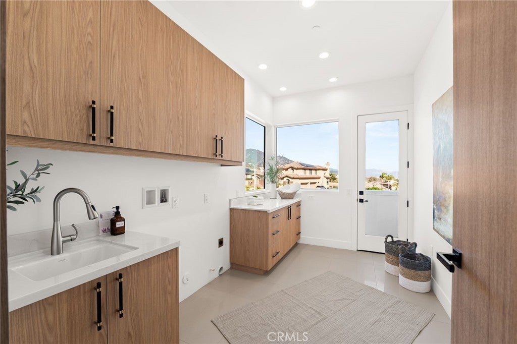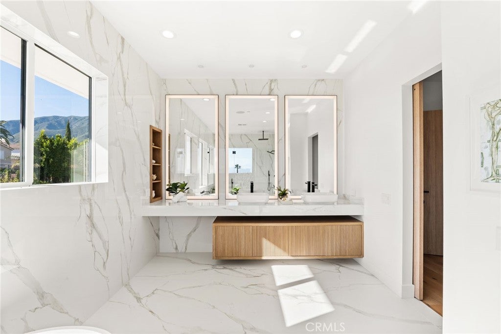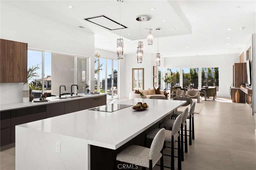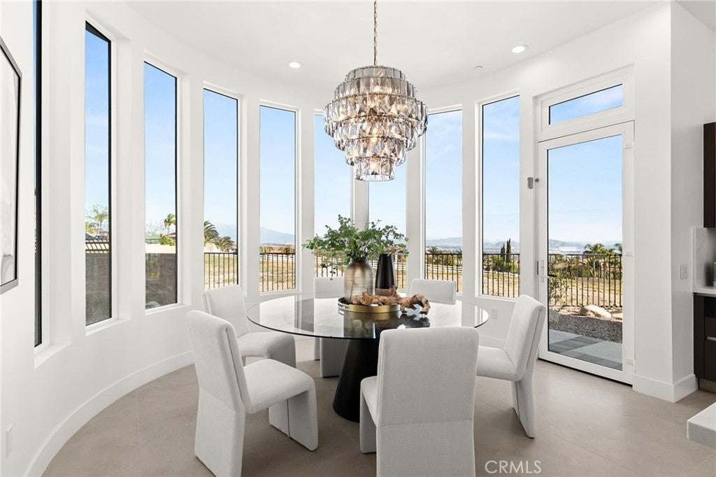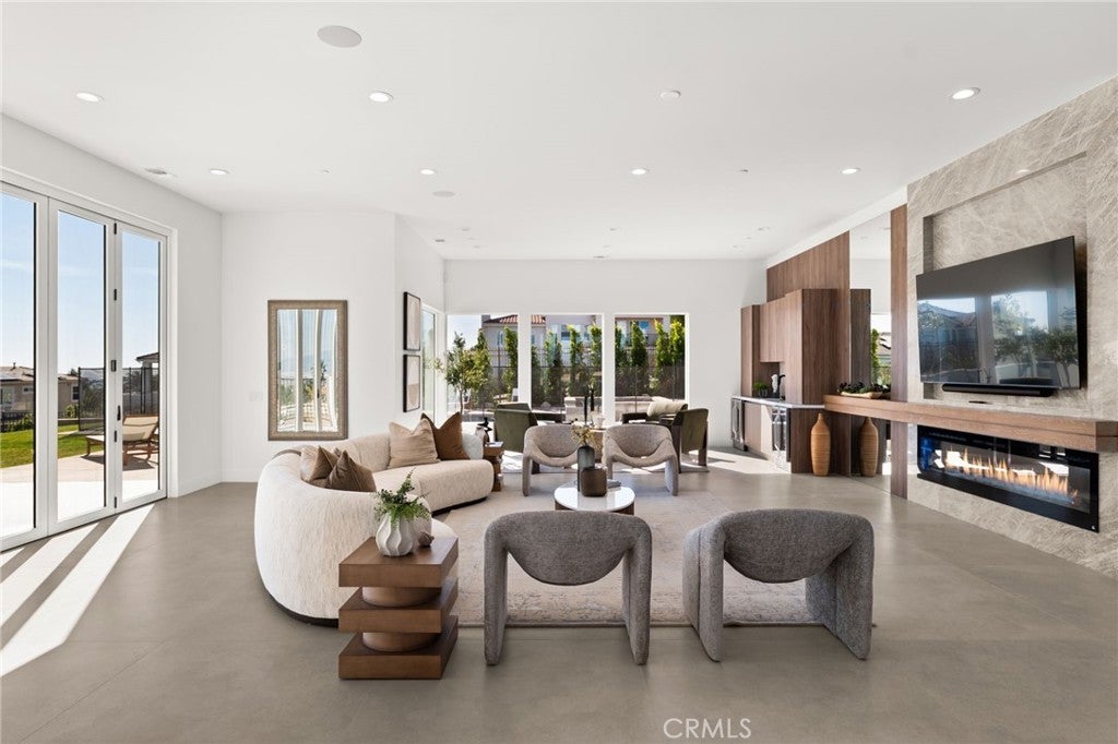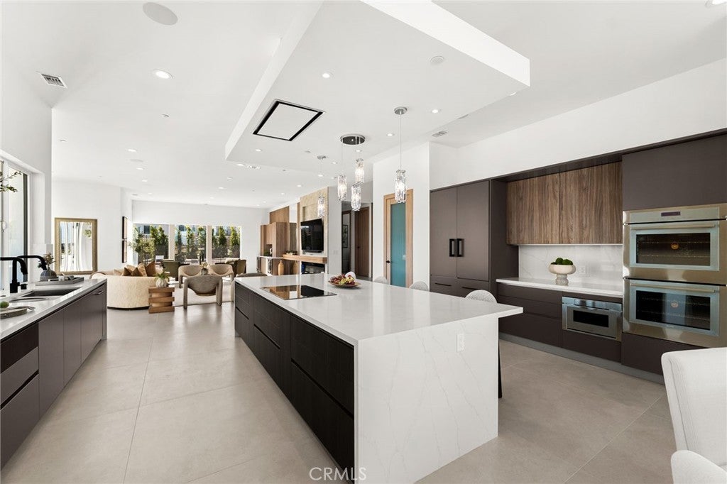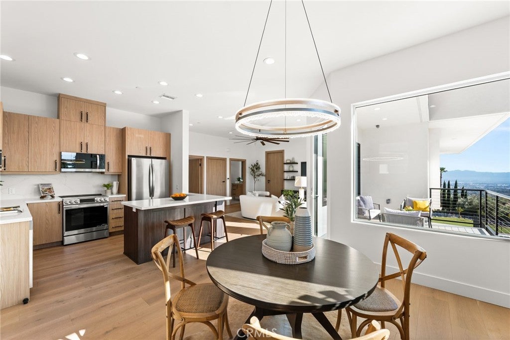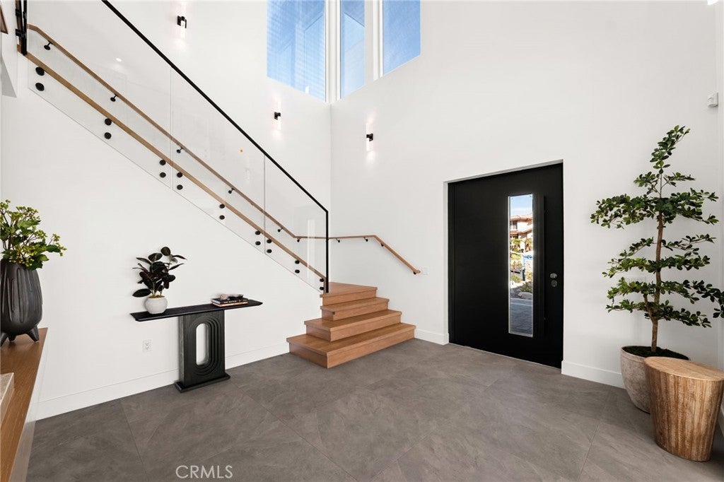 Welcome to The Summit House, an extraordinary modern architectural masterpiece boasting 3,963 square feet of exquisitely crafted living space in the main residence, perched at approximately 2,150 feet above sea level at the end of one of Rancho Cucamonga’s most private and elevated cul-de-sacs. This bespoke estate embodies a seamless fusion of precision engineering, sophisticated design, and elevated lifestyle. A striking 27-foot glass tower and floating portico announce your arrival, opening to a grand foyer defined by soaring ceilings and a sculptural glass staircase. The main living level is anchored by an 18-foot feature wall clad in slab marble with a fireplace, integrated bar, and expansive disappearing glass walls that dissolve the boundary between interior and resort-inspired grounds. Outside, 22-foot steel columns frame a covered patio overlooking a modern pool and elevated spa, meandering water features, a vineyard, orchard, and meticulously manicured lawns — all conceived for privacy, serenity, and visual harmony. The chef’s kitchen is a triumph of design, featuring Italian Stosa cabinetry, a dramatic 12-foot waterfall island, and fully integrated Thermador appliances. The residence offers three gourmet kitchens, opulent en-suite bedrooms, spa-caliber baths with advanced smart technology, and a primary suite with commanding mountain and valley views. An upper-level Sky Residence provides over 950 square feet of private quarters with its own entrance, kitchen, and bath — perfect for guests or extended family. Engineered for ultimate performance, the home is equipped with enterprise-grade networking, integrated security and surveillance, Lutron lighting, Sonos audio, multi-zone HVAC, dual tankless systems, and solar integration. With an approximately 30’ x 40’ finished showroom-style garage and meticulous attention to every detail, The Summit House is the pinnacle of modern architectural sophistication — where artful design meets unparalleled luxury living.