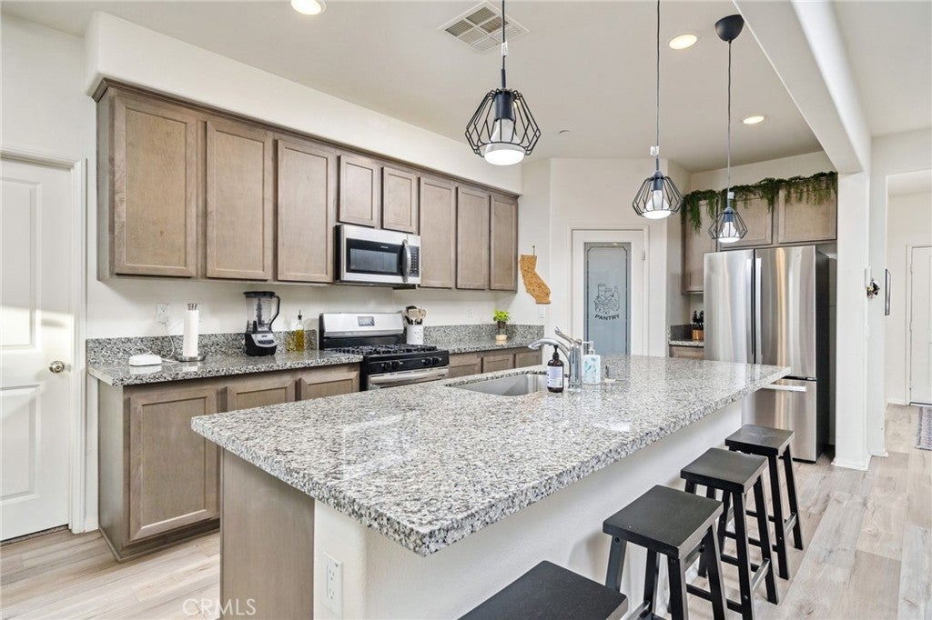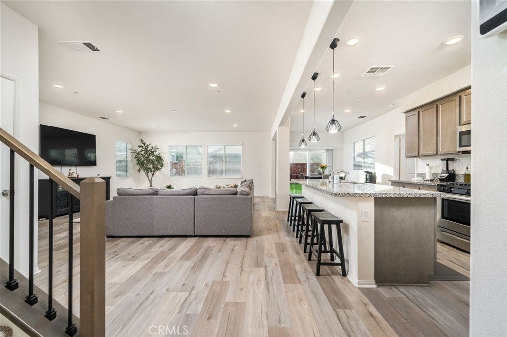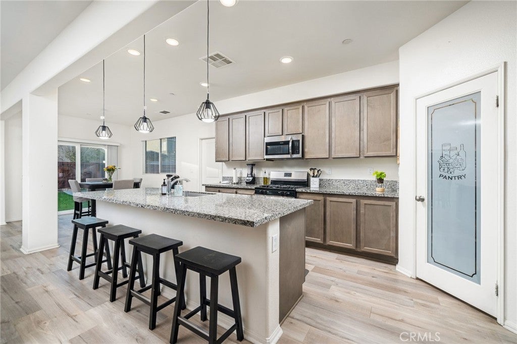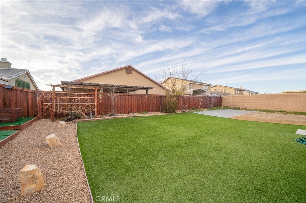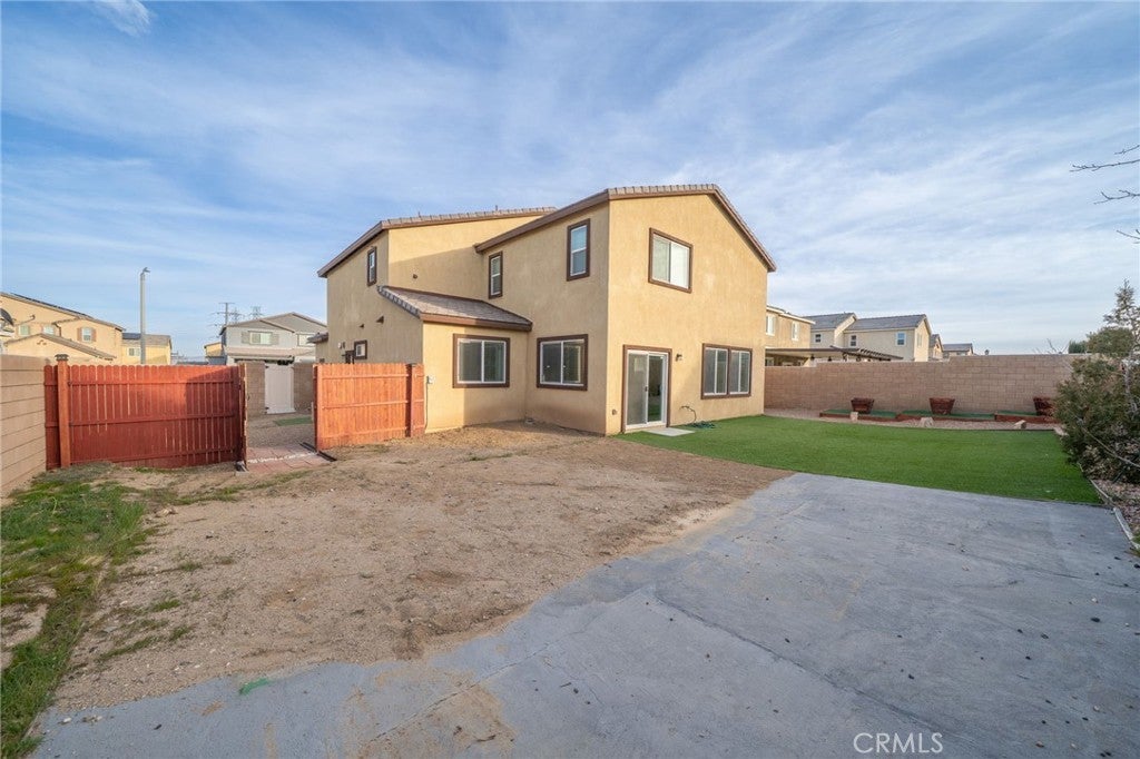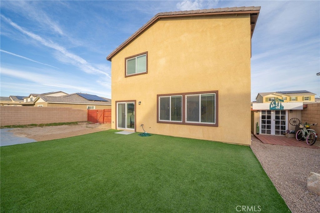 TURN KEY MULTI GENERATIONAL HOME WITH SOLAR IN DIAMOND RIDGE. Built in 2020 by Frontier Homes, this spacious and thoughtfully designed single-family residence offers a blend of modern comfort, functionality, and location. Featuring 5 bedrooms, 4 bathrooms, and approximately 2,915 square feet on a 7,300 square foot lot, this home provides ample room for everyday living and entertaining. A large open-concept great room welcomes you upon entry, seamlessly connecting the kitchen, dining, and living areas. Filled with natural light, this space feels open and inviting. The kitchen features granite countertops, a walk-in pantry, and pendant lighting over a generous island—ideal for meal prep or casual dining. The adjacent dining area makes hosting easy and convenient. Wide plank laminate wood flooring runs throughout the main living areas, offering both style and durability. The home also includes over $11,000 in builder upgrades, including flooring and window coverings. The versatile floorplan includes two downstairs bedrooms—one with an en-suite bathroom—ideal for guests or in-law living. Upstairs, a spacious loft offers flexibility for a media room, workspace, or additional living area. The primary suite features a large walk-in closet and an en-suite bathroom with dual vanities, a separate tub, and shower. Two additional bedrooms and an upstairs laundry room complete the upper level. The backyard is designed for both enjoyment and low maintenance, featuring artificial turf, a large storage shed, and a variety of fruit trees including grapes, pears, figs, peaches, apples, plums, and watermelon. Additional highlights include a two-car attached garage, extended driveway for extra parking, and NO HOA. A solar system at $157 per month helps keep electricity costs low. Ideally located less than one mile from Vista Verde Elementary, under two miles from Silverado High School, and one mile from Mesa Linda Park. Adelanto Marketplace—featuring Stater Bros., Starbucks, Walmart, and more—is just 1.5 miles away.