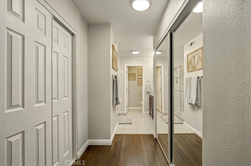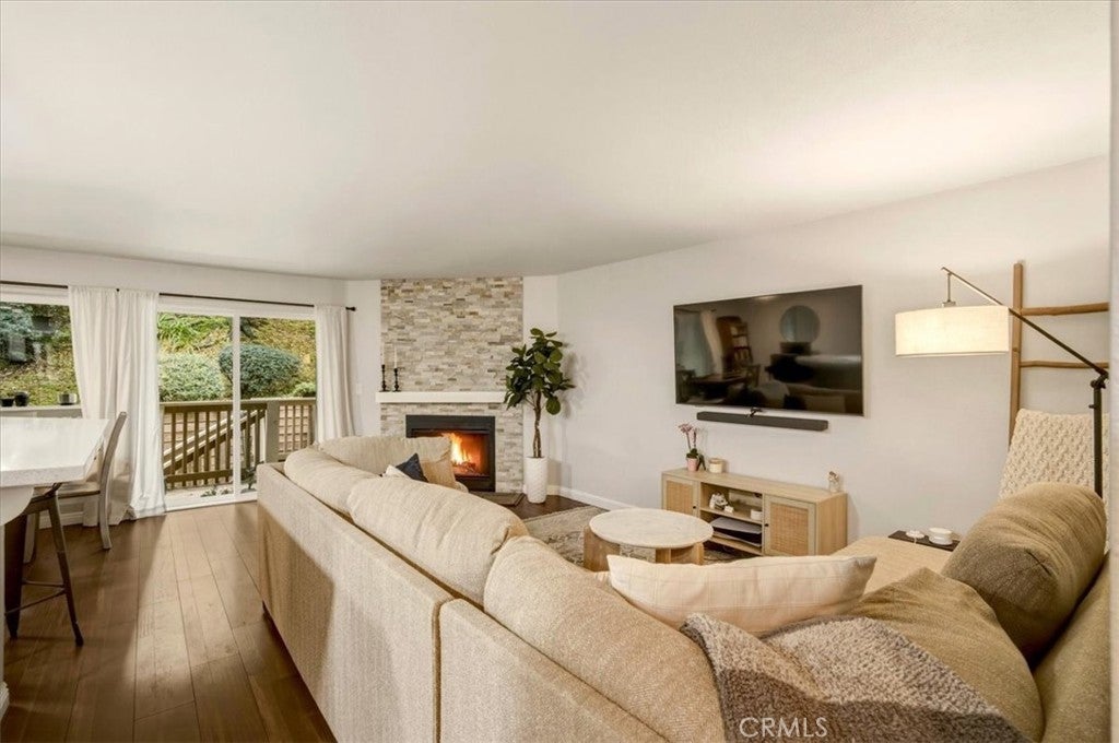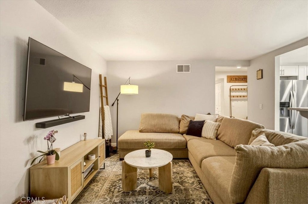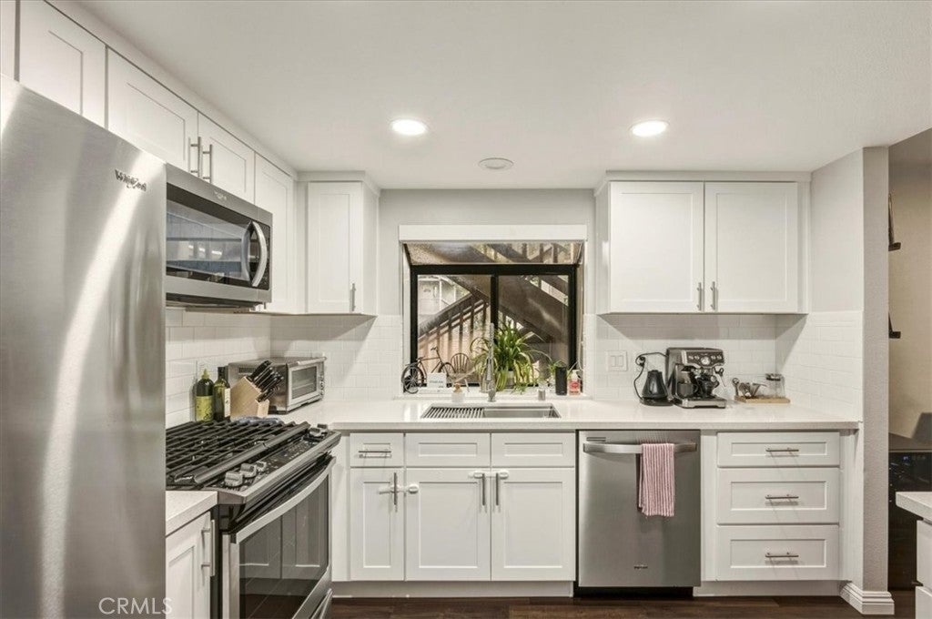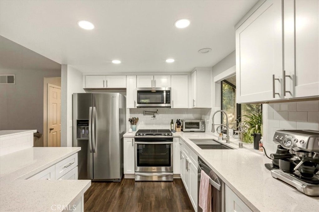Welcome to this beautiful home in a highly sought-after neighborhood. This property features a newer owned Solar system for energy savings and newer energy-efficient windows, offering both comfort and sustainability. This light and bright 2-bedroom, 2-bathroom end-unit condominium offering comfort, style, and thoughtful upgrades throughout. The beautifully updated kitchen features quartz countertops, shaker-style cabinetry, stainless steel appliances, and recessed lighting—perfect for both everyday living and entertaining. Enjoy durable plank flooring that flows seamlessly through the main living areas, along with upgraded bathrooms that provide a modern, refreshed feel. The spacious primary bedroom offers a relaxing retreat, complete with a private en-suite bathroom featuring dual sinks and two closets for ample storage. Additional highlights include an interior laundry area for convenience, fireplace in the living room, dining area is open to the kitchen which has lots of counter space. Step outside to a private back patio with a dedicated storage area plus extra outdoor space to enjoy—with no neighbor directly behind for added privacy. This desirable end unit also includes a 2-car detached garage and offers exceptional community amenities, including a clubhouse, two pools, two spas, playground, and basketball court—making it a wonderful place to call home.