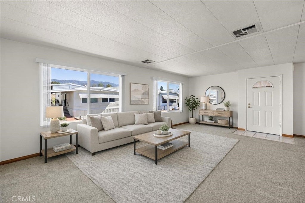 Move-in ready 3-bedroom, 2-bath manufactured home offering 1,440 sq ft of comfortable living space in the desirable 55+ community with LOW SPACE RENT. Originally built in 1970, the home was later remodeled with dual-pane windows, drywall, and added insulation for improved comfort and efficiency. The kitchen features tile flooring, granite countertops, maple cabinetry, and a newer LG refrigerator. A large, front-loading LG washer and dryer set is also included. The home offers clean carpet flooring throughout, along with vertical blinds on all windows. The spacious living room is filled with natural light from two large windows, showcasing beautiful mountain views. The bedrooms include generous closets with mirrored sliding doors. Both bathrooms are updated with tile flooring, granite countertops, and walk-in showers. Additional recent upgrades include a brand-new A/C condenser, all new PEX plumbing, and a brand-new water heater. Outside, enjoy a large, covered porch with an aluminum awning and low-maintenance artificial turf landscaping. Also included is a good-sized shed for storage. Located in a quiet, well-maintained community with extremely LOW SPACE RENT, this home offers great value and easy living. Act quickly!