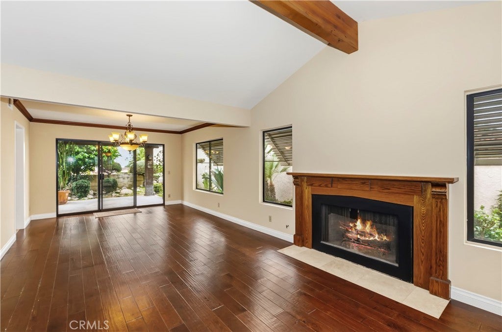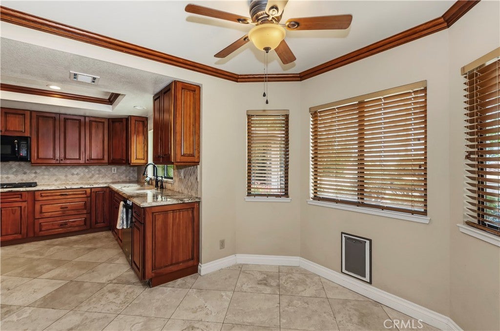 This lovely upscale single story home is located in the highly desired gated community of Villa Montelena in Upland, and sits on a premium corner lot that offers a long driveway with plenty of parking. The overly spacious floorplan is generous in all of its rooms. The secondary bedroom is a primary suite in itself with its’ own private full bath and large sliding doors opening to the central covered courtyard. The family room/den offers an additional adjoining office/library lined with a wall of oak bookshelves, with the rooms being easily converted to 3rd bedroom. The main living room also has views and sliding doors to the courtyard, and offers a beamed ceiling and classy fireplace with massive oak mantle and surround. Dining is a pleasure in the large dining area adorned with wood crown moldings which continue throughout the breakfast area and kitchen. A remodeled kitchen offers beautiful wood cabinetry, granite counters, glistening travertine floors, and SO much storage and counter space! A full, separate laundry room is located off the kitchen and has a sink, cabinets, and folding area. Double doors invite you into the spacious primary suite offering 2 separate closets and a luxurious remodeled bath with oval tub, separate walk in shower with bathing bench and grab bars, and dual vanities with beautiful wood cabinetry and granite counters. Five sets of sliding doors and multiple windows grace the home with plenty of light. The back yard has a covered patio accessible from the primary bedroom plus a 2nd patio area off the dining room, all surrounded by low maintenance vegetation. The community offers ample extra parking, 2 community pools, a tennis court, beautifully maintained grounds, and the comfort of gated security. A lovely home in a beautiful community!