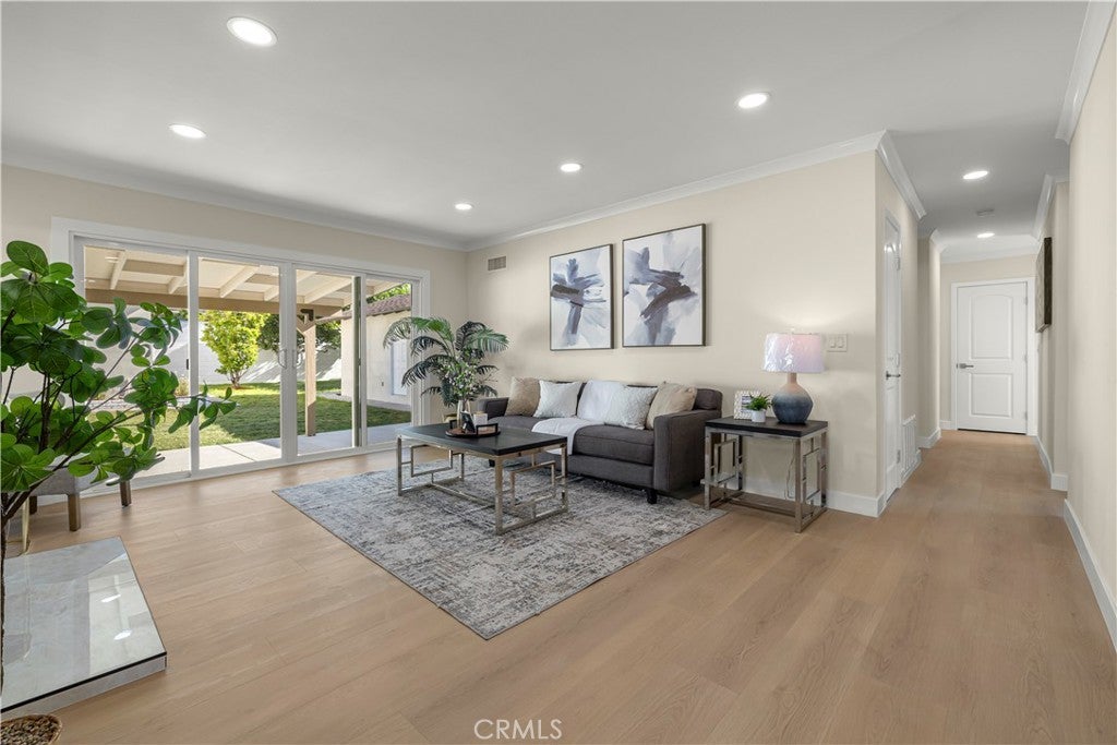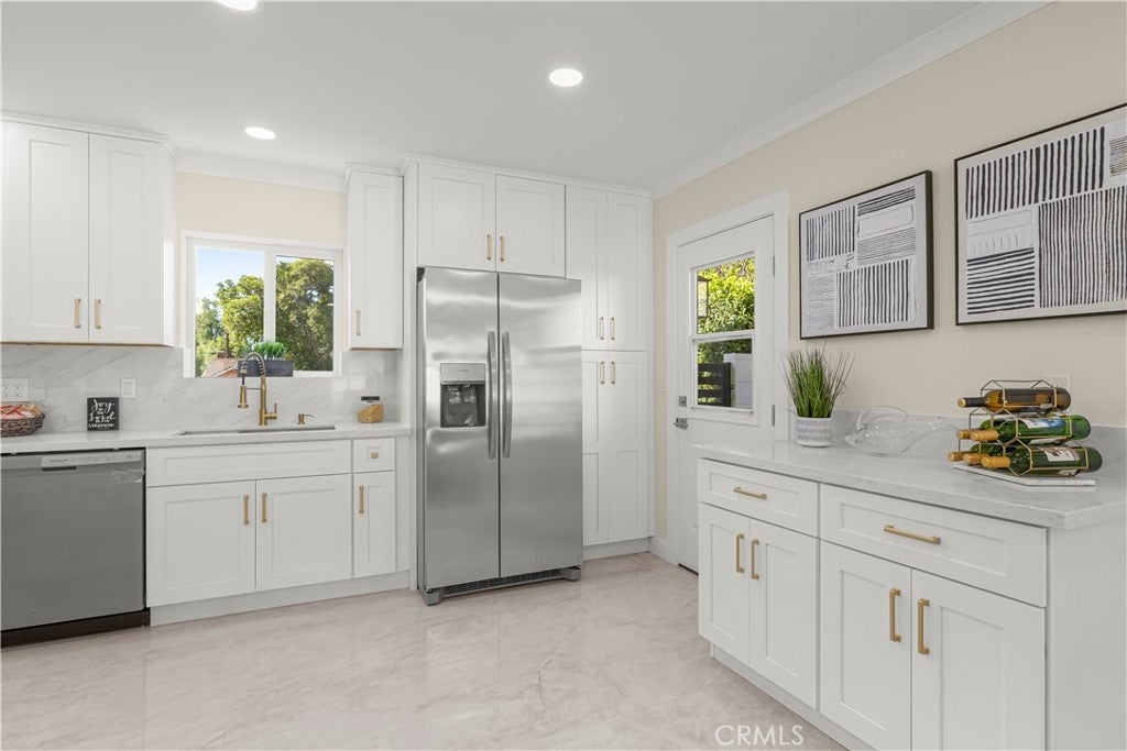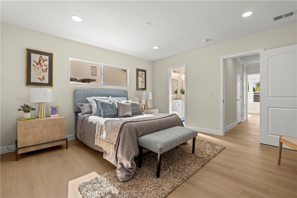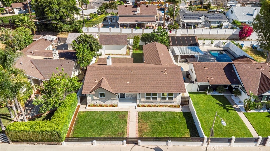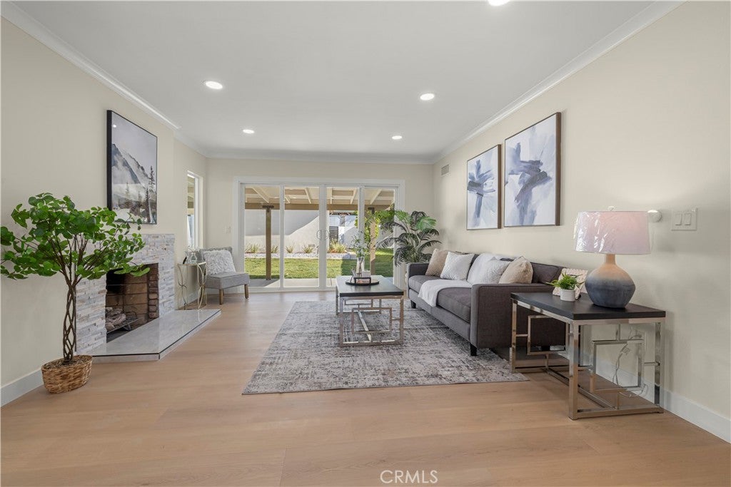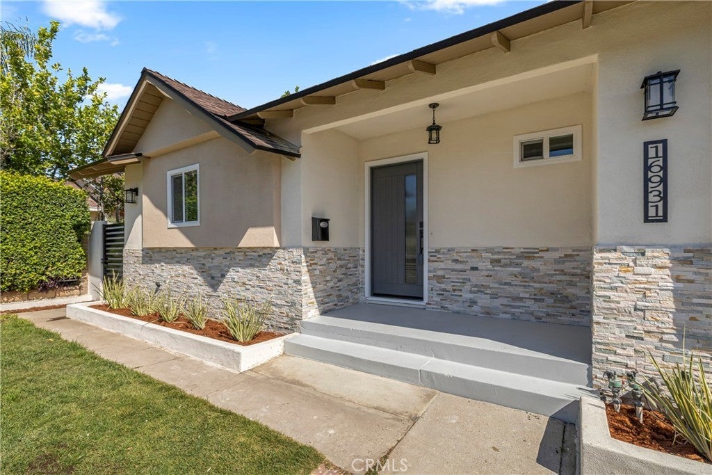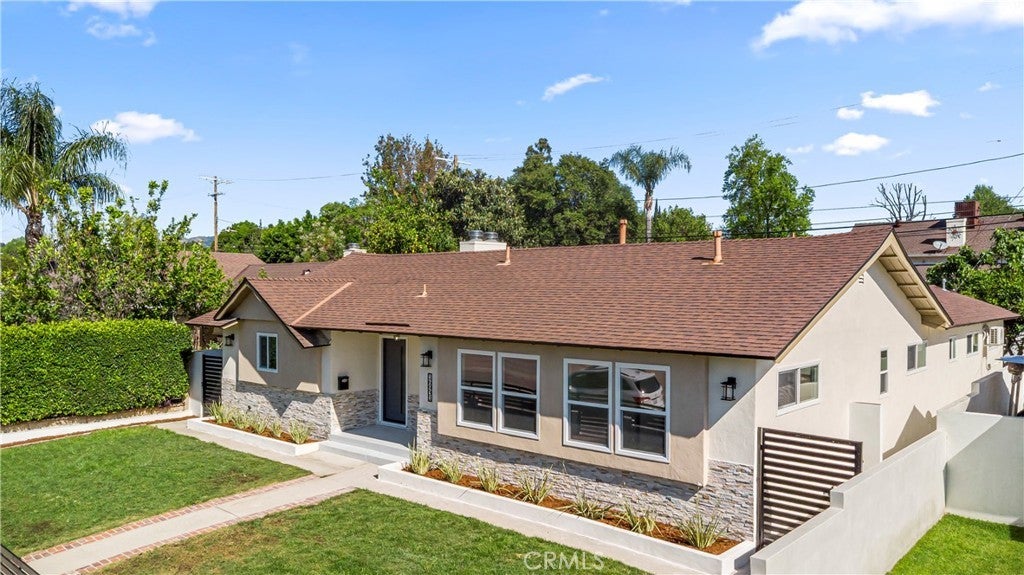 Elegant Reimagined Single-Story Estate with Private ADU in Prime Granada Hills – North of the 118 Freeway. Completely renovated down to the studs, no stone left unturned. The main residence offers approximately 1,700± sq. ft. of refined living space featuring 4 bedrooms and 2 bathrooms, all thoughtfully redesigned with quality materials and attention to detail. The home features a complete electrical overhaul with two new electrical panels. Also included is copper plumbing, central air and heat, and new double-pane vinyl windows for comfort and efficiency. Inside, you’ll find new interior paint, crown molding, new doors throughout the home, custom door hardware, new recessed LED lighting, and high-end luxury vinyl plank flooring. The beautifully redesigned chef’s kitchen showcases all new shaker cabinetry, a large stainless steel farmhouse sink, porcelain tile flooring, and convenient side-entry access, while the fully remodeled bathrooms feature elegant porcelain tile finishes and modern fixtures. The primary suite features a huge walk-in closet, while additional bedrooms include mirrored wardrobe closets. A welcoming fireplace anchors the living space, creating warmth and character. Seamless indoor-outdoor living is highlighted by a dramatic 10-foot sliding glass door to the backyard and double French doors from the dining room leading to the covered patio, perfect for entertaining or relaxing. The exterior has been thoughtfully upgraded with custom two-tone exterior paint, attractive front-yard hardscaping, automatic sprinklers with drip irrigation for planters, and custom designer metal gates at the front, sides, and rear of the property. The backyard is enclosed with durable block walls on the sides and rear, offering added privacy and a clean, finished look. A lush backyard orchard with mature citrus, apple, and fig trees creates a tranquil outdoor setting. A 2-car garage offers potential for a future Jr. ADU conversion. Adding incredible versatility is the private approximately 400 sq. ft. permitted ADU/studio, beautifully finished with its own private entrance, split-unit A/C, full kitchen, full bathroom, walk-in closet, and designer finishes—ideal for guests, extended family, a home office, creative studio, or potential rental income. This turnkey Granada Hills property blends modern elegance, exceptional craftsmanship, and flexible living options, offering a rare opportunity in one of the Valley’s most desirable neighborhoods.