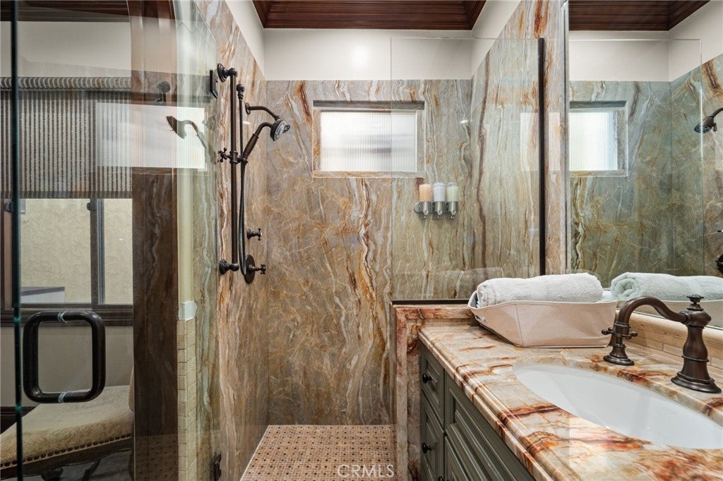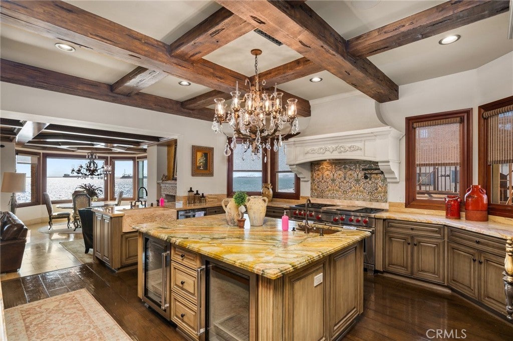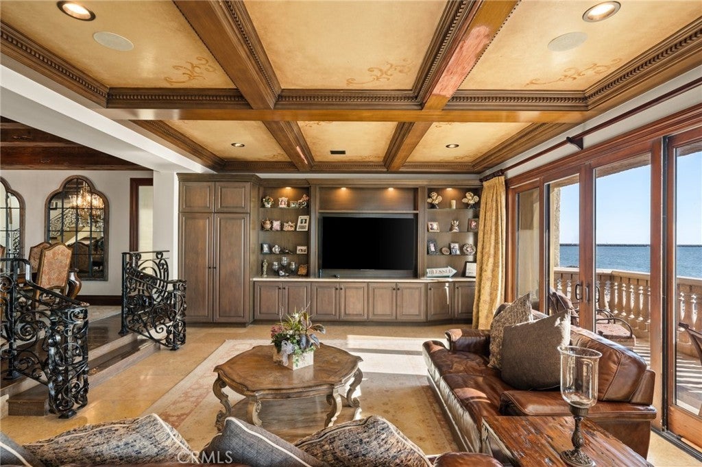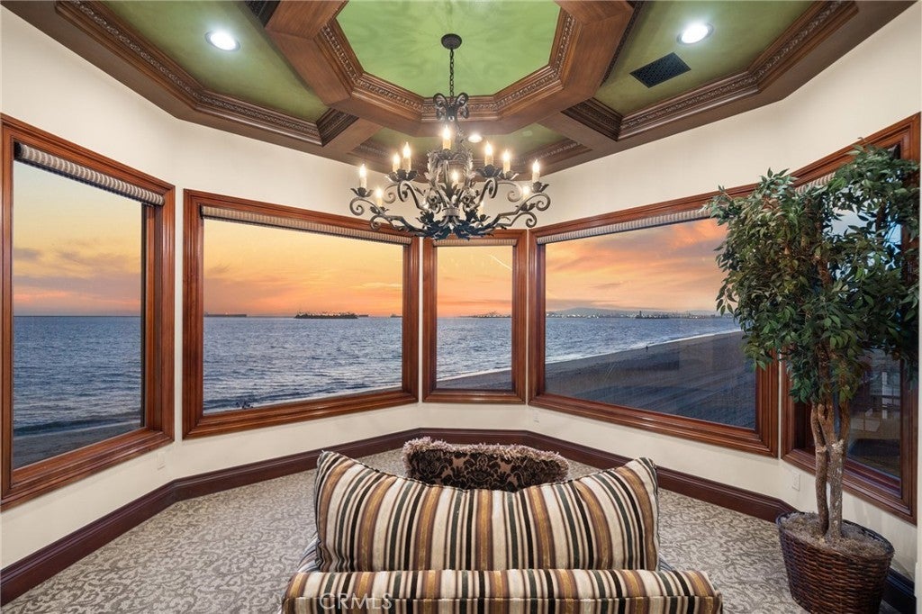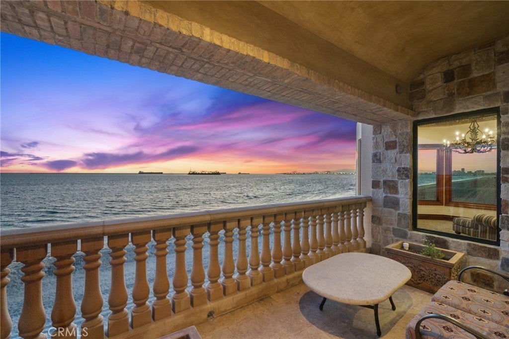 Experience breathtaking ocean views, stunning sunsets, and sparkling city lights from this exclusive beachfront estate. Spanning approximately 6,900 square feet across three levels, this luxurious Long Beach mansion features 6 bedrooms and 8 baths, designed to offer the ultimate in comfort and entertainment. Enjoy panoramic vistas of the coastline, Downtown Long Beach, and Catalina Island. The elegant layout includes a grand entrance with a wrought-iron staircase, a hydraulic elevator, wood beamed cieling, a gourmet kitchen, and an expansive entertainment center. The lavish primary suite boasts a spa-like bathroom, an impressive walk-in closet with a private dressing room, a fireplace, and a balcony overlooking the beach. A state-of-the-art control system allows you to manage lighting, climate, music, and security from your smartphone. The garage accommodates up to six vehicles. No detail was overlooked, with updates including a new roof, windows, stucco, acoustical flooring, copper plumbing, tankless water heaters, onyx countertops, and travertine wood flooring throughout. Additional highlights include mahogany arched doors, a first-floor handicap-accessible bathroom, three balconies, and a private patio. This home is truly in a class of its own.
