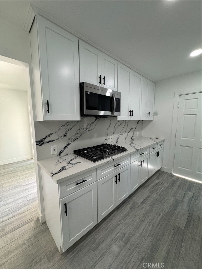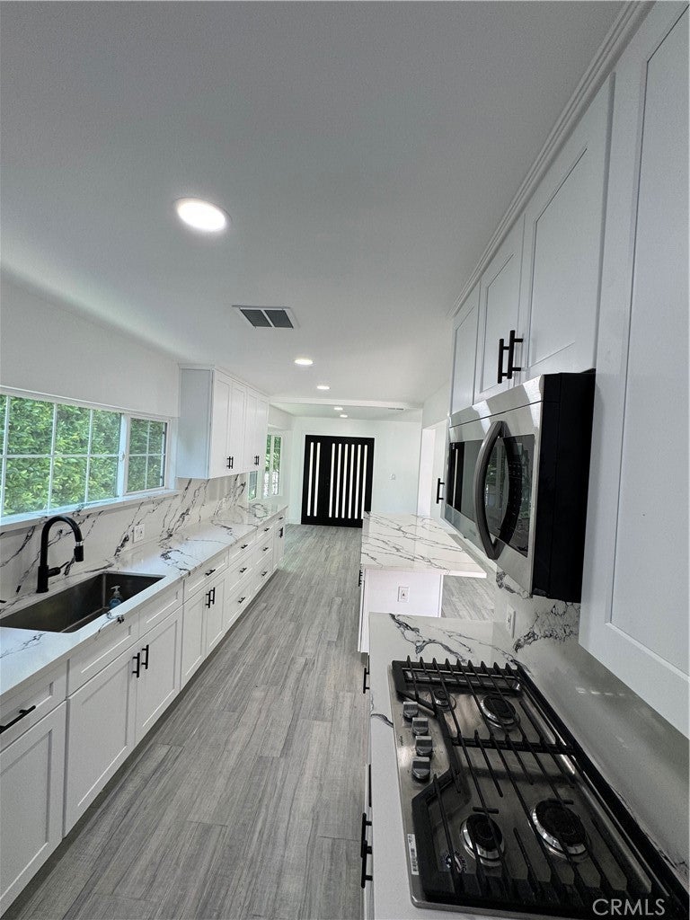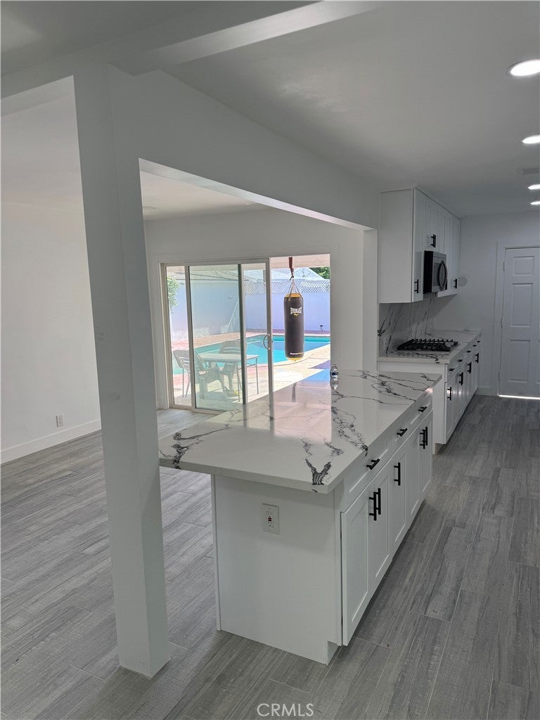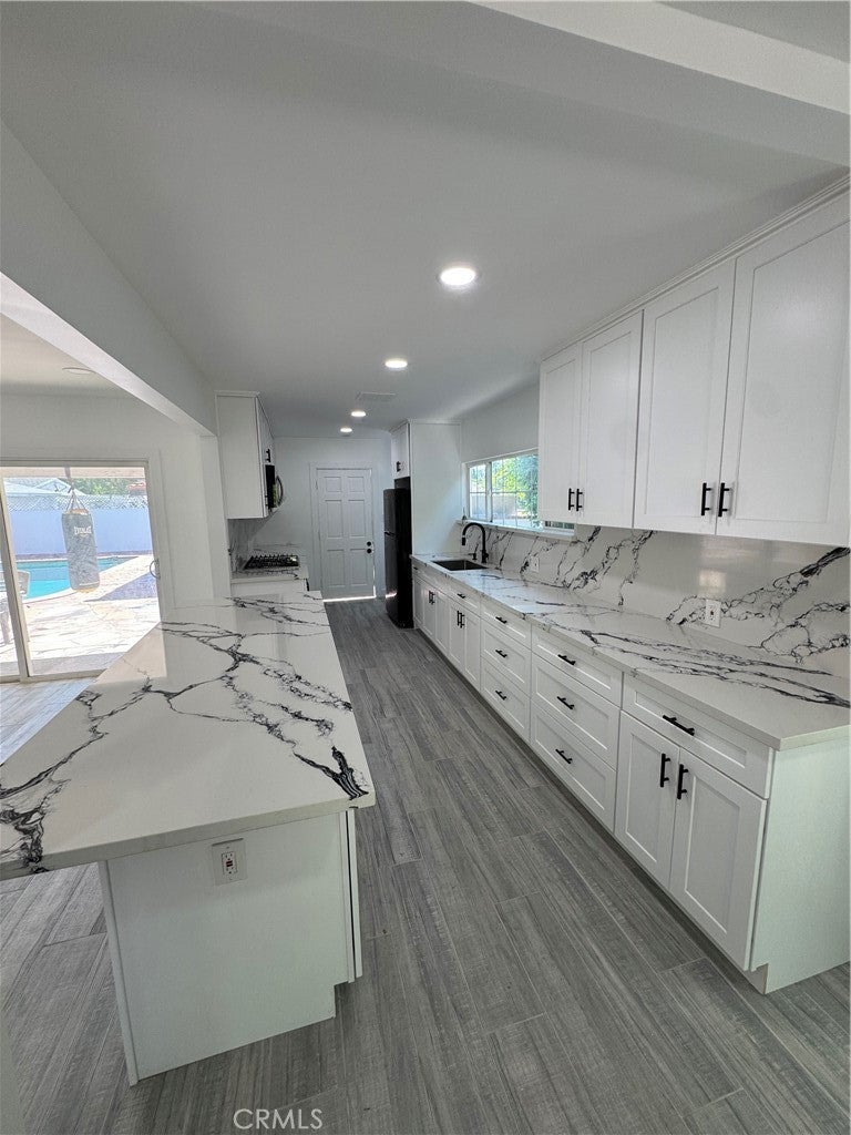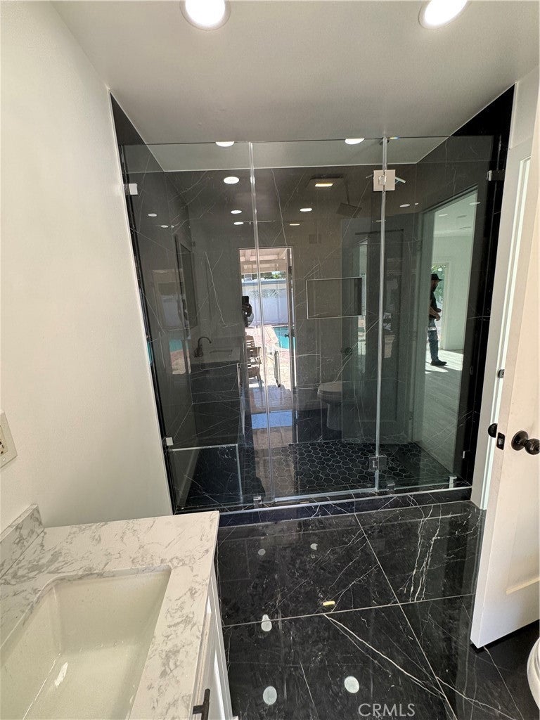 Beautifully remodeled 3-bedroom, 3-bathroom home in the heart of Encino. This single-story property features an open floor plan with an abundance of natural light, wood-look tile flooring, and recessed lighting throughout. The gourmet kitchen offers quartz countertops with striking waterfall edges, custom cabinetry, and modern finishes. All three bathrooms have been tastefully updated with designer tile, glass shower enclosures, and sleek fixtures. The spacious backyard includes a sparkling pool, spa, and covered outdoor bar area, ideal for entertaining. A detached 2-car garage and extended driveway provide ample parking. Located near major shopping centers, dining, and within a well-regarded school district, this turnkey home combines style, comfort, and convenience in a sought-after neighborhood.