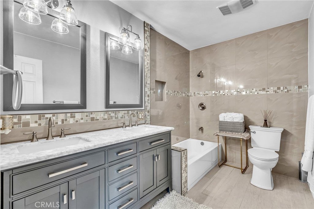 Fully Renovated Baldwin Park Home with Income-Producing ADU! Welcome to this stunning and versatile Baldwin Park property featuring a beautifully updated 3 bed, 3 bath main home (2,668 sq ft plus approx. 300 sq ft finished basement) and a detached 825 sq ft upstairs ADU with 2 bedrooms, 1 bath, and private entrance—perfect for rental income (estimated at $2,200/month), extended family, or guests. Originally built in 1971 and completely renovated in 2020, the main house offers a modern open floor plan with thoughtful upgrades throughout. Enjoy full copper plumbing, an upgraded electrical panel, and new windows that fill the home with natural light. The roof was redone in 2006 for added peace of mind. Additional features include wood flooring, double-door entry, and a gas fireplace in the spacious living room. The gourmet kitchen is a chef’s dream with granite and Corian countertops, a large center island, and high-end stainless steel appliances (stove, fridge, microwave, and dishwasher). A separate dining room adds style and function, while the beautifully landscaped private front yard and serene back patio offer space to relax or entertain. Retreat to the luxurious primary suite featuring a walk-in closet and a spa-like bathroom with his-and-hers sinks. A washer and dryer are also included for convenience. Located in one of the best parts of Baldwin Park, just minutes from scenic biking and hiking trails—this is an incredible opportunity to live in one and rent the other, or enjoy flexible space for multigenerational living.
