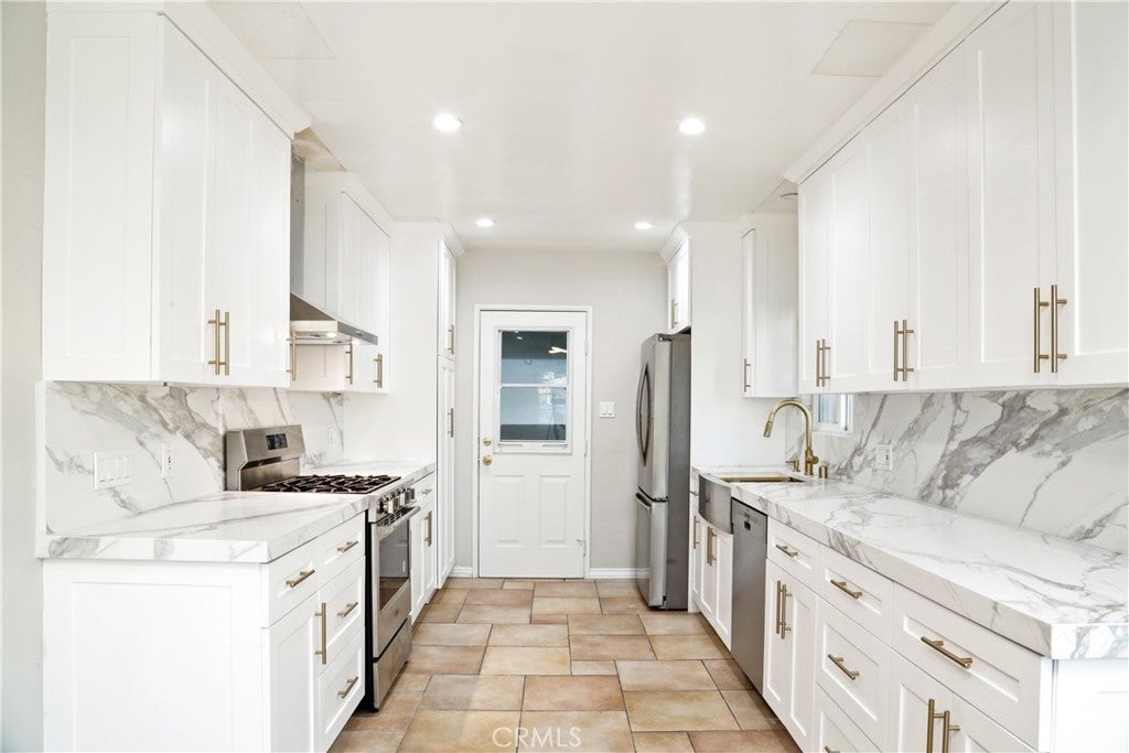 All remodeled 4 bedrooms, 4 bath home in North Downey! Fully remodeled kitchen with new counters, cabinets and stainless steel appliances. Three of the bedrooms have their own en-suite bathroom — all 4 bathrooms are tastefully remodeled. The home has a large living room with fireplace amd spacious dining area in the kitchen. Other features include newer windows, central air and heat, ceiling fans and recessed lighting. The backyard has a covered patio and built in barbecue. Located walking distance to Gallatin Elementary and near the 5 & 605 freeways.