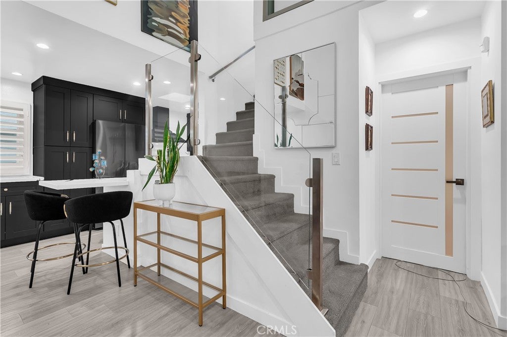 2-story penthouse townhome w/ views nestled in the heart of West Hollywood's Norma Triangle. This comfortable townhome offers the perfect blend of amenities and convenience, boasting 2 bedrooms and 2 bathrooms, each functioning as its own primary suite. Step inside and discover an inviting living space with updated laminate flooring and glass enclosed staircase that adds a modern touch. The vaulted ceiling in the living room adds a sense of grandeur and opens up the space, allowing an abundance of natural light to flow throughout. Other features include ample closet space (3 closets in the downstairs bedroom!), wall of glass in the upstairs bedroom, IN UNIT LAUNDRY, recessed lighting, and plantation shutter window coverings. One of the true highlights of this penthouse is the upstairs private patio, where you can enjoy breathtaking VIEWS of the downtown LA skyline! It's the perfect spot to unwind, entertain guests, or savor your morning coffee as the city comes to life. Convenience is key, with TWO SIDE BY SIDE PARKING SPOTS in the gated underground garage for your vehicles along with extra storage. The building is secure entry with cameras for your peace of mind. Location is everything, and this condo places you within easy reach of all the exciting attractions and amenities that West Hollywood has to offer. Enjoy the city's vibrant nightlife, renowned restaurants, boutiques, and cultural hotspots, all just moments from your doorstep. Community amenities include large pool with lounge chairs and a new workout room. Adding to the appeal, this property boasts VERY LOW HOA DUES that all utilities except for electricity, making it a cost-effective choice for homeowners.