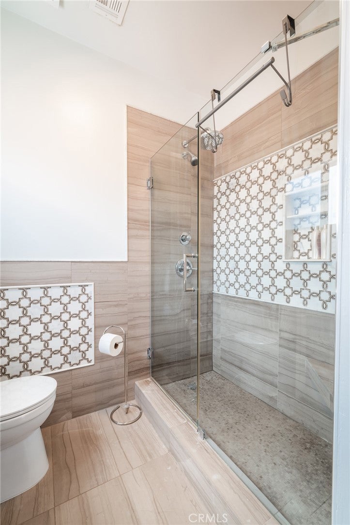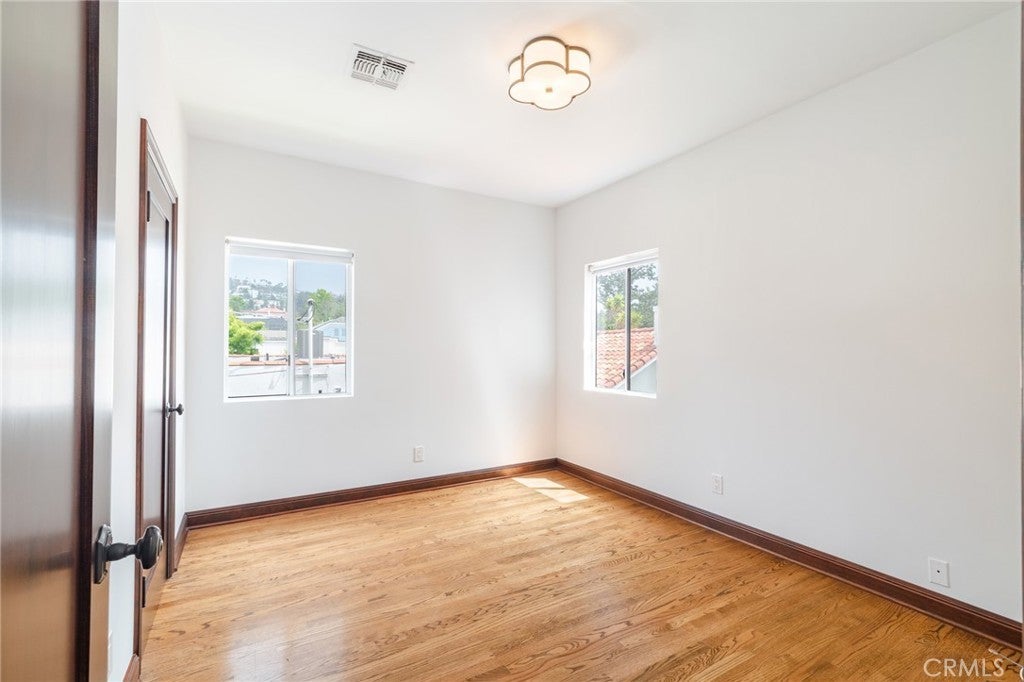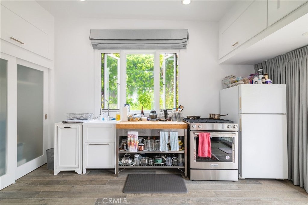 This property is a classic original 1920's character Mediterranean home featuring six bedrooms and five bathrooms, in addition to a fully converted and separate cottage suite suitable for versatile use (mother-in-law apartment or art studio). The home features a modern, earthy, skim coat exterior, an oversize original front door, and a foyer tiled in Walker Zanger marble. The living area boasts a high, arched ceiling, Murano fixtures, an original Batchelder gas fireplace, built-in shelving, and original 3/4 inch hardwood floors. The kitchen includes a central island with a full stove/oven, a separate wall-mounted dual oven, a breakfast nook with built-in storage, ample counter space, and abundant natural light, with all appliances included. The former front porch has been incorporated to create a library/den space with matching oak hardwood floors, custom shelving, and custom front-facing windows. The spacious dining area is highlighted by a custom 128 raindrop blown glass fixture, a large north-facing window, and three skylights. A dedicated family room completes the interior features, including a TV, a bar sink, and handmade wood cabinets.