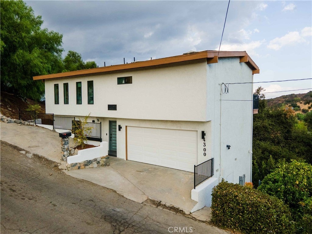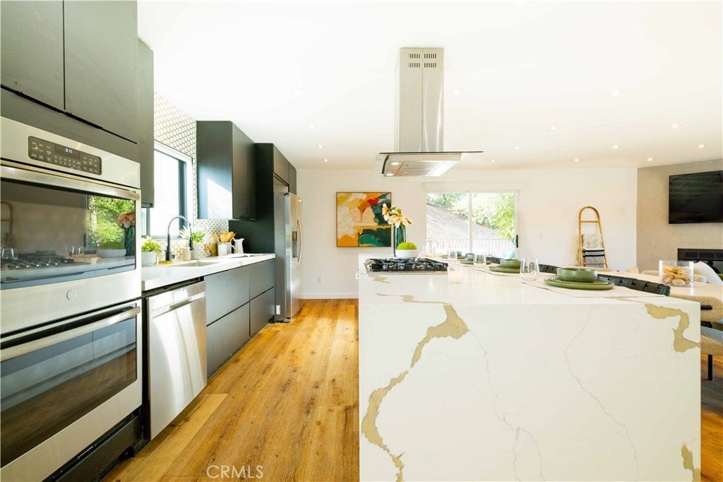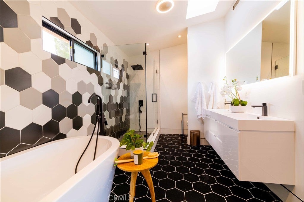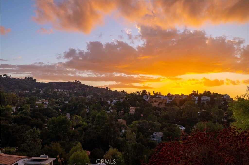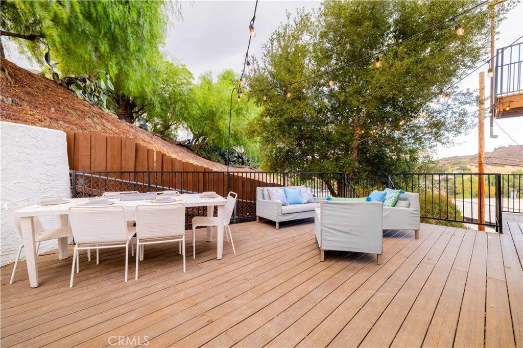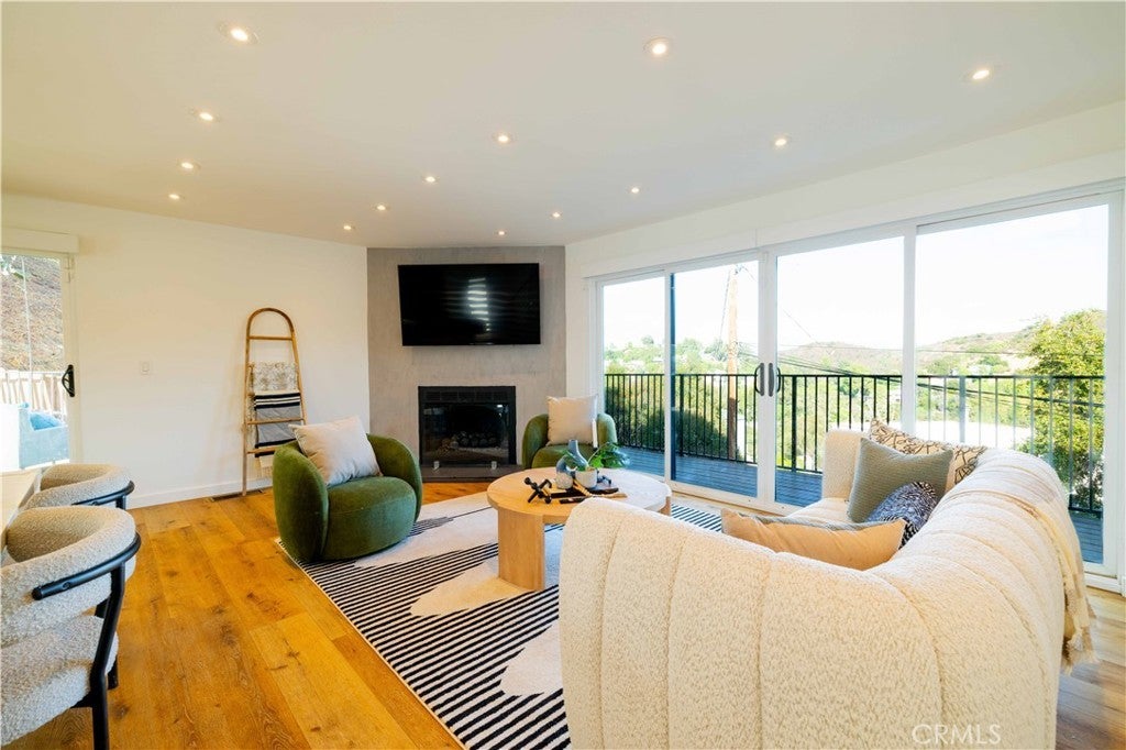 Set above the surrounding landscape with sweeping views of the Santa Monica Mountains, this thoughtfully redesigned Woodland Hills home blends architectural character with modern sophistication. Offering approximately 1,878 square feet, the home features 4 bedrooms and 2.5 bathrooms, highlighted by exposed beams, expansive black-framed windows, and abundant natural light throughout. The main living space is anchored by a designer kitchen with black and white two-tone cabinetry, quartz countertops, waterfall island seating for six, under-cabinet lighting, and stainless steel appliances including a double oven. A custom quartz dining table crafted from the same slab as the island creates a seamless, cohesive entertaining experience. The adjacent living room centers around a fireplace framed by a custom concrete accent wall. Indoor-outdoor living is a defining feature of the home, with three Trex decks positioned to capture panoramic mountain views, ideal for entertaining or quiet evenings at sunset. The primary suite serves as a private retreat, featuring a spacious walk-in closet with custom built-ins and skylight, plus a spa-inspired bath with hexagon tile flooring, floating dual vanity, oversized walk-in shower, and standalone soaking tub. LED backlit mirrors enhance all bathrooms. Energy-efficient split-system HVAC provides year-round comfort. Upstairs, a versatile loft/study space overlooks dramatic vistas, ideal for a home office or creative retreat. The property includes mature fruit trees like pomegranate, lemon, orange, and apple along with generous outdoor space. An attached two-car garage and additional parking for up to six vehicles offer rare convenience for the area. Located near Woodland Hills Country Club, Serenia Park, and extensive green space, this residence offers elevated Valley living with refined design and modern functionality.