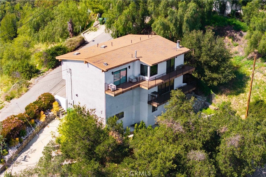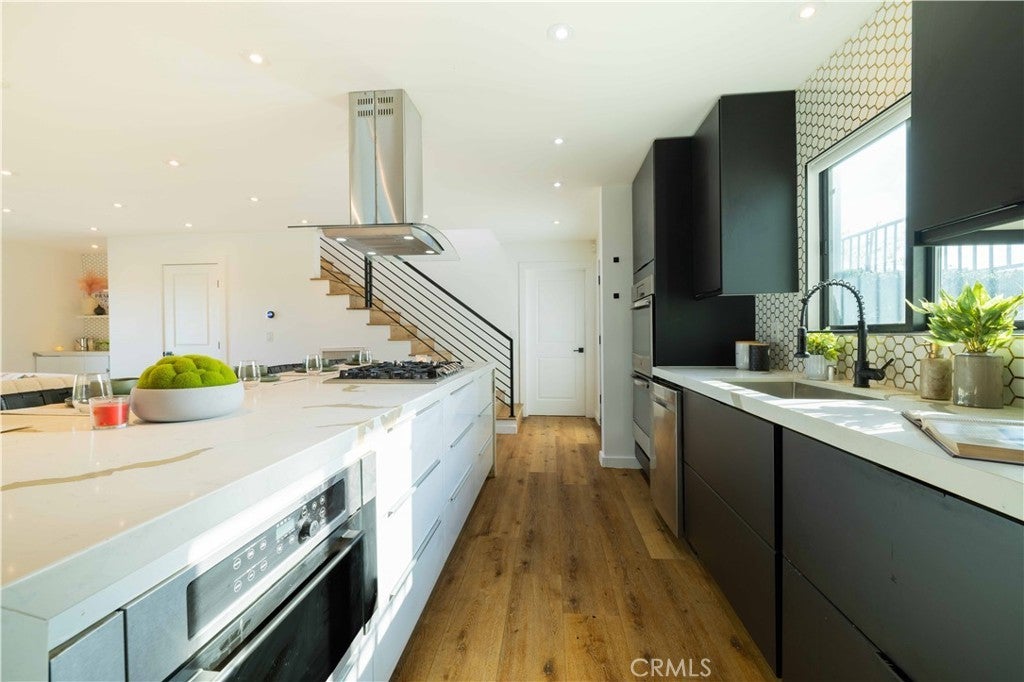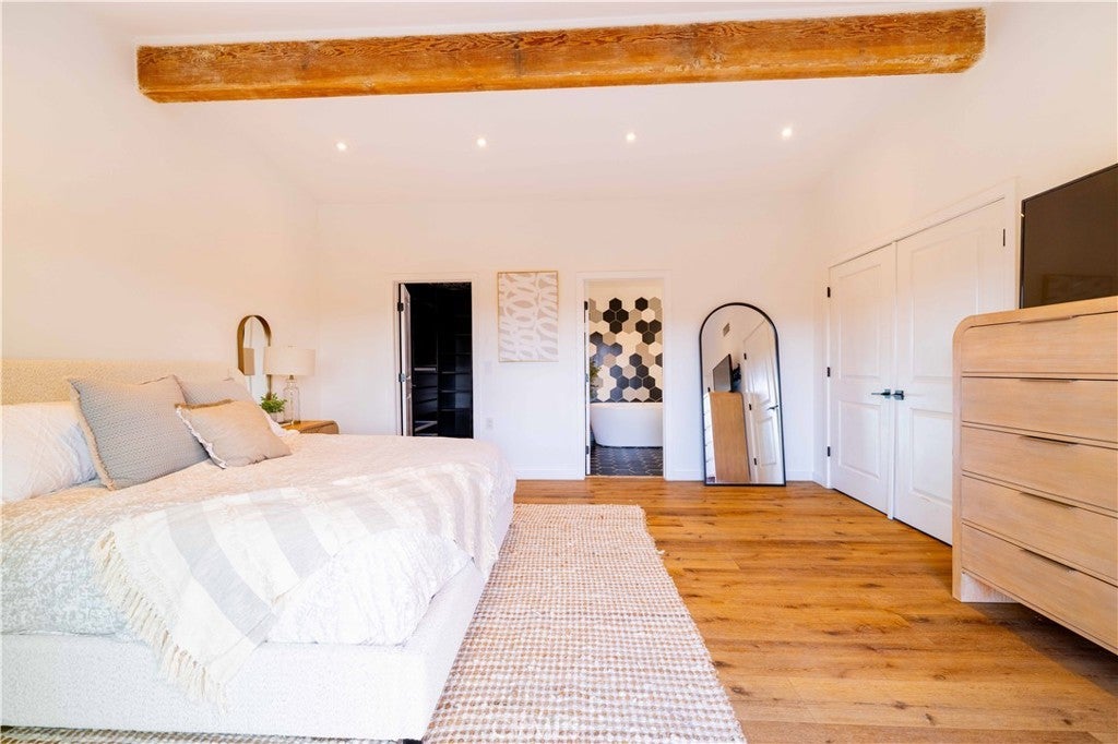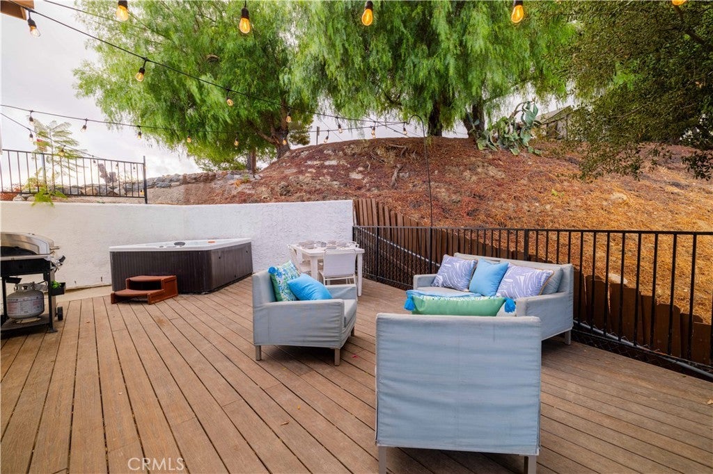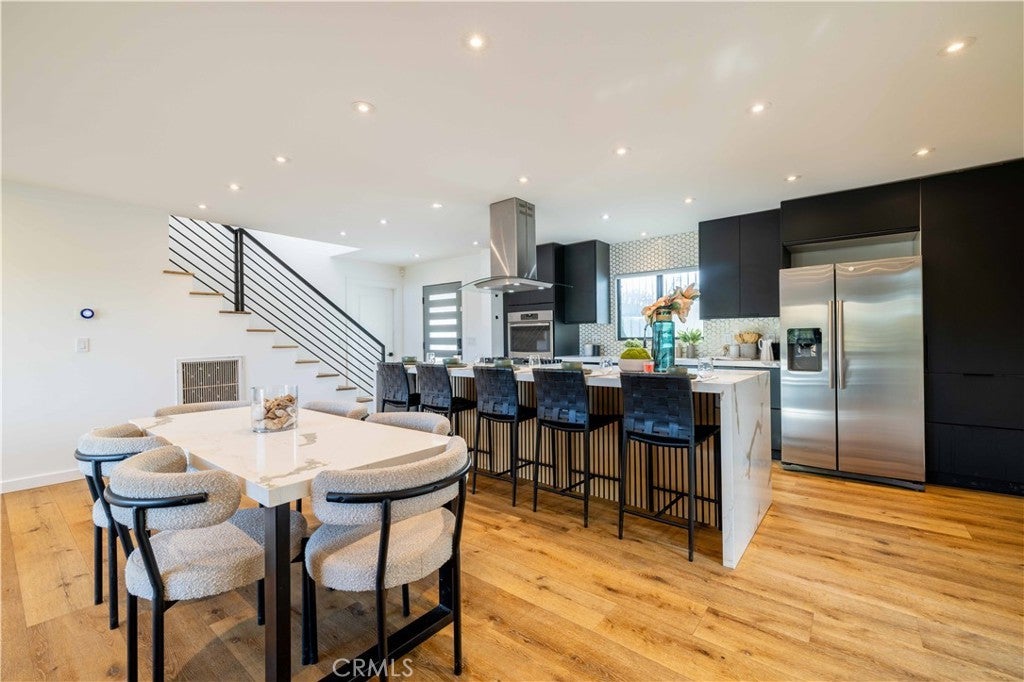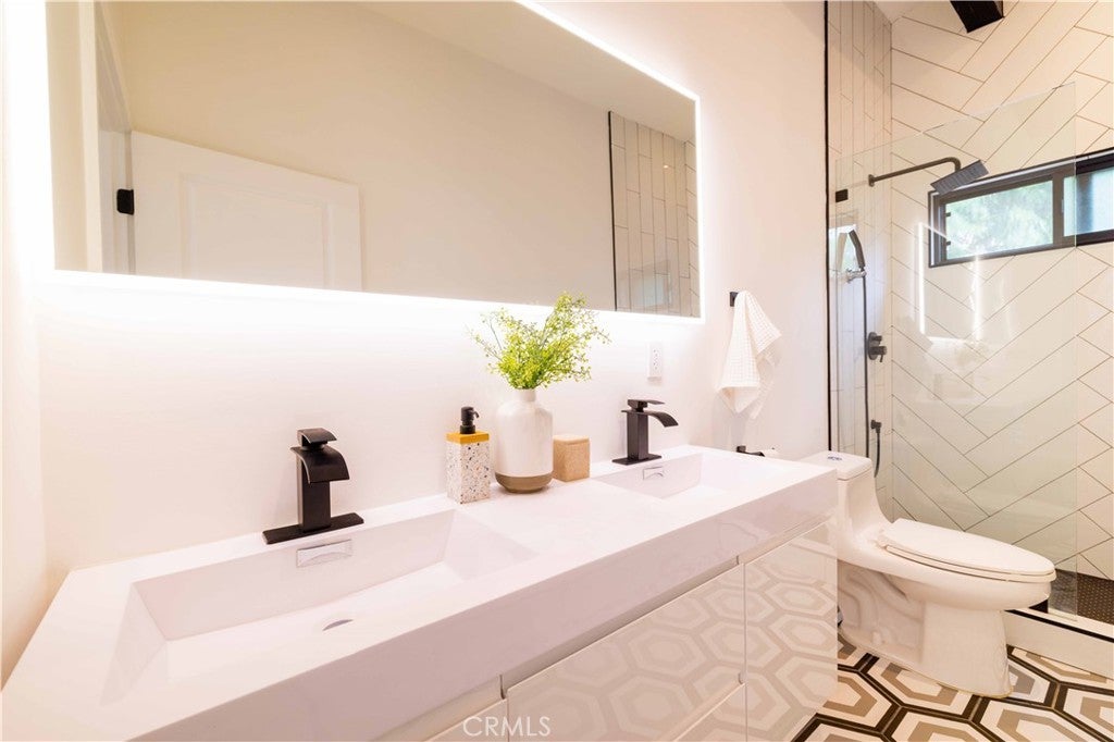 Set above the surrounding landscape with sweeping views of the Santa Monica Mountains, this thoughtfully redesigned Woodland Hills home blends architectural character with modern sophistication. Offering approximately 1,878 square feet, the home features 4 bedrooms and 2.5 bathrooms, highlighted by exposed beams, expansive black-framed windows, and abundant natural light throughout. The main living space is anchored by a designer kitchen with black and white two-tone cabinetry, quartz countertops, waterfall island seating for six, under-cabinet lighting, and stainless steel appliances including a double oven. A custom quartz dining table crafted from the same slab as the island creates a seamless, cohesive entertaining experience. The adjacent living room centers around a fireplace framed by a custom concrete accent wall. Indoor-outdoor living is a defining feature of the home, with three Trex decks positioned to capture panoramic mountain views, ideal for entertaining or quiet evenings at sunset. The primary suite serves as a private retreat, featuring a spacious walk-in closet with custom built-ins and skylight, plus a spa-inspired bath with hexagon tile flooring, floating dual vanity, oversized walk-in shower, and standalone soaking tub. LED backlit mirrors enhance all bathrooms. Energy-efficient split-system HVAC provides year-round comfort. Upstairs, a versatile loft/study space overlooks dramatic vistas, ideal for a home office or creative retreat. The property includes mature fruit trees like pomegranate, lemon, orange, and apple along with generous outdoor space. An attached two-car garage and additional parking for up to six vehicles offer rare convenience for the area. Located near Woodland Hills Country Club, Serenia Park, and extensive green space, this residence offers elevated Valley living with refined design and modern functionality.
