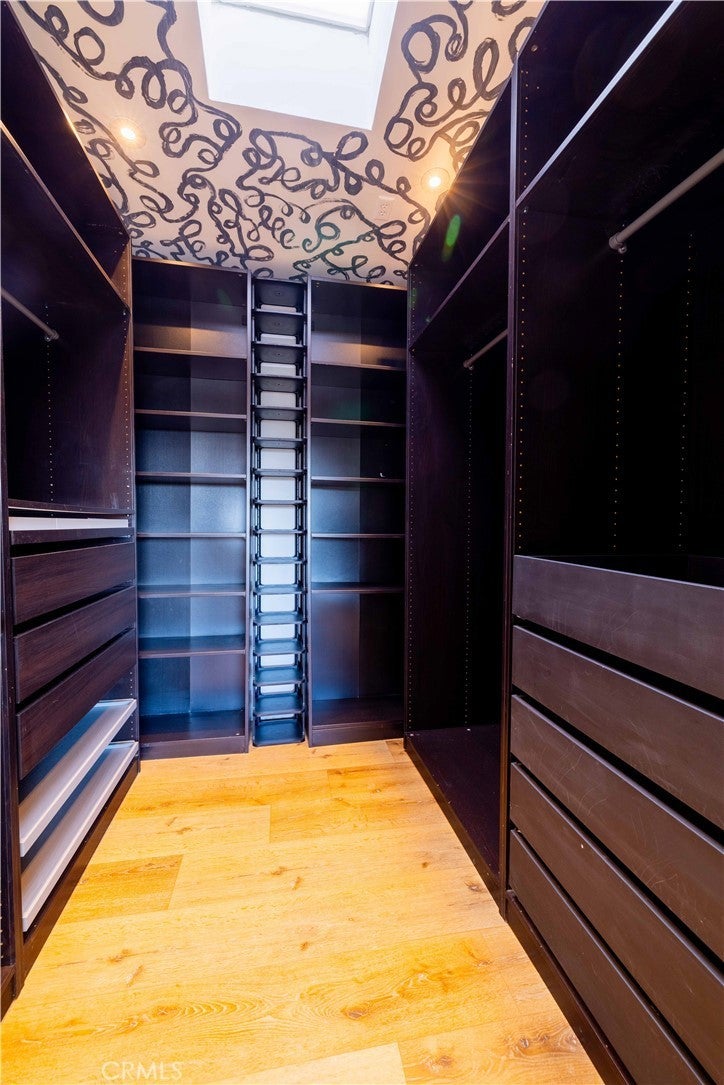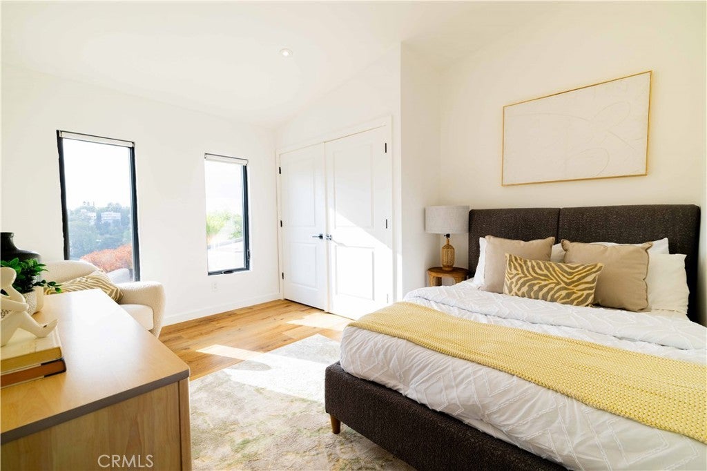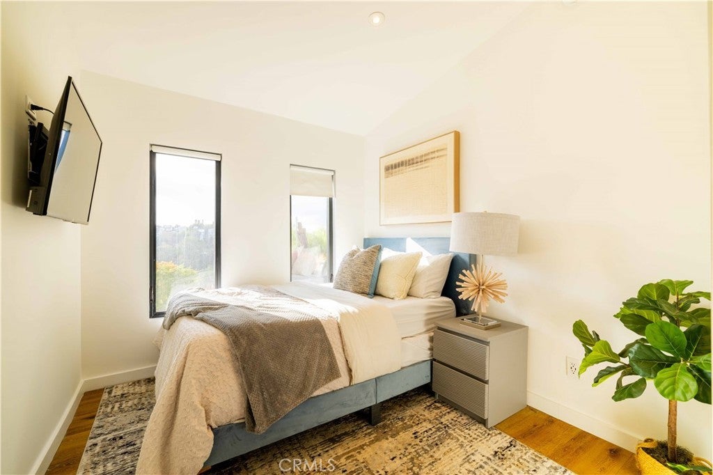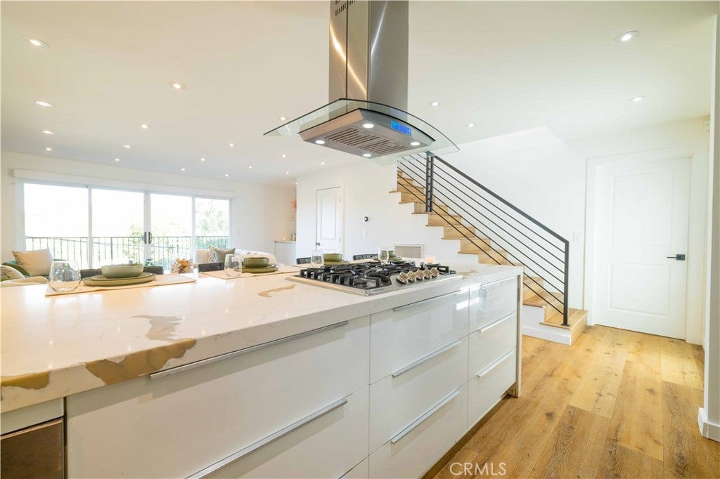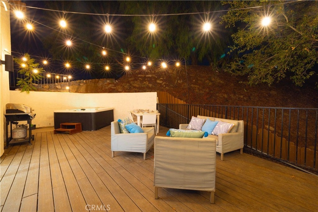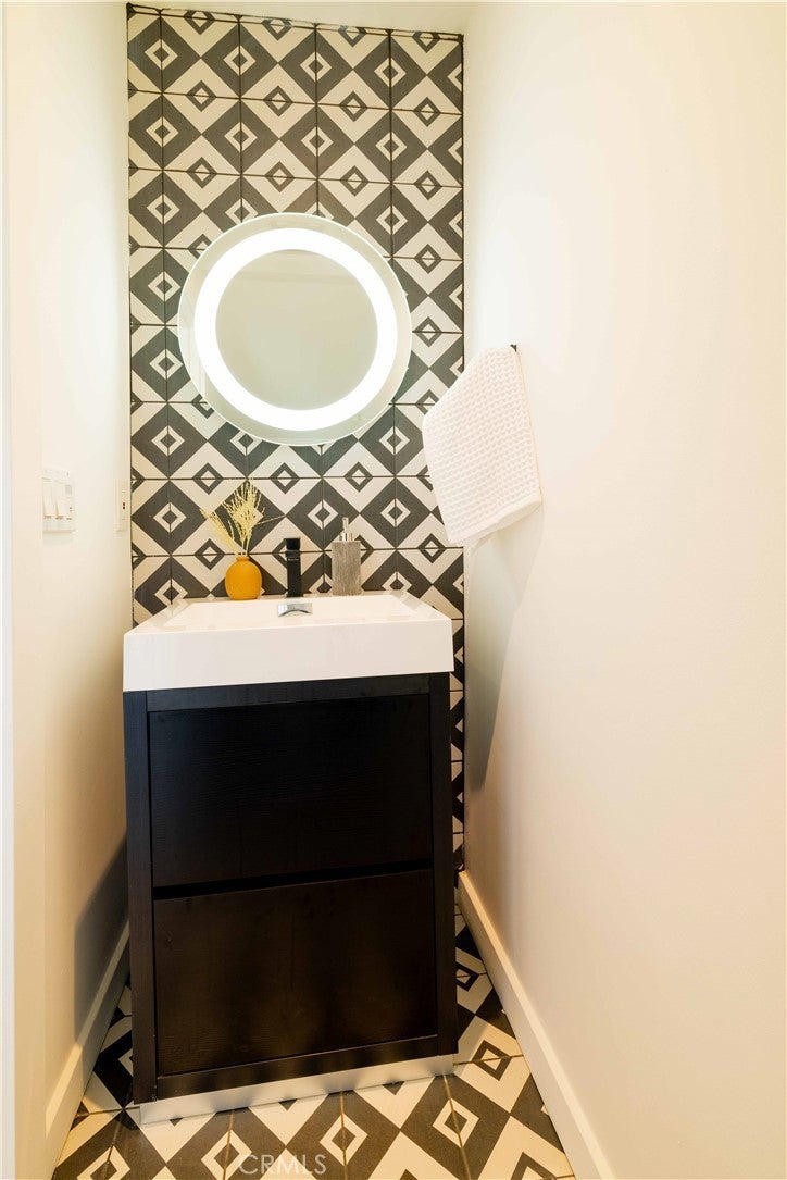 Set above the surrounding landscape with sweeping views of the Santa Monica Mountains, this thoughtfully redesigned Woodland Hills home blends architectural character with modern sophistication. Offering approximately 1,878 square feet, the home features 4 bedrooms and 2.5 bathrooms, highlighted by exposed beams, expansive black-framed windows, and abundant natural light throughout. The main living space is anchored by a designer kitchen with black and white two-tone cabinetry, quartz countertops, waterfall island seating for six, under-cabinet lighting, and stainless steel appliances including a double oven. A custom quartz dining table crafted from the same slab as the island creates a seamless, cohesive entertaining experience. The adjacent living room centers around a fireplace framed by a custom concrete accent wall. Indoor-outdoor living is a defining feature of the home, with three Trex decks positioned to capture panoramic mountain views, ideal for entertaining or quiet evenings at sunset. The primary suite serves as a private retreat, featuring a spacious walk-in closet with custom built-ins and skylight, plus a spa-inspired bath with hexagon tile flooring, floating dual vanity, oversized walk-in shower, and standalone soaking tub. LED backlit mirrors enhance all bathrooms. Energy-efficient split-system HVAC provides year-round comfort. Upstairs, a versatile loft/study space overlooks dramatic vistas, ideal for a home office or creative retreat. The property includes mature fruit trees like pomegranate, lemon, orange, and apple along with generous outdoor space. An attached two-car garage and additional parking for up to six vehicles offer rare convenience for the area. Located near Woodland Hills Country Club, Serenia Park, and extensive green space, this residence offers elevated Valley living with refined design and modern functionality.