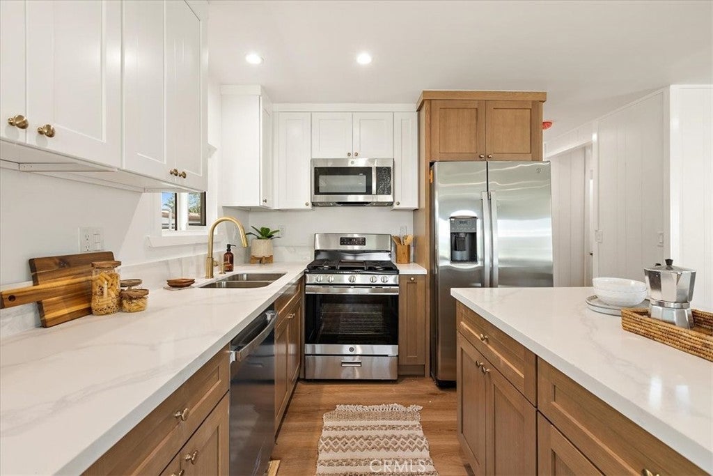 Welcome to Friendly Village, a highly desirable 55+ mobile home park in the city of La Habra. This 2 bedroom 2 bathroom home has been fully remodeled. On the exterior, a 2 car covered carport, a detached storage shed. New double pane windows, new paint, new carpet on the covered patio entrance and low maintenance landscape. On the interior, a modern and spacious open concept. Upgrades include, new laminate flooring, new drywall on the ceiling, new recessed lights, new kitchen cabinets and countertops, 2 fully remodeled bathrooms, all new fixtures and new plumbing. Interior features include washer and dryer hook hooks, central AC/Heating, a spacious master bedroom, with walk in closet and private bathroom. Best of all this home comes with a brand new fridge, dishwasher, stove, microwave, washer and dryer! In addition, this community offers an array of amenities for residents to enjoy. A gated pool and spa, golf putting green, fenced dog area, spacious clubhouse, fitness room, game room, library. Centrally located near shopping centers, Costco and restaurants.
