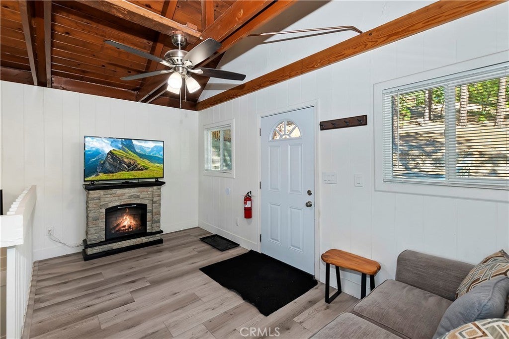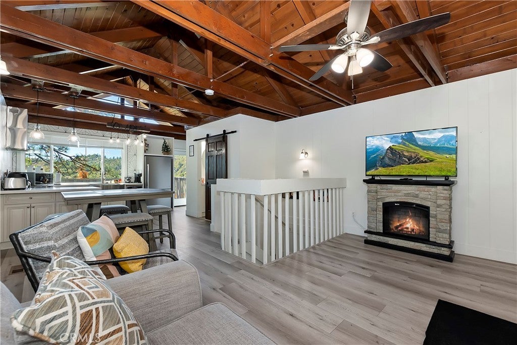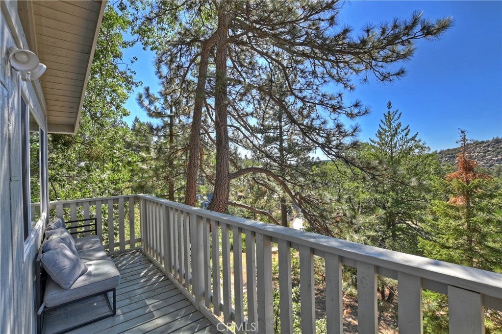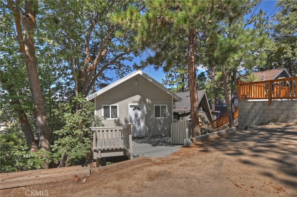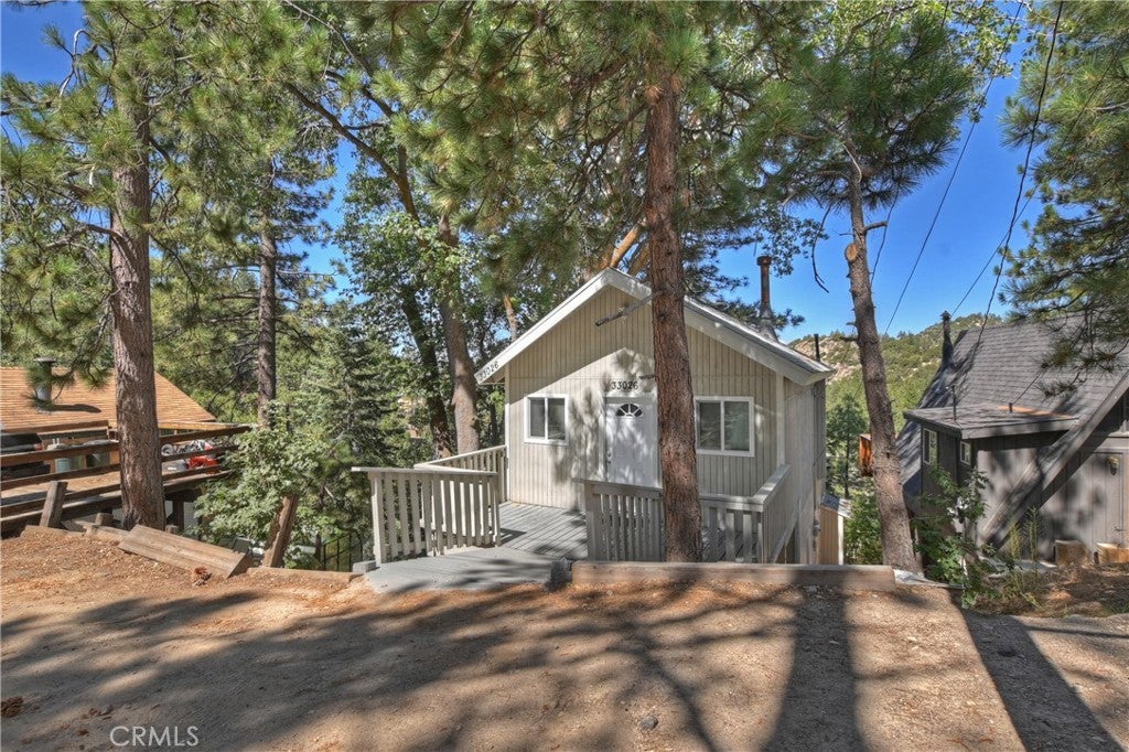 This home is a two bedroom, two bathroom gem in Arrowbear. With upgraded stainless steel appliances, the kitchen boasts modern convenience and fantastic view out the kitchen window. The stunning tree-lined views outside create a serene ambiance, complemented by the vaulted ceilings adorned with open beams in the great room, enhancing the spacious open concept living area. Transitioning seamlessly to a back deck, the home invites you to enjoy the scenic beauty. The two bedrooms are conveniently situated downstairs, accompanied by a beautifully designed bathroom. Located in Arrowbear, this residence serves as an ideal commuter location and a wonderful getaway. Inside, the space is illuminated with ample natural light, further accentuating the beautiful gray tones that give the interior stylish touch. Home is equipped with air conditioning as well.