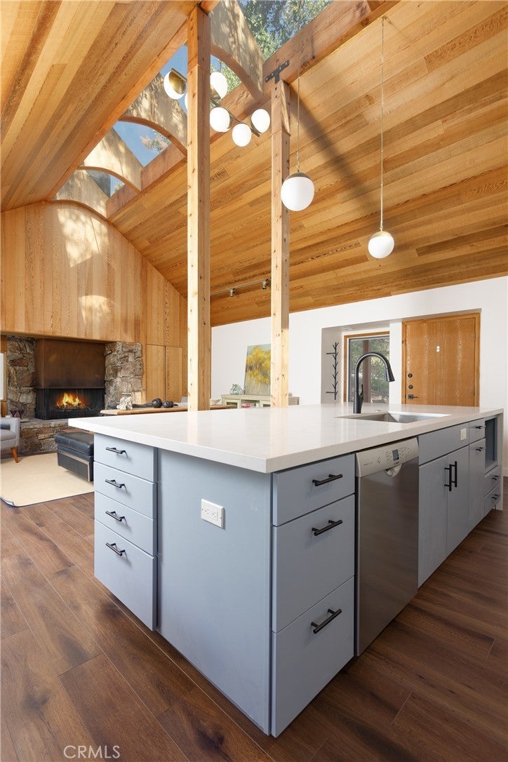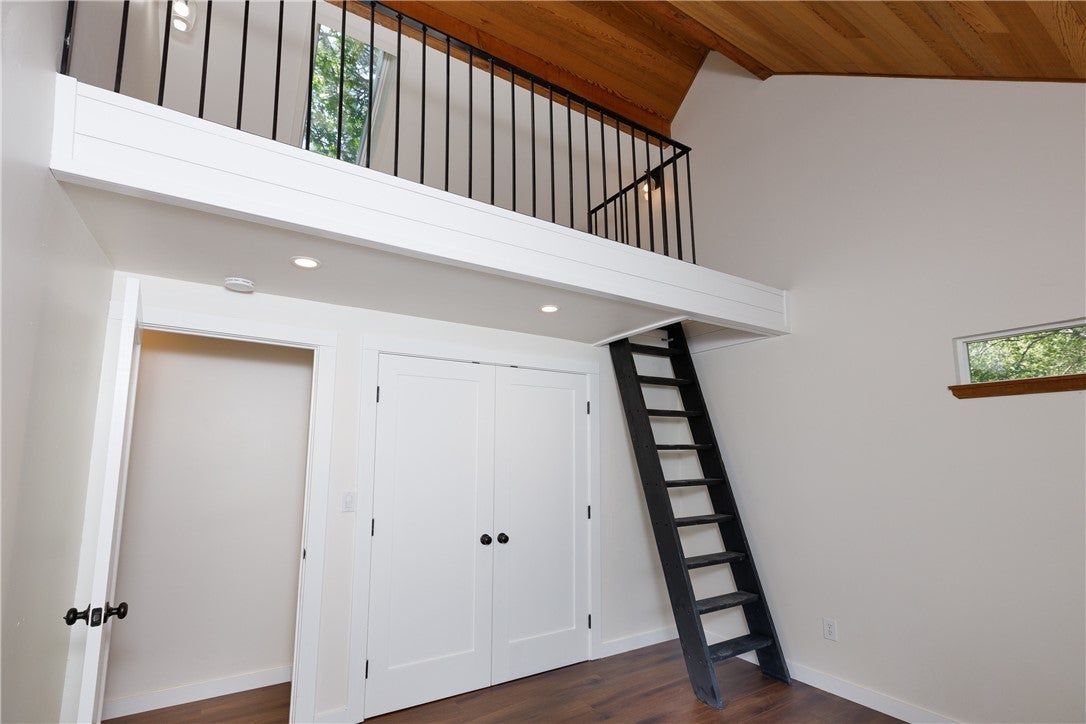 Sometimes the best surprises come in the smallest packages. That's certainly the case in the latest Brule-Cerwin remodel of this artistically unique hideaway. The only other owners are the ones who conceptualized, designed and built their dream cabin and the current owner/builders kept their concept alive, just took it to the upper limits of what it could be. The ceiling and walls of warm beautiful cedar are still there with hidden spaces that open with the touch of your hand, to house the TV and music system equipment in one and another is the laundry room! And the original owners idea of an open roof...or part of it...was kept in place, flooding the house with light from the more-than-a-skylight. Another original is the fireplace with metal hood and stone surround including a cuddly bench to curl up in. A wall was removed to open the living room and kitchen into one wide open space. A giant island in the kitchen offers seating on one side and high end appliances on the kitchen side. On the side of the kitchen is a built-in dining nook with a backdrop of windows. The living area has a spacious bay window to give you even more light. The two bedrooms are a perfect size with a loft area in each for office space or kid space, or extra sleeping space. A beautiful bathroom wth double sinks and tub/shower is conveniently near both bedrooms. A large deck in the back is a great place to barbecue and has built-in planter boxes for container gardening. Down a short set of stairs off the deck is space that could be turned into another bedroom and bath if needed, or it's just great storage space. There's a lot of light and, well, WOW, packed into this small package. Come make it your own.