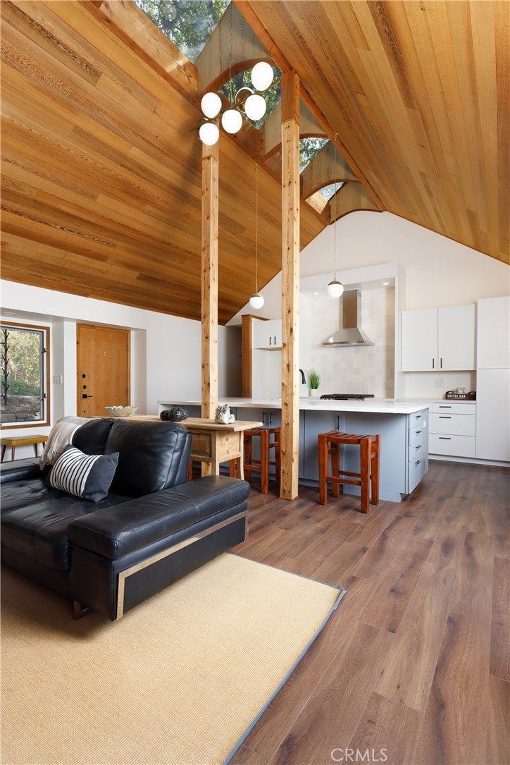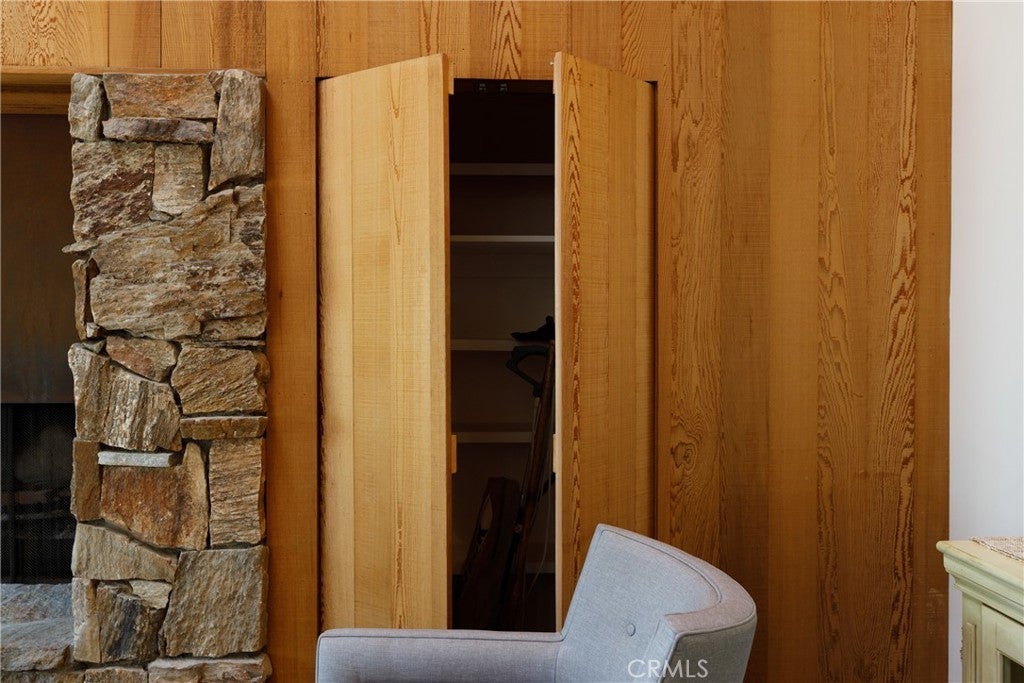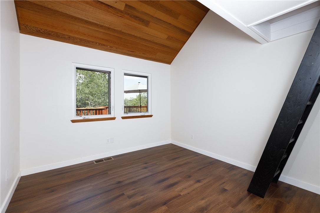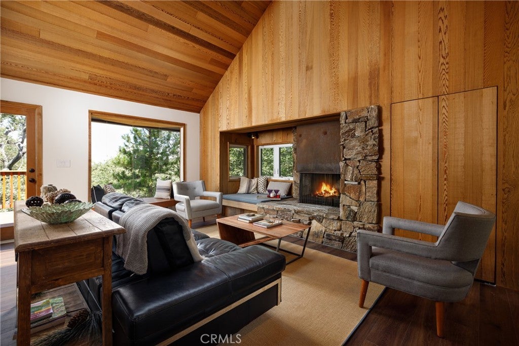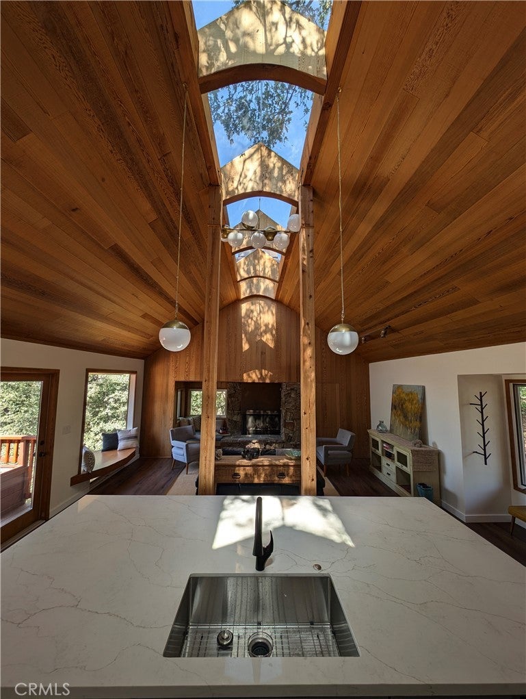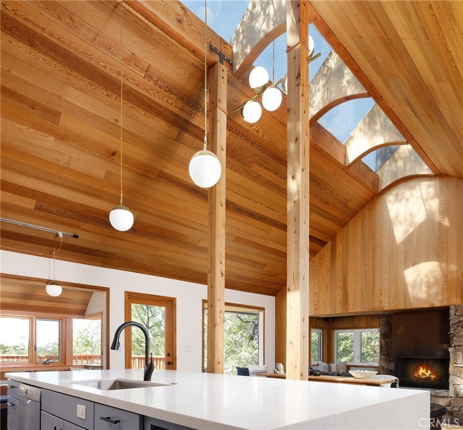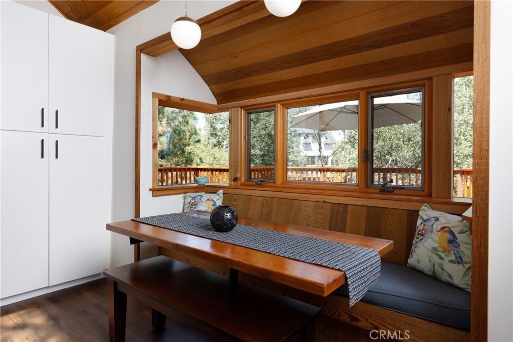 Breakfast Bar, Breakfast Area, Cathedral Ceiling(s), Eat-in Kitchen, Living Room Deck Attached, Open Floorplan, Stone Counters, Wood Product Walls, Bedroom on Main Level