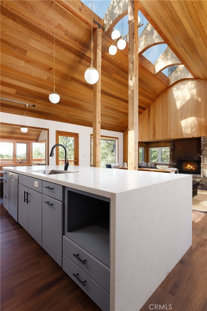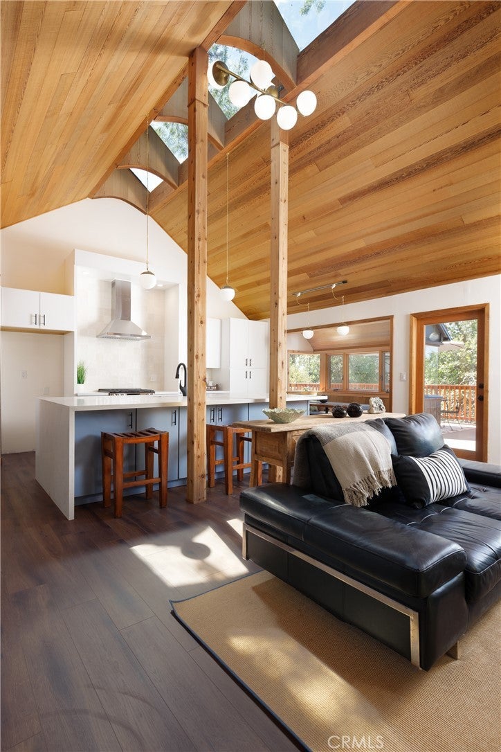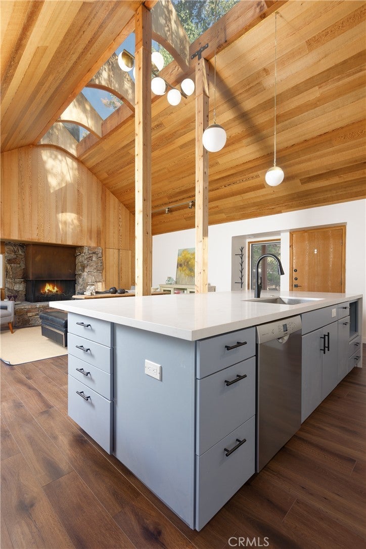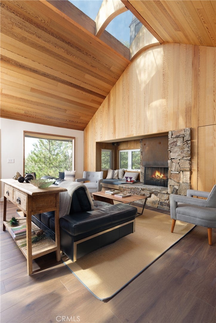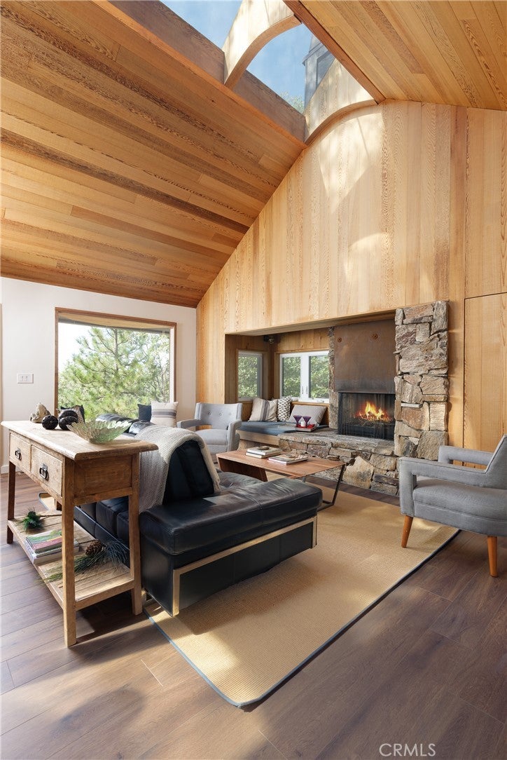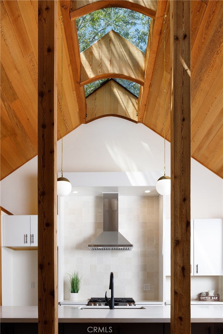Breakfast Bar, Breakfast Area, Cathedral Ceiling(s), Eat-in Kitchen, Living Room Deck Attached, Open Floorplan, Stone Counters, Wood Product Walls, Bedroom on Main Level