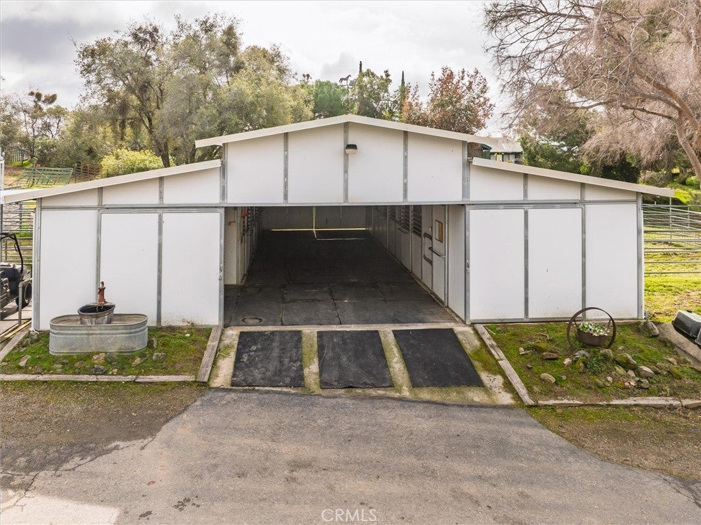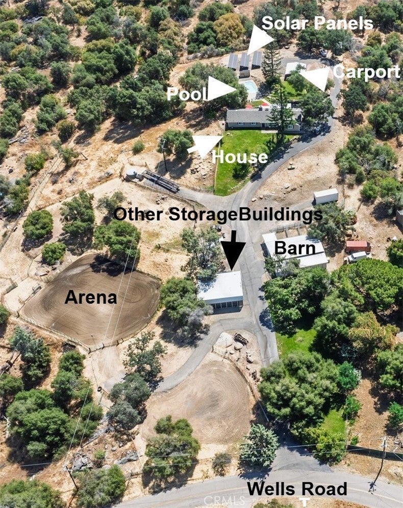 This horse property has so much to offer, you really need to watch the virtual tour to discover all of the amazing amenities! From the automatic gated entry, paved driveway, past the riding arena, the barns and up to the home with a pool, you'll be impressed! The horse set up features a large riding arena equipped w/lights & dedicated water storage w/sprinklers. There is a huge hay barn which can also be used for parking your horse trailer or RV and has 50 amp service. The 6 stall steel barn includes runs, 2 wash racks (w/on-demand water heater,) 2 master cool units ducted to each stall, auto fly sprayer, lights w/timers, tack room & feed room. The property features lush lawns and an updated home. The updates include; a 3 yr old roof, updated windows and sliders, updated PEX piping, beautiful vinyl siding (fire & woodpecker resistant,) 10 yr old HVAC, tile flooring, granite counters/showers, stainless appliances & so much more! Fenced, cross fenced, storage galore and a solar system!