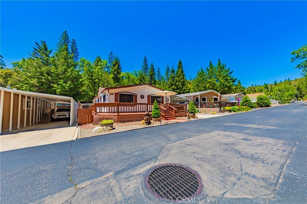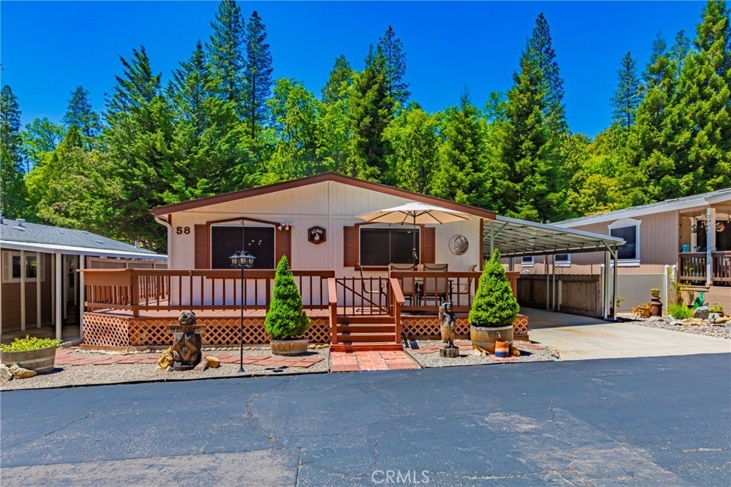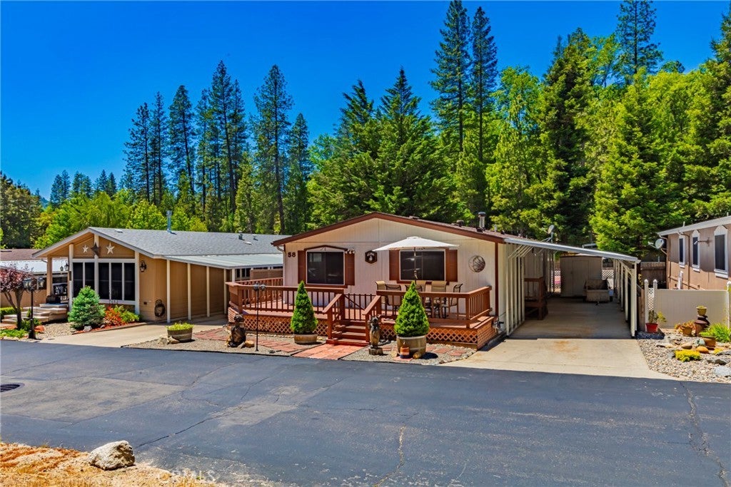 Immaculately updated move- in ready home located in the 55+ community of Sierra Springs Village in Bass Lake. Enjoy cooler evenings and the beauty of nature from the deck of this beautiful home.At over 1680 square feet, it's one of the larger manufactured homes in the community, offering a great space for entertaining guests from the new upgraded new kitchen with Granite countertops and relaxing in the spacious open floor plan with natural light and vaulted ceilings. A bonus feature is that your view from the dining room windows is the beautiful pines that frame the area. New paint, granite countertops in bathrooms, new flooring, brand new upgraded heavy duty car port, newer roof, hobby shop w/ electricity, and so much more. Come see this spacious 3 bedroom 2 bathroom manufactured home in person! It is a rare find! Extra parking for visitors sits right across the street!