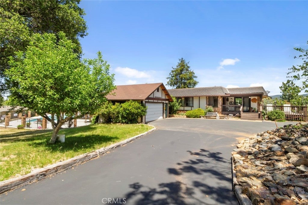 Welcome to your own Tyrolean-style retreat in the Sierra foothills - a home rich in charm, history, and character. Built in the late 1970s by the Cathrein family, this was the first home in what became a one-of-a-kind 55+ community. Inspired by the Austrian-German Tyrol region, it features custom architecture, a triple-wide manufactured layout on a permanent foundation, a stick-built great room addition, and a castle-style basement wine cellar with split door and stone surround. Nestled on an elevated lot surrounded by mature oaks and evergreens, the property feels like a private park. The wraparound paved driveway offers extra parking and space for RVs, boats, or gatherings. A large front deck provides sweeping Sierra views and a quiet space to relax among visiting deer and wild turkeys. Step inside through a carved wooden front door into a foyer wrapped in stained pine. Vaulted ceilings and exposed beams define the spacious living room, dining area, and family room with built-in wet bar and wall of windows. The kitchen is outfitted with granite countertops, stainless undermount sink, handsome cabinetry, matching appliances, and lots of storage. French doors open to a dramatic library featuring a floor-to-ceiling tiled fireplace, built-in oak shelving, and private access to the side deck. The oversized primary suite includes vaulted ceilings, dual windows, a luxurious en-suite with soaking tub, walk-in shower, dual vanity, and makeup station. A spacious second bedroom offers a bay window and scenic views, while the hallway bath features a tub/shower combo and upgraded oak vanity. The indoor laundry room has built-in storage and its own exterior door to the deck. Additional amenities include an oversized detached 2-car garage with workshop potential, a charming shed perfect as a detached office, and immediate access to the community’s clubhouse, pool, and raised gazebo. Community utilities include private water and sewer systems. A one-of-a-kind home in a legacy neighborhood. Welcome Home!!!
