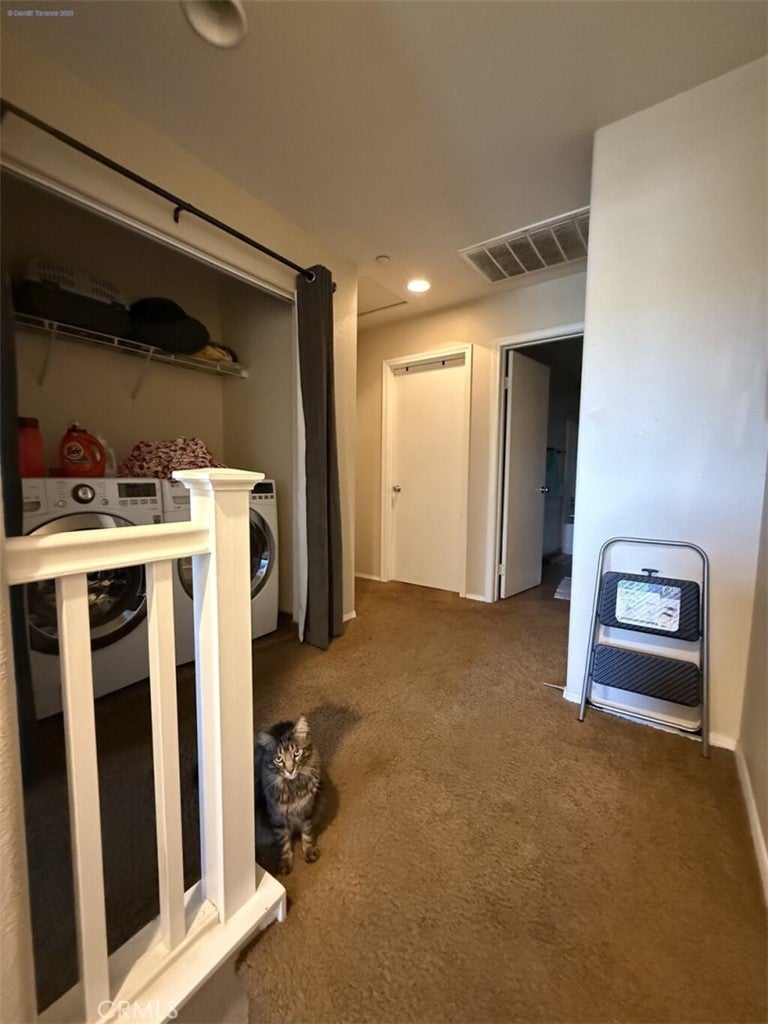 **This Beautiful Condo located in the extremely well-kept Casabella Community is the ideal home!** Spanning 1,696 square feet, this beautifully designed 2-story, 3-bedroom, 2.5-bathroom condo offers a perfect blend of comfort, style, and convenience. It features an oversized 2-car garage, along with a host of premium amenities. Upon entry, you're greeted by a spacious, open-concept living area that seamlessly connects the dining area, large kitchen, living room, and a cathedral ceiling stairwell to the upstairs bedrooms. The large downstairs living area is complete with access to the attached oversized 2-car garage and sliding glass door to a large low-maintenance private outdoor patio area. The spacious eat in kitchen/dining area boasts tons of gorgeous oak cabinets, chef's kitchen counter-space, a large pantry, bar top island, stainless steel appliances, lots of windows, and plenty of room for a large dining table. You’ll enjoy the modern open concept of the first floor living space with a large family room featuring a cozy fireplace and entertainment area. A generously sized closet and guest bathroom complete the bottom floor. Upstairs there are 3 spacious carpeted bedrooms with ceiling fans and hallway, with 2 bedrooms sharing a full size tiled bathroom as well as a separate tiled laundry space with included washer/dryer. The master suite is a genuine retreat, featuring a private tiled bathroom with double vanity sinks, a spa-style tub, separate shower, walk-in closet, and a beautiful 180-degree 2nd floor view. A private fenced yard with paver flooring is the perfect space for a pet, children to play, or outdoor entertaining! The immaculately well-kept, managed, and patrolled 204 dwelling private Casabella community amenities include a family park, pool, and clubhouse! Nestled in a prime location, this home is close to shopping, a local sports park, and award-winning Temecula schools. Enjoy serene master-suite views of a setback hilltop complete with fitness trail only blocks-away. This is the perfect combination of suburban living with a touch of rural charm.
