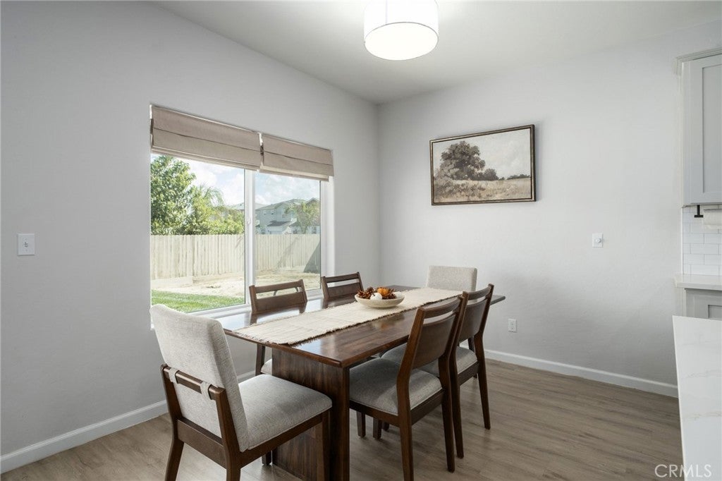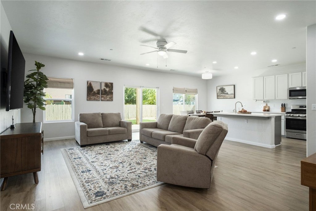 This Meticulous Newer Home in Southwest Hanford is Move-in Ready. Designed with attention to detail with premium upgrades; this property offers a comprehensive package for discerning buyers, which Includes Fully Owned Solar and an additional parcel included making the lot very spacious. Walk into an Open floor plan accentuated by a modern kitchen showcasing a quartz-countered island and countertops with white subway tile backsplash, seamlessly integrating with the designated dining space. The layout boats a strategic split-bedroom design, the primary suite near the laundry room on one end, and two additional bedrooms accompanied by a guest bathroom with a tub on the opposite side of the home offer both privacy and convenience. Noteworthy features include luxury Vinyl Tile flooring throughout the living room, kitchen, dining, hallways and bathroom areas, emphasizing durability and aesthetic appeal. A generously sized primary bedroom equipped with a substantial walk-in closet, ambient natural light from a rear-facing window, and an ensuite bathroom with dual sinks and a large walk-in shower offer the elegance one seeks at the end of a long day. An eco-friendly approach to modern living with fully owned Solar and an expansive backyard, the combination of two parcels, provides ample space for diverse landscaping and/or recreational projects, maybe even an ADU. Other key amenities include an on-demand tankless water heater, stainless steel appliances, a spacious two-car garage, and a professionally landscaped front yard are waiting for you to call it Home! Call for your Showing today!