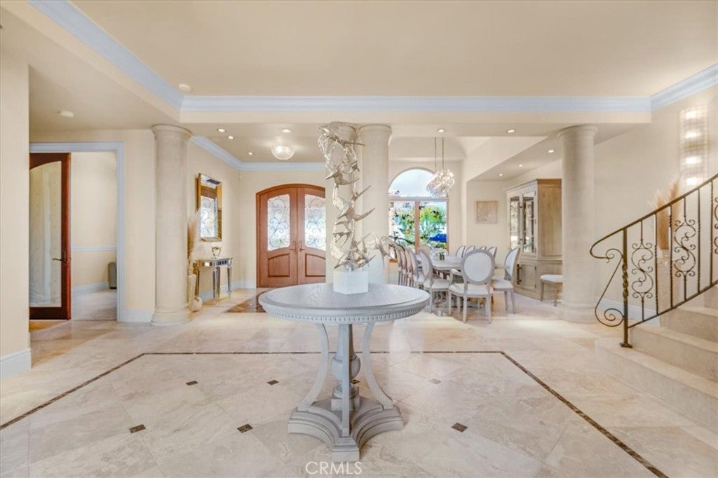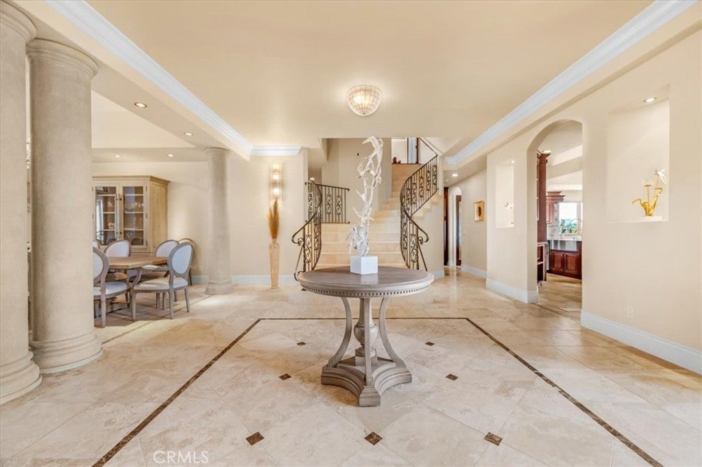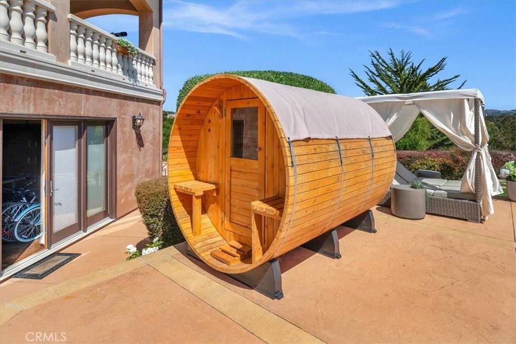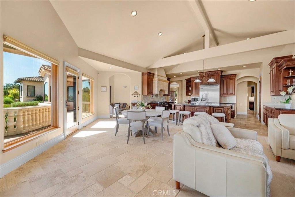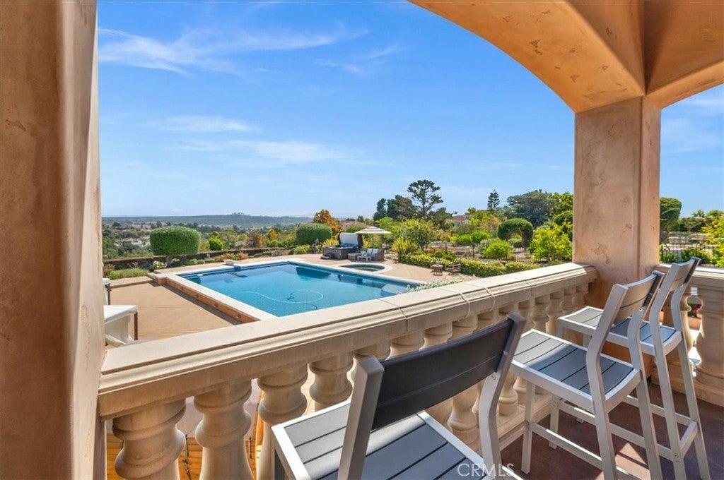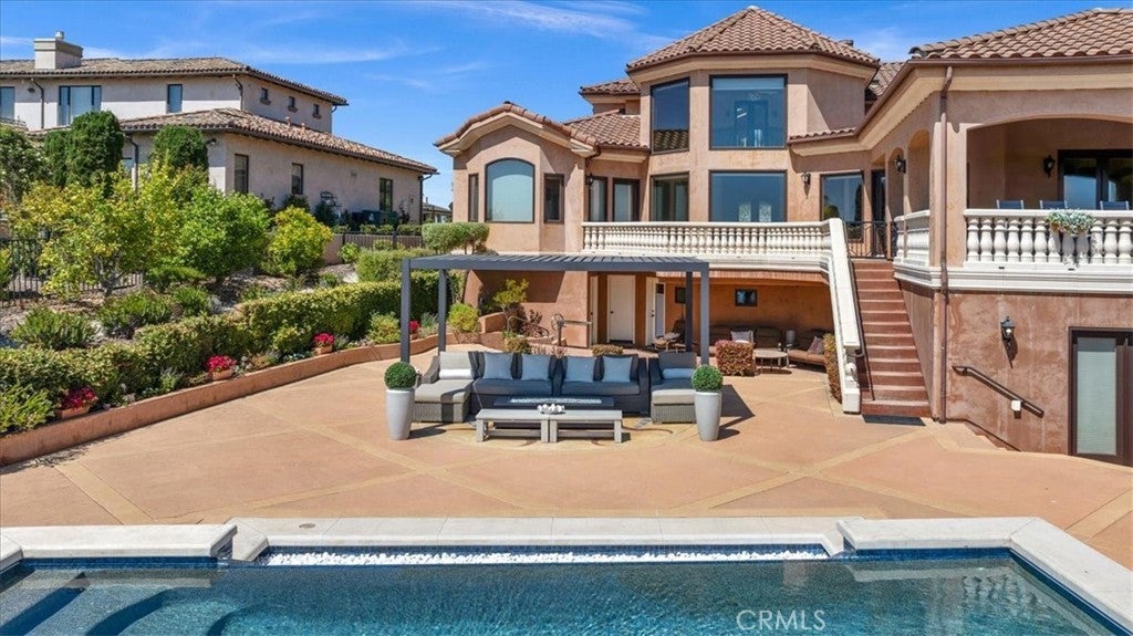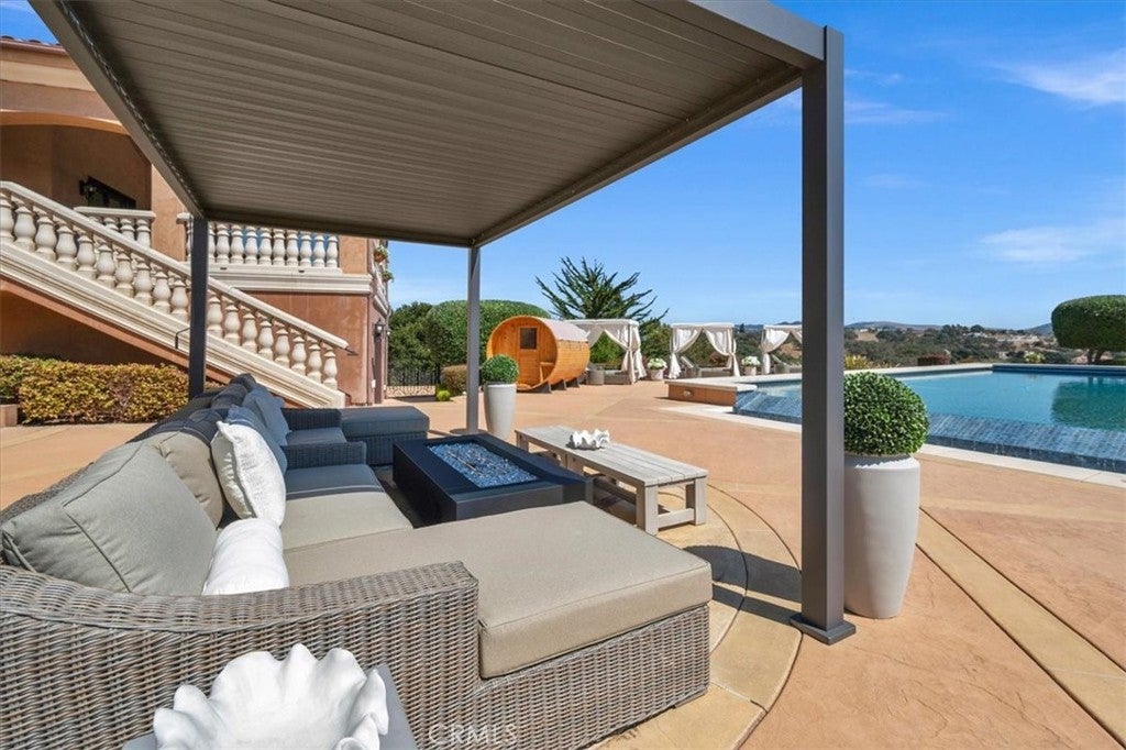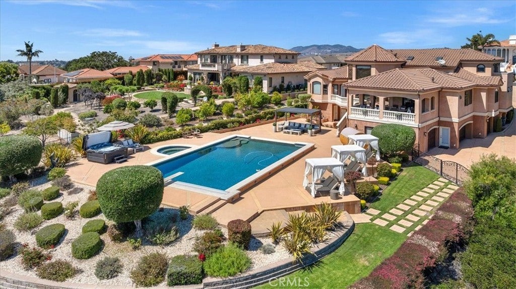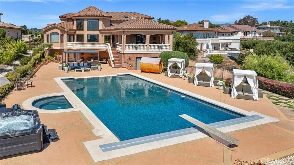 Located in Arroyo Grande, this ~6,100 sq ft resort-style estate represents exceptional craftsmanship and Central Coast luxury. Thoughtfully designed for both comfort and function, the home features 5 bedrooms and 6.5 baths with panoramic coastal, mountain, and ocean views—just minutes from the beach. The property also includes a high-speed home EV charger for convenient modern living. The entire third floor serves as the primary suite, complete with a sitting area, fireplace, walk-around closet, private laundry, multiple balconies, and a corner office. The second floor includes four additional bedrooms, one configured as a guest suite with kitchenette, along with the main kitchen, dining area, and gathering spaces. A spacious balcony and patio showcase partial ocean and mountain views, ideal for outdoor dining and entertaining. This level also features a game room with wet bar and a state-of-the-art movie theater designed for comfortable viewing. The gourmet kitchen is equipped with Viking appliances, a Wolf espresso maker, and a Sub-Zero wine cooler, centered around an elegant island and wet bar. On the lower level, a large temperature-controlled wine cellar provides excellent storage for collectors. A private elevator connects all levels of the home, while radiant heating ensures year-round comfort. Outdoor areas include a covered veranda, sparkling pool, jacuzzi, three cabanas, sauna, and landscaped grounds surrounded by mature trees that enhance both shade and privacy. A porte-cochère marks the grand entry, with finished garages discreetly located below to maintain architectural balance. The neighborhood offers parks, schools, and nearby shopping including Trader Joe’s, while Arroyo Grande and Pismo Beach provide access to dining, entertainment, and scenic coastal recreation. This home offers refined design, modern amenities, and the best of Central Coast living.