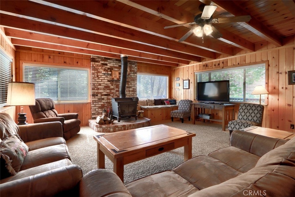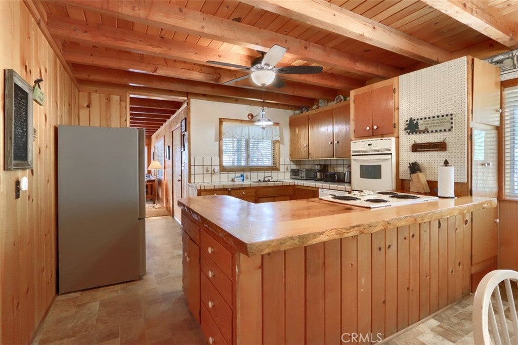 Beamed Ceilings, Ceiling Fan(s), Furnished, Living Room Deck Attached, Tile Counters, Bedroom on Main Level