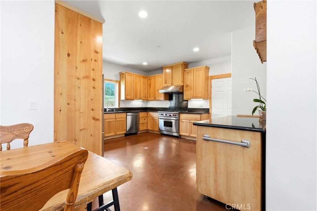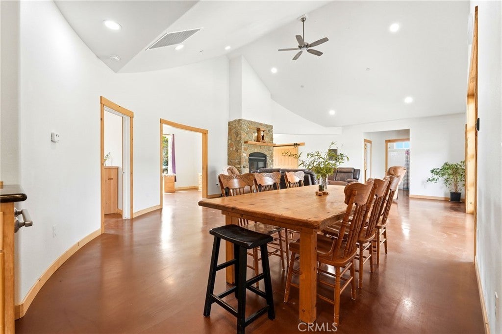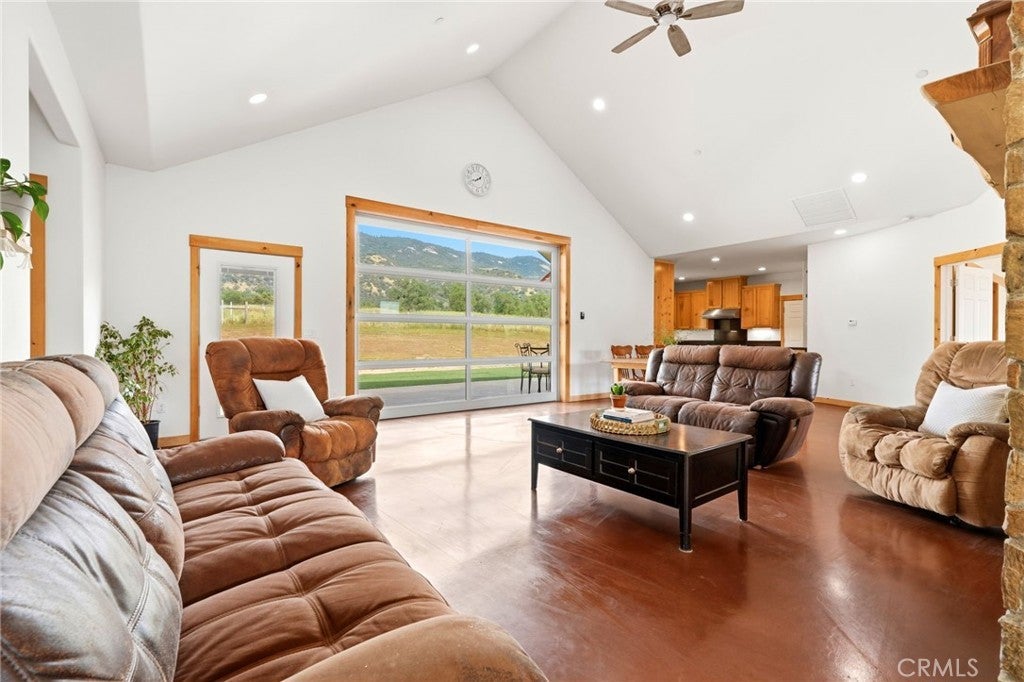 Nicely appointed on 20 private, usable acres with big open skies and expansive McKenzie Ridge views, this custom 2,100 sq. ft. estate balances high-end luxury with rural utility. Ideally located minutes from Hwy 180, Dunlap School, and the post office, the property features dual access points and is a short drive to Kings Canyon or a straight shot to Valley shopping. The home is built for longevity with a premium standing seam metal roof and fire-hardened exterior. Inside, vaulted ceilings and polished concrete floors meet local sugar pine trim. The living area features a stone fireplace and an operable glass roll-up door that opens to a covered patio plumbed for an outdoor kitchen. The chef's kitchen boasts a 36-inch Wolf range, dual dishwashers, and custom cabinetry. Designed for accessibility, all bathrooms including the granite-clad primary suite feature zero-step, floor-level transitions. Modern comforts include 9' ceilings, a dedicated library, a media room, and hydronic heated floors powered by a greenhouse wood stove with propane backup. The property offers high potential for agricultural and equestrian use, featuring 12-14 acres of newly fenced pasture sowed in oats, cleared of rock over the last three years, and framed by majestic, mature oak trees. The infrastructure is professional-grade: a massive 40x84 footprint including a 1,300+ sq. ft. sheetrocked garage with an enclosed bonus room, a tall 30x40 shop, a 36x36 stable barn, and a horse walker. Supported by a 100 GPM well (per log), the deer and rabbit-proof berry field (blueberries, blackberries, strawberries, raspberries) is equipped with full irrigation and a Dosatron nutrition injection system. The blueberries, now in their 4th year, produced an impressive 1,800 lbs last season. Leisure is equally prioritized with a greenhouse featuring an integrated hot tub and an 8.5-foot-deep pool with a diving board, privacy fencing, and a nearly finished pool house ready for your final touches. From the local wood finishes to the high-yield acreage, this meticulously maintained property is a rare opportunity to own a private, productive sanctuary where every detail has been executed with extraordinary care. *Square footages & room count may vary, to be verified by Buyer.