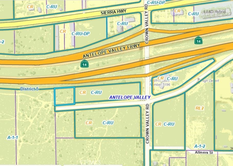 Rare opportunity for freeway frontage, flat land in Acton. Southwest of Antelope Woods Road and Crown Valley Road, near all community services. Access off of Antelope Woods Road per County. County Water in Crown Valley Road. Zoning currently A-1-1 (Light Agricultural – One Acre Minimum Required Lot Area), but adjacent to commercial (C-RU). Land Use Designation is RL1 (Rural Land 1 – One Dwelling Unit per Acre).