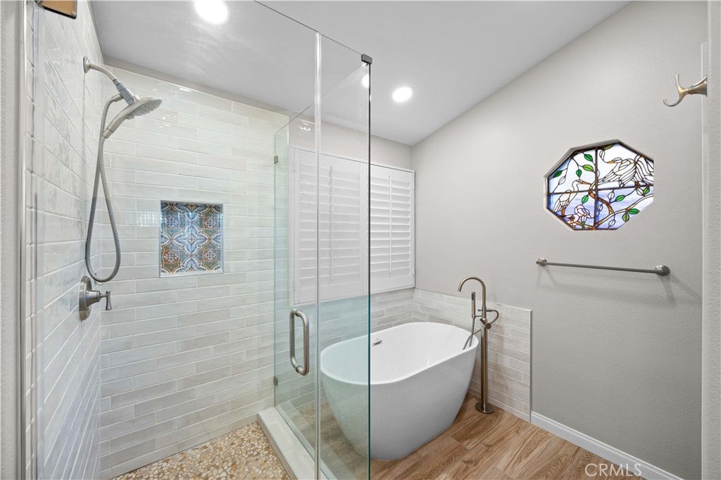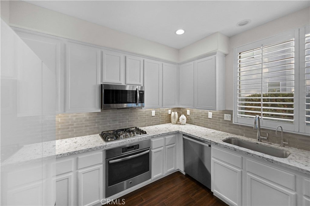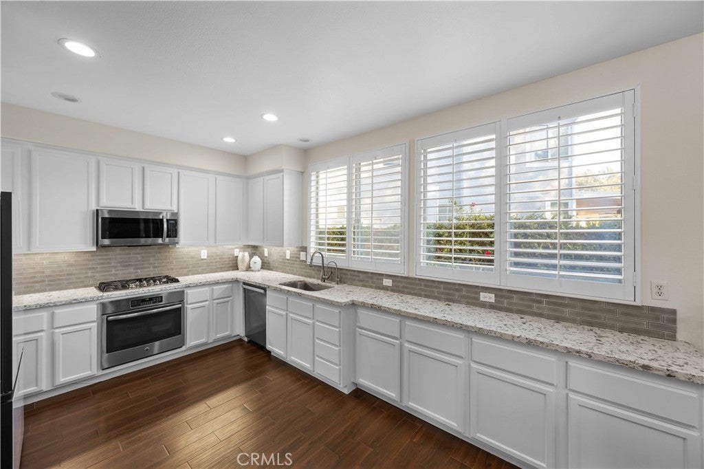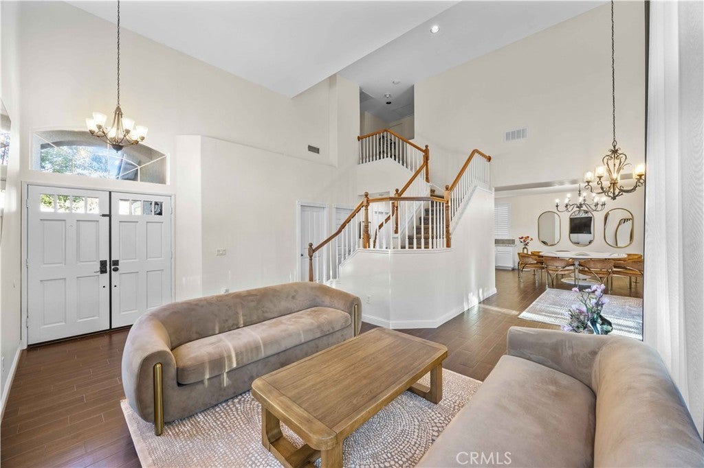 Welcome to 27503 Wellsley Way — a beautifully remodeled 4-bedroom, 3-bathroom home nestled at the end of a quiet cul-de-sac in the highly sought-after Northbridge Point community of Valencia. The remodeled kitchen features sleek quartz countertops, custom tile backsplash, stainless steel appliances, and updated flooring that flows seamlessly throughout the main living areas. Crown molding and plantation shutters add timeless elegance to every room. Upstairs, the luxurious primary suite showcases a spectacular en-suite bathroom complete with a spacious walk-in tile shower, stand-alone soaking tub, quartz dual vanities, and stylish tile flooring. The second full bathroom upstairs has also been tastefully updated with neutral tones and modern finishes. Enjoy the expansive covered patio, mature landscaping, and stunning valley views from the second floor—perfect for relaxing or entertaining. Located in the desirable Northbridge community with access to pools, parks, walking trails, top-rated schools.With low HOA fees, no Mello Roos, and model-sharp condition throughout, this is a rare opportunity to own one of the neighborhood's finest homes.