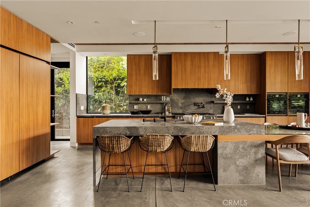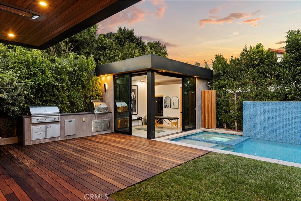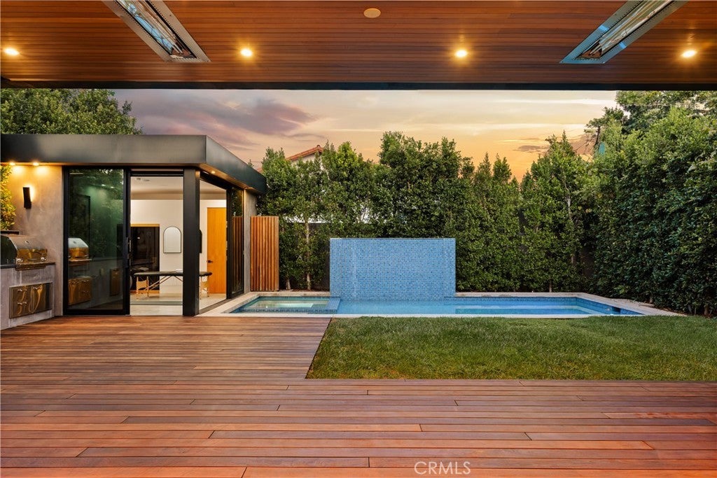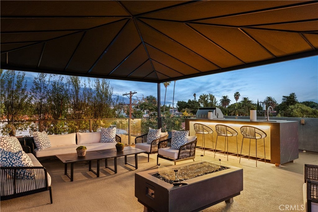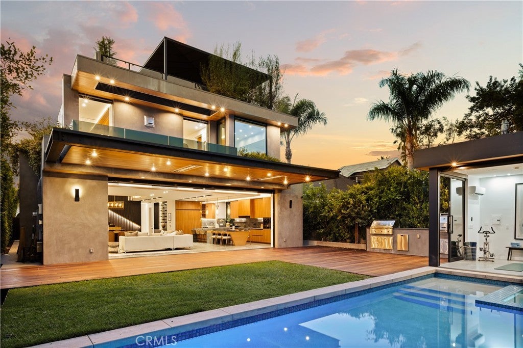 Modern luxury and architectural brilliance await at 540 N Gardner. a 2022-built architectural masterpiece in the highly sought-after Melrose Park neighborhood. This 5-bedroom, 5.5-bathroom smart home seamlessly blends sleek design with exceptional functionality across 3,864 square feet of curated space. Every detail is elevated: Fleetwood automatic pocket doors, radiant-heated concrete flooring downstairs, engineered wood upstairs, and heated floors in every bathroom. The gourmet kitchen impresses with floor-to-ceiling European cabinetry, quartz countertops, and a full suite of top-tier Miele appliances—including in-wall ovens, a steam oven, dishwasher, coffee system, and dual 36” panel-ready fridge/freezer. Indoor-outdoor living is effortless with a heated covered patio, saltwater pool and spa, outdoor shower, and pool house featuring a 2-person sauna. Entertain from the rooftop deck with built-in BBQ and city views. A full Lutron automation system, Sonos sound, solar panels, whole-house water and IQ-Air HEPA filtration elevate both lifestyle and wellness. Just steps from premier Melrose dining, shops, and nightlife.