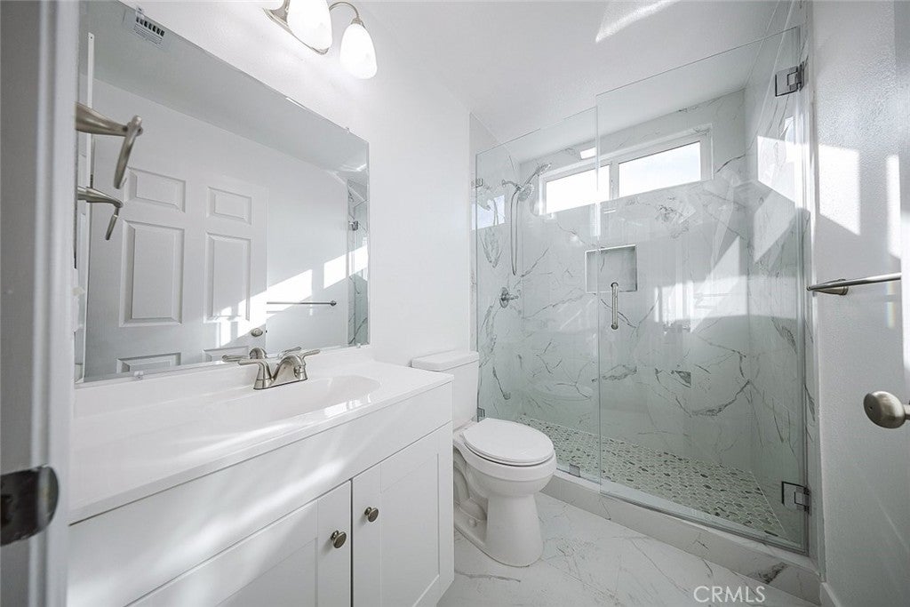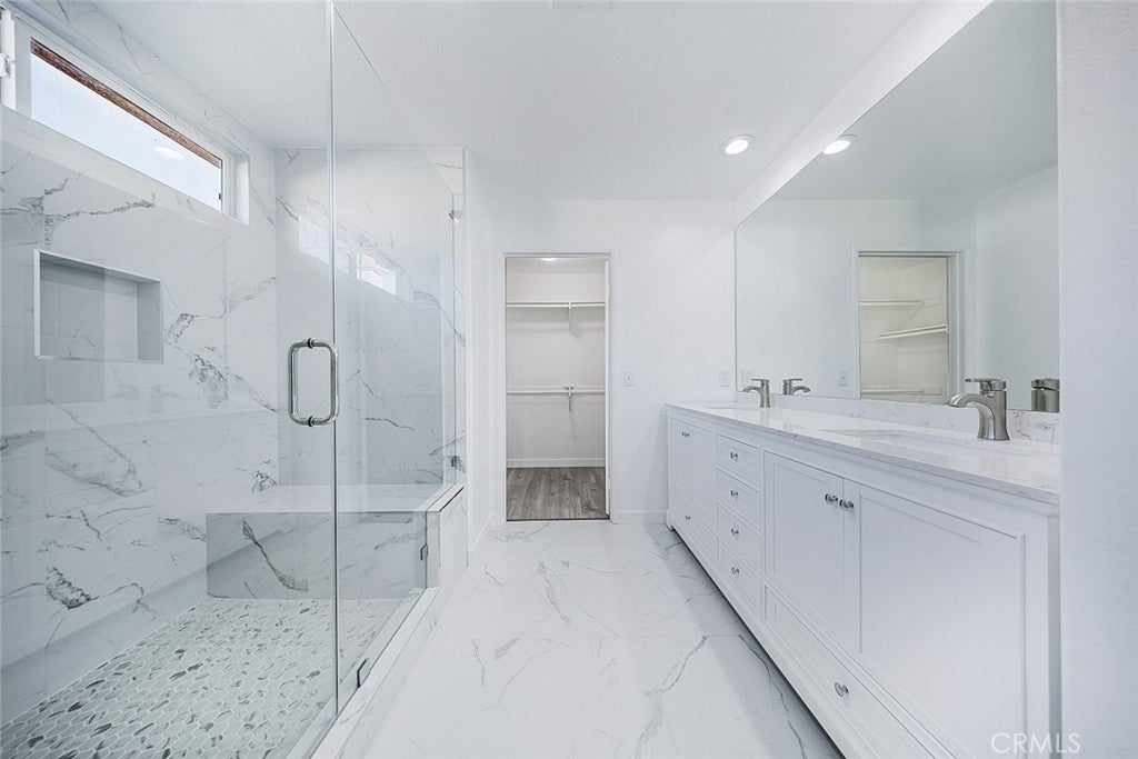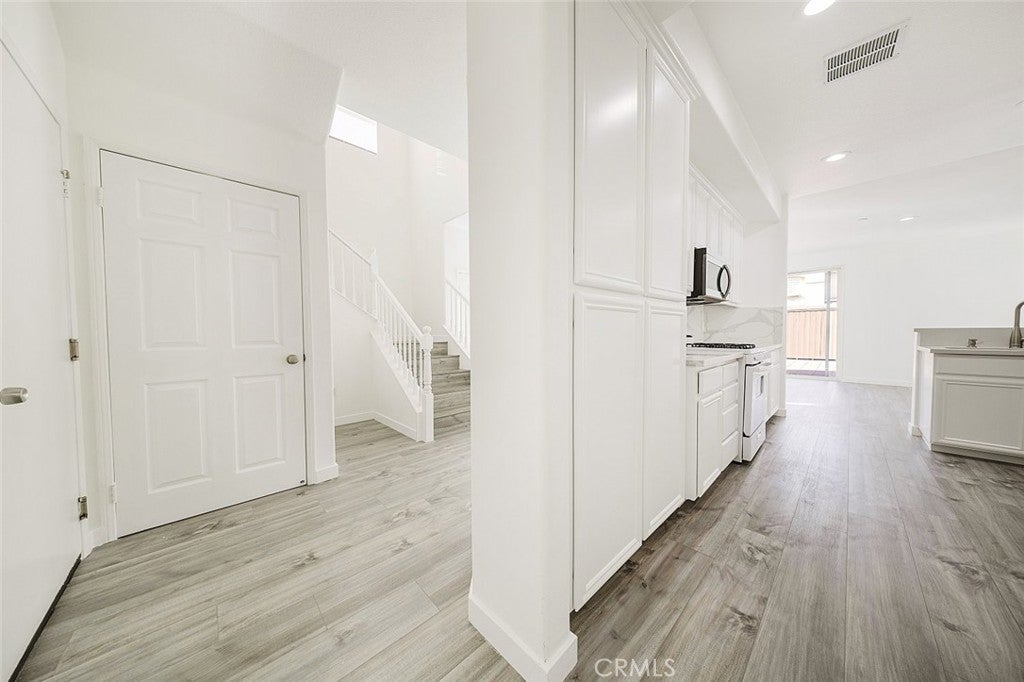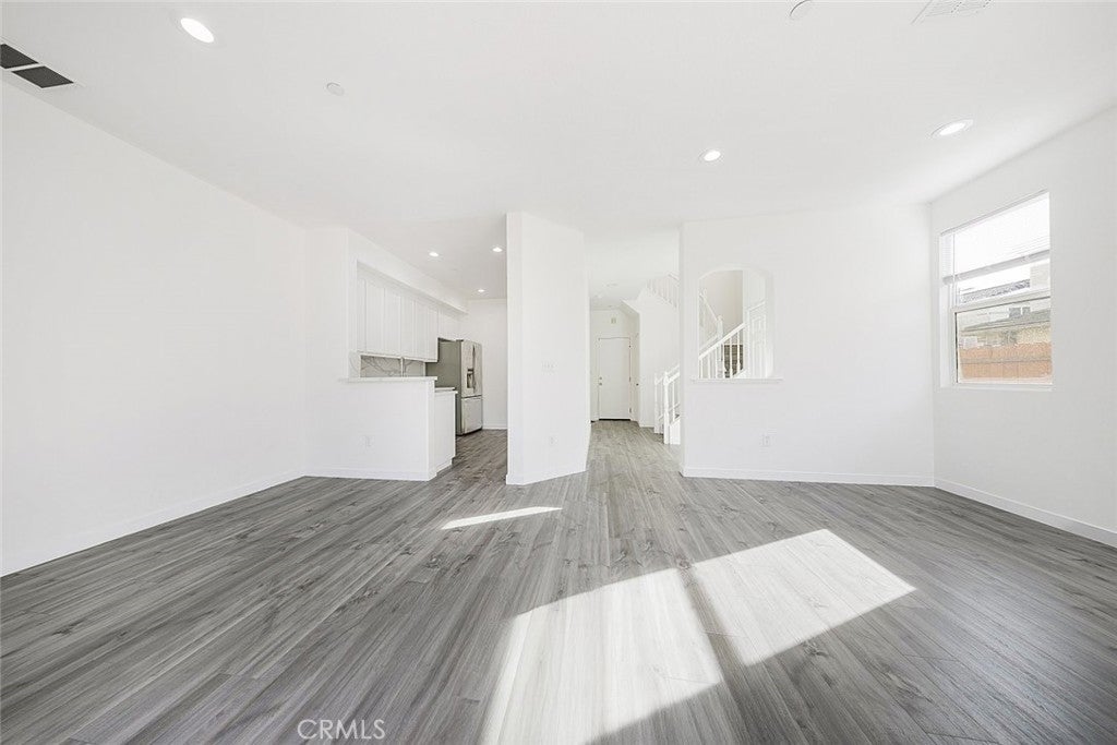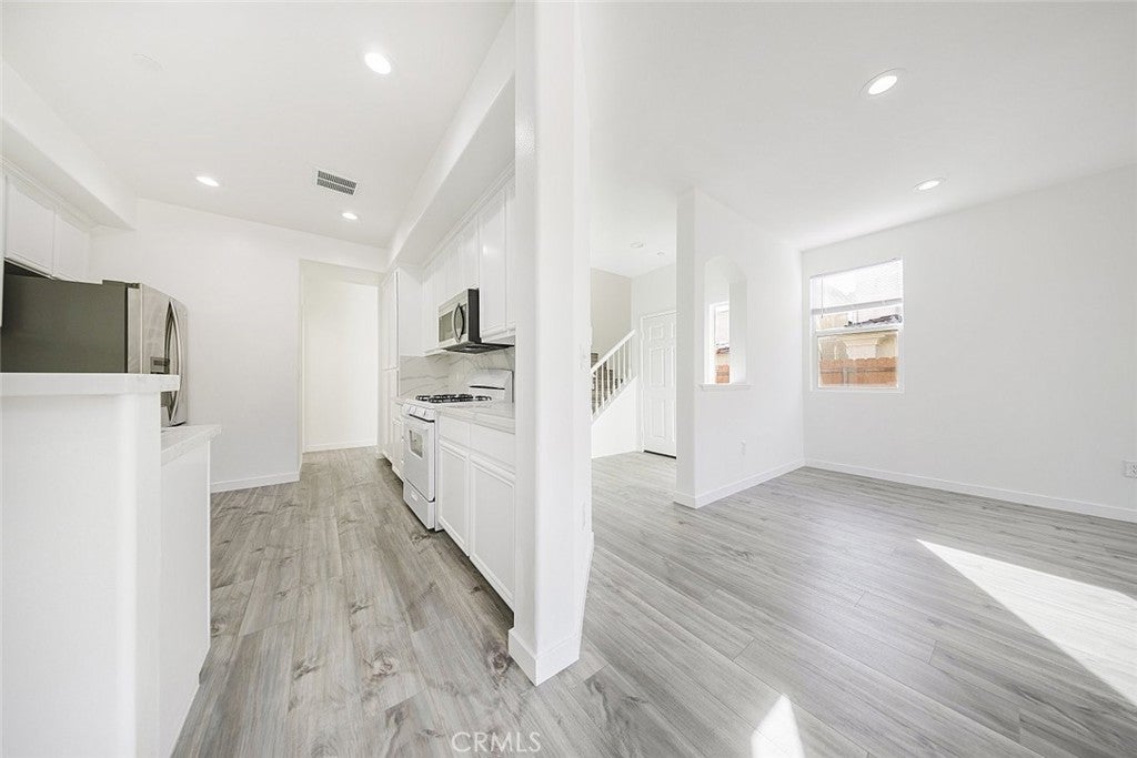 Welcome to this beautifully updated two story home offering 4 bedrooms, 3 bathrooms, and more than 1800 square feet of comfortable living space, located in the North Hills area of Los Angeles. The home features a bright and open layout with high ceilings, recessed lighting, and modern wide plank flooring throughout the main living areas. The spacious living room includes a cozy fireplace and sliding glass doors that open directly to the private backyard, creating an easy indoor outdoor flow ideal for everyday living and entertaining. The adjacent kitchen connects seamlessly to the living and dining areas and offers white cabinetry, generous counter space, and a functional layout for daily use. A bedroom and full bathroom are conveniently located on the main level, ideal for guests or flexible use. Upstairs, the expansive primary suite features a large sleeping area, a spa style bathroom with dual vanity, an oversized walk in closet, and a glass enclosed shower with bench seating. Two additional upper level bedrooms and a full bathroom provide ample space for family, guests, or home office use. The private backyard is fully enclosed and offers a generous patio area along with low maintenance turf, providing space for outdoor dining, entertaining, or relaxation. Additional highlights include a separate laundry area, an attached two car garage with direct access, and a well maintained community setting. Conveniently located near shopping, dining, schools, and local amenities, this North Hills home offers space, functionality, and modern comfort in a desirable Los Angeles location.