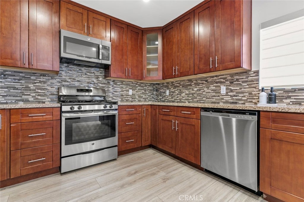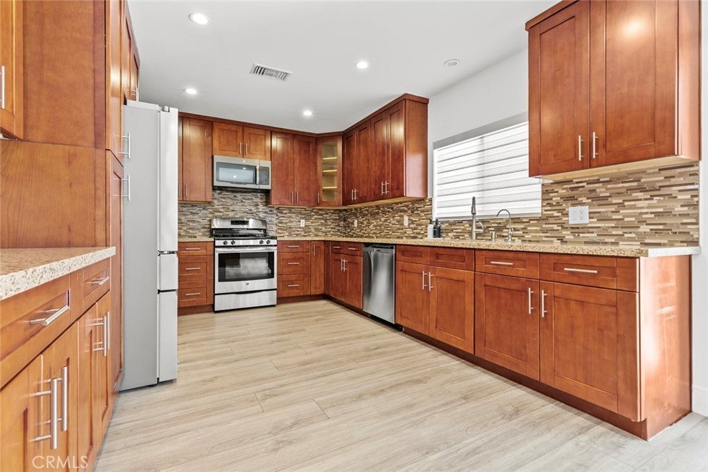 Welcome to this stunning, completely remodeled single-family home located in the heart of North Hollywood. Spacious 3 bedrooms, 2 bathrooms and approximately 1,859 square feet. This home blends modern upgrades with comfortable indoor-outdoor living. The home features a spacious, beautifully designed kitchen with a large island—perfect for cooking, entertaining, and everyday living. Enjoy the convenience of central HVAC and in-unit washer and dryer. Outdoor space is a standout, with a private backyard that includes a gated drive-in entrance for vehicles, plus a separate side yard with lush grass, ideal for relaxing, play or entertaining. Situated on a desirable street, this property provides the privacy of a single-family residence while being close to shopping, dining, studios and major commuter routes throughout North Hollywood and the greater Los Angeles area. A wonderful opportunity for tenants seeking a move-in-ready, updated home with generous space and outdoor areas.