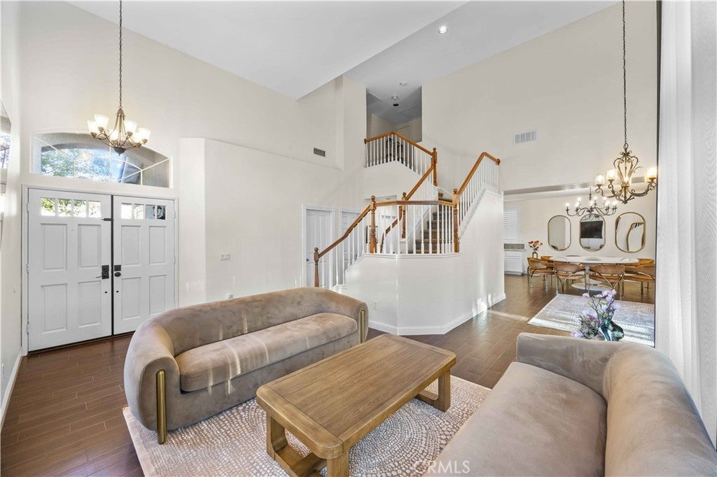 Stunning Home in Valencia This beautifully remodeled 4-bedroom, 3-bathroom home is situated at the end of a cul-de-sac in one of Valencia’s most desirable neighborhoods. Designed for both comfort and style, the home features soaring high ceilings, modern finishes, and an open, inviting layout. The main level includes a guest bedroom and a full bathroom, perfect for visitors. Upstairs, the spacious primary suite offers high ceilings and plenty of room to relax. The ensuite bathroom features a standalone tub, a walk-in shower, a double vanity, and a private toilet room. There are two additional bedrooms and one full bathroom upstairs. The remodeled kitchen is sleek and modern. A separate laundry room comes included with washer/dryer and a three-car garage provides added convenience. Step outside to an enormous backyard, ideal for entertaining, with a great playground and a designated area for pets. The outdoor space is perfect for hosting, with beautiful valley views. Located in a well-maintained community with an HOA that offers a pool, walking trails, and parks. Just minutes from top-rated schools, dining, Town Center, and grocery stores. A true Valencia gem—move-in ready and waiting for you!!