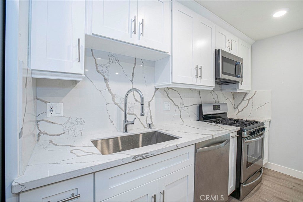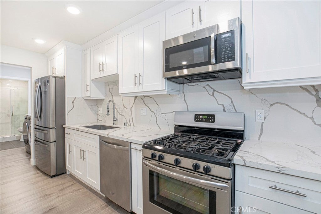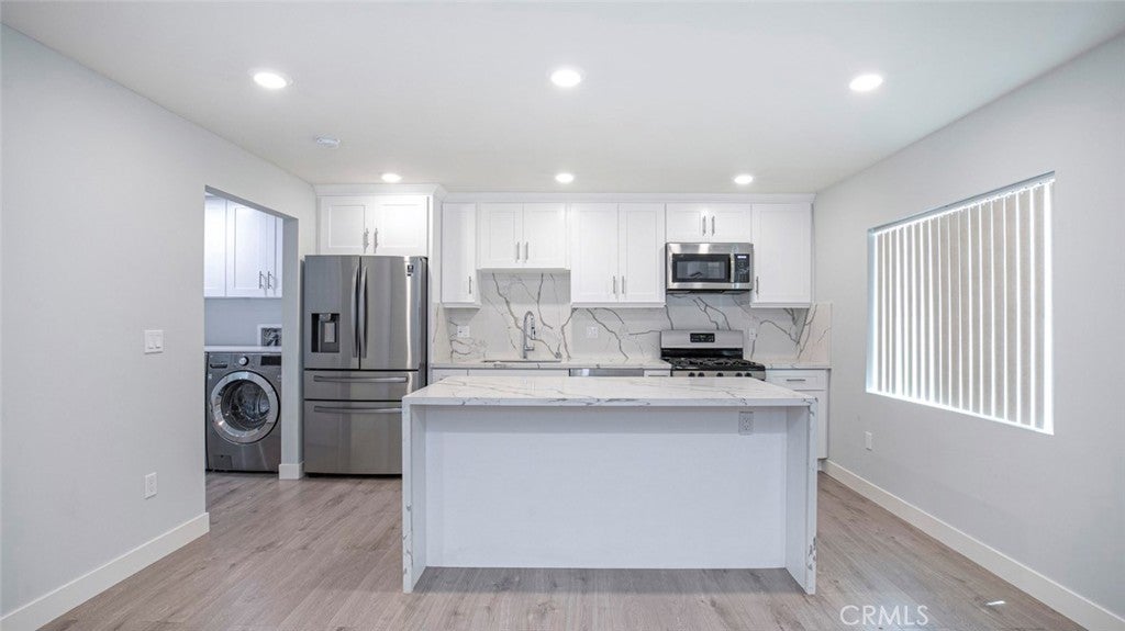 Welcome to this beautiful 1 bed, 1 bath, 600 Sqft backhouse ready for you! Enter into the modern bright and airy living room with an open floor plan, light wood laminate flooring, and recessed lighting throughout. The connected tastefully designed kitchen features a large kitchen island, marble countertops and backsplash, brand new stainless steel appliances, and lots of cabinets and drawers for storage. Right beside the kitchen is the laundry area with a new washer and dryer included. Beautiful bathroom has marble finishes and tiled floors. Minimalistic bedroom offers lots of room and built in closet. Gated, private and with plenty of outdoor sitting area available. In a lovely neighborhood with parks, groceries, shopping and freeway access nearby! 1 small pet is welcome and Landlord pays for water! Plenty of street parking available.