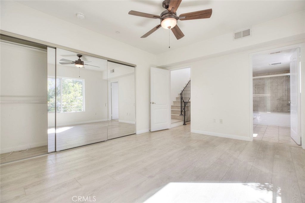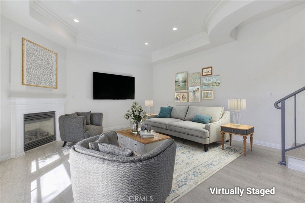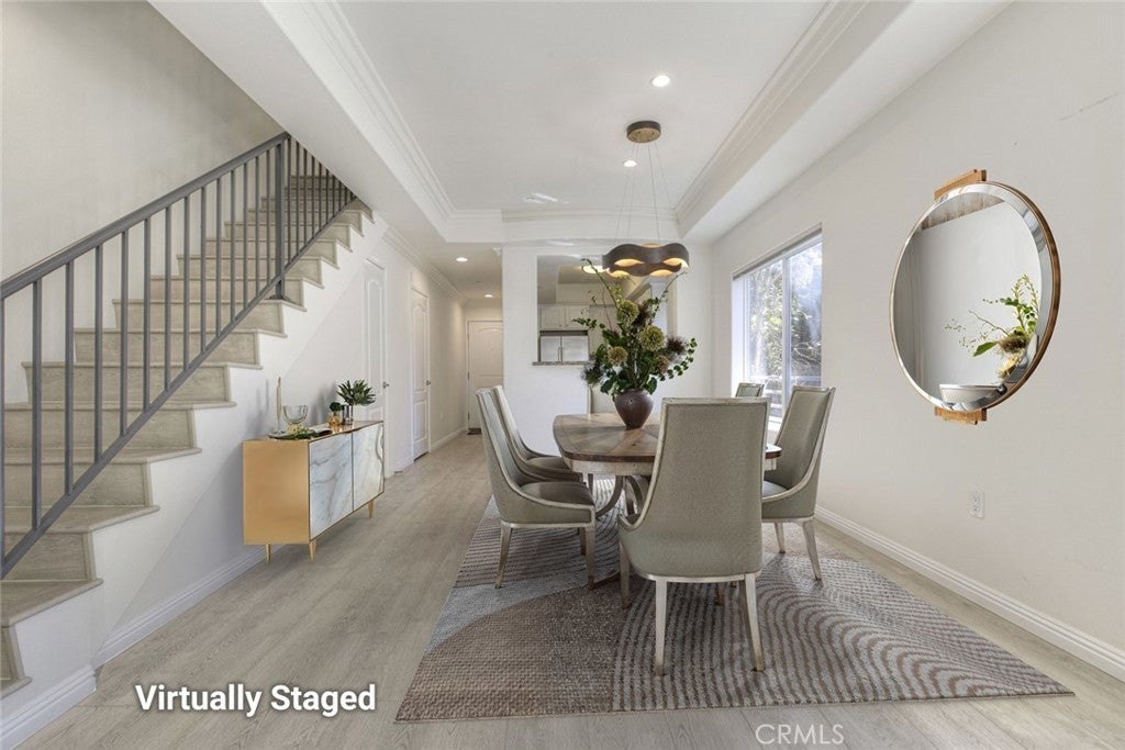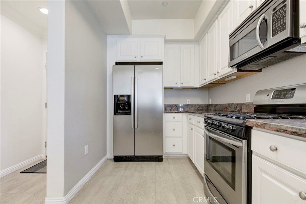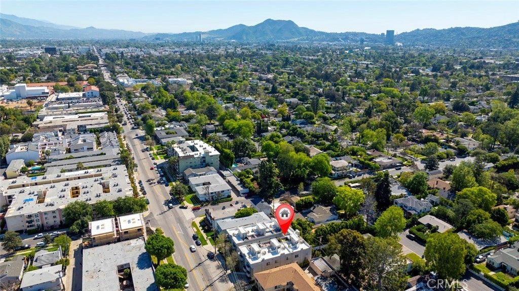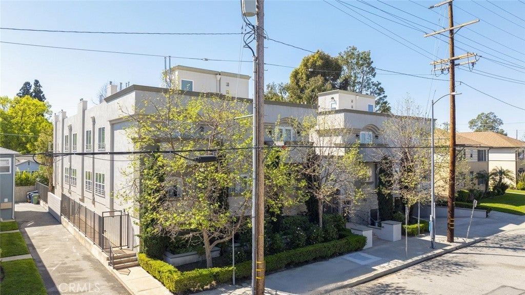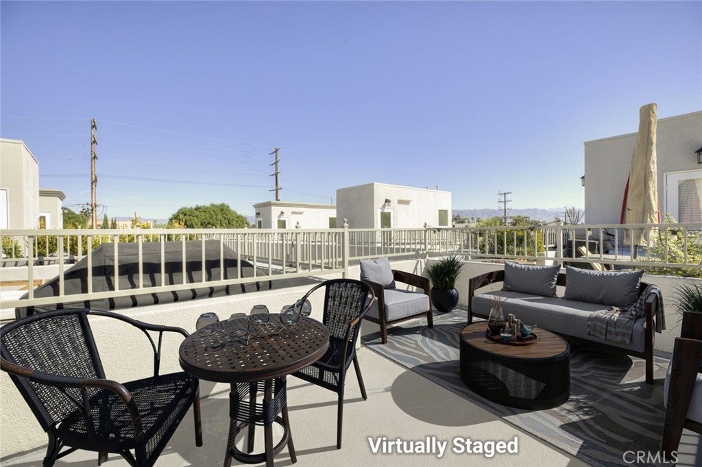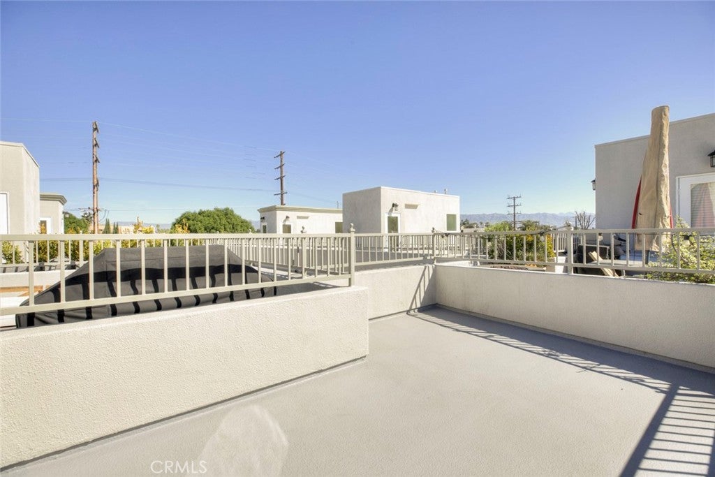 Welcome to this bright and private, rear end-unit stylish townhouse located in a desirable Valley Village neighborhood, offering 1,290 sq ft of comfortable living in a quiet, secure community. This home features updated luxury vinyl flooring, with the main level has an open and airy floor plan with a living room filled with natural light from multiple windows, a decorative fireplace, elegant crown ceilings, recessed lighting, and a dining area that flows seamlessly into the updated kitchen with stainless steel appliances and generous cabinet space. A convenient powder room completes the first floor. Upstairs are two spacious bedrooms, each with its own private ensuite bathroom and large closets, providing comfort and privacy. The hallway laundry area adds everyday convenience. On the top level, is your private rooftop patio, perfect for relaxing, entertaining guests, or enjoying the views. Additional features include two parking spaces in a secured subterranean garage. The community is disabled-friendly with an elevator lift. The 12-unit complex is well-maintained. HOA covers water, trash, earthquake insurance, and maintenance of common areas. Convenient location: near studios, schools, shopping, eateries, entertainment and freeways. This home offers the perfect blend of style, privacy, and convenience.