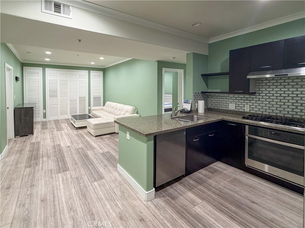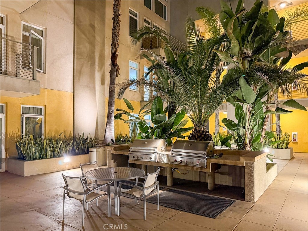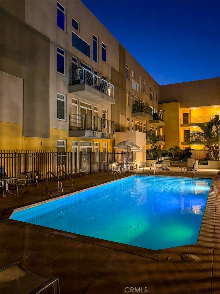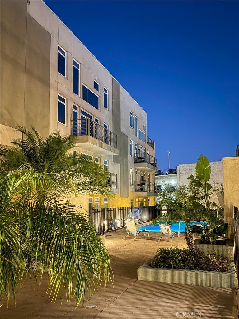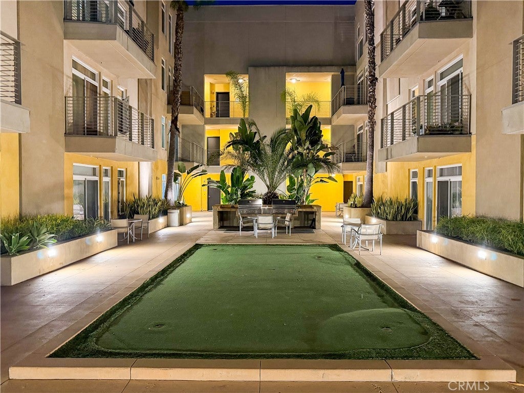 Experience sophisticated condominium living in the highly sought-after Burbank Collection, perfectly positioned in the heart of Downtown Burbank. Located directly across from AMC Theatres, this bright and modern 2-bedroom, 1-bathroom unit spans 920 square feet and features an excellent open-concept floor plan with fresh sage-green accent walls, light wood-look flooring, and recessed lighting. The gourmet kitchen showcases rich dark cabinetry and stainless-steel appliances including a gas range and oven that opens seamlessly to the living and dining areas. The spacious primary bedroom offers a peaceful retreat with excellent natural light while the updated bathroom features elegant marble-look tile, a glass-enclosed tub/shower combination, and a contemporary floating vanity. In-unit stacked washer and dryer add convenience. This pool-level unit offers direct patio access to the sparkling resort-style community pool and lush landscaping. Residents enjoy outstanding amenities including a fully equipped fitness center with cardio machines and weights, putting green, BBQ area, and convenient on-site package lockers. HOA dues cover water, gas, trash, sewer, and basic DirecTV service. This turnkey home includes two side-by-side assigned parking spaces in the gated subterranean garage plus extra storage. Located in a prime Burbank location, this rare opportunity will not last long. Schedule your private showing today!
