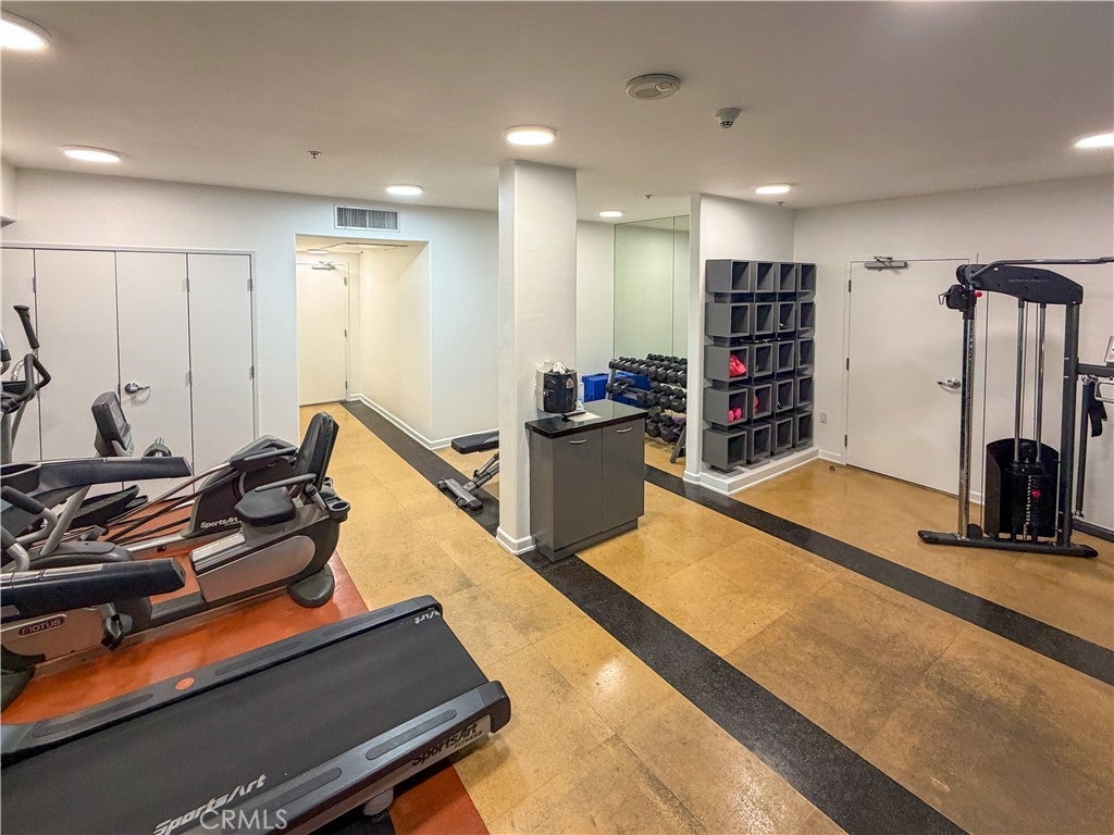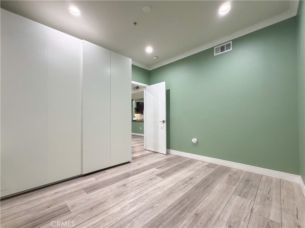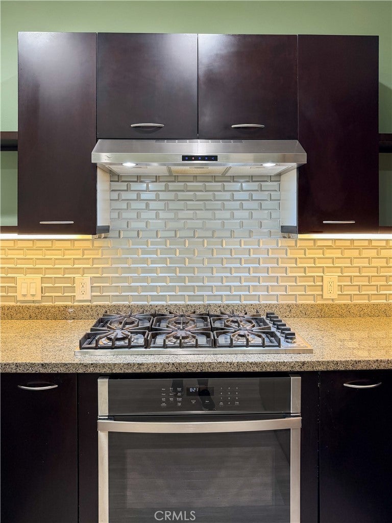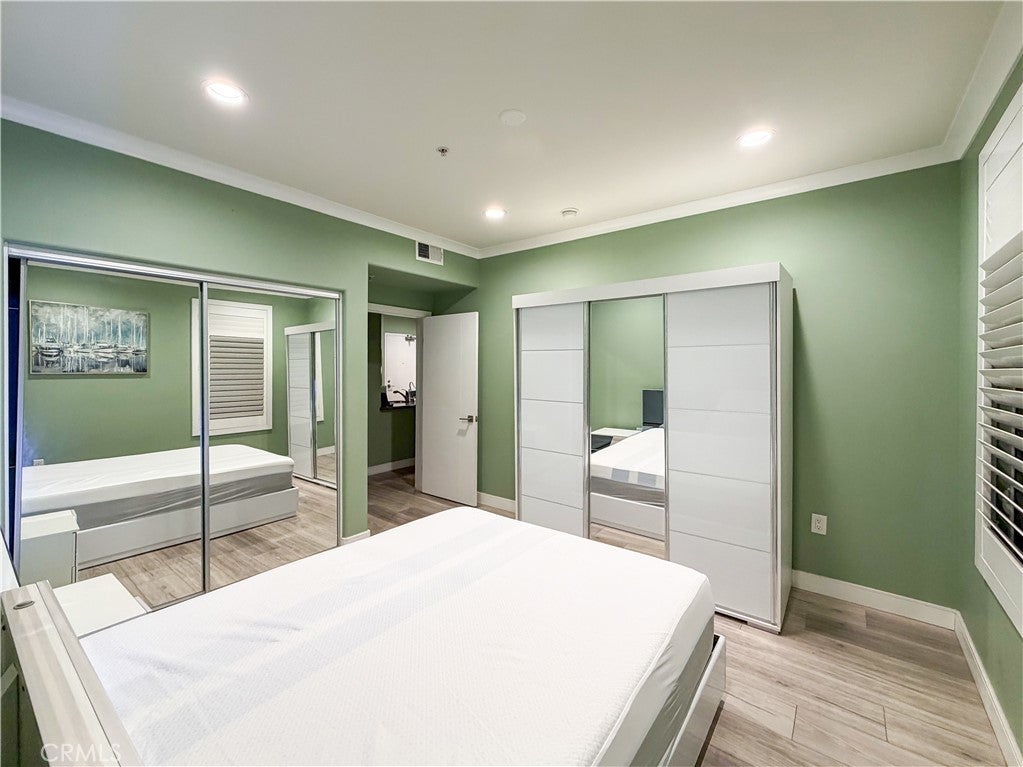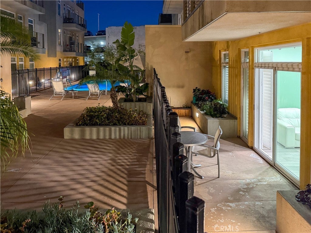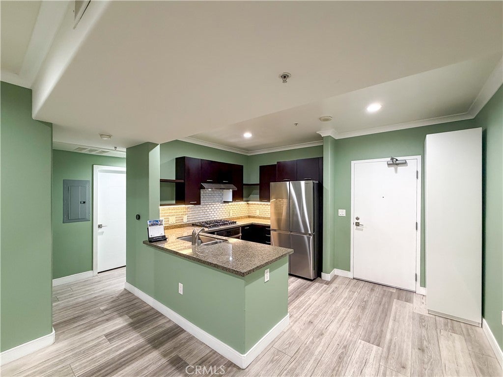 Experience sophisticated condominium living in the highly sought-after Burbank Collection, perfectly positioned in the heart of Downtown Burbank. Located directly across from AMC Theatres, this bright and modern 2-bedroom, 1-bathroom unit spans 920 square feet and features an excellent open-concept floor plan with fresh sage-green accent walls, light wood-look flooring, and recessed lighting. The gourmet kitchen showcases rich dark cabinetry and stainless-steel appliances including a gas range and oven that opens seamlessly to the living and dining areas. The spacious primary bedroom offers a peaceful retreat with excellent natural light while the updated bathroom features elegant marble-look tile, a glass-enclosed tub/shower combination, and a contemporary floating vanity. In-unit stacked washer and dryer add convenience. This pool-level unit offers direct patio access to the sparkling resort-style community pool and lush landscaping. Residents enjoy outstanding amenities including a fully equipped fitness center with cardio machines and weights, putting green, BBQ area, and convenient on-site package lockers. HOA dues cover water, gas, trash, sewer, and basic DirecTV service. This turnkey home includes two side-by-side assigned parking spaces in the gated subterranean garage plus extra storage. Located in a prime Burbank location, this rare opportunity will not last long. Schedule your private showing today!