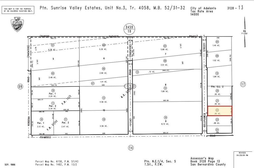 ±1 acre of residential land for sale on Bellflower St in Adelanto; APN: 3128-131-22. Zoned Single Family Residential (R-S5) this zoning allows for the development of up to 5 dwelling units per gross acre. Water is already at site on Paved Bellflower Rd with sewer nearby. Local amenities for future residents will include Victoria Magathan Elementary School, Adelanto High School, Dollar General, City Hall, Richardson Park, US Post Office, and Adelanto Stadium and Event Center. The Event Center draws hundreds of thousands of people each year, hosting events like Comedychella, Kush Stock Festival, Adelanto Grand Prix, Market 760 food festival and various mixed martial arts competitions.