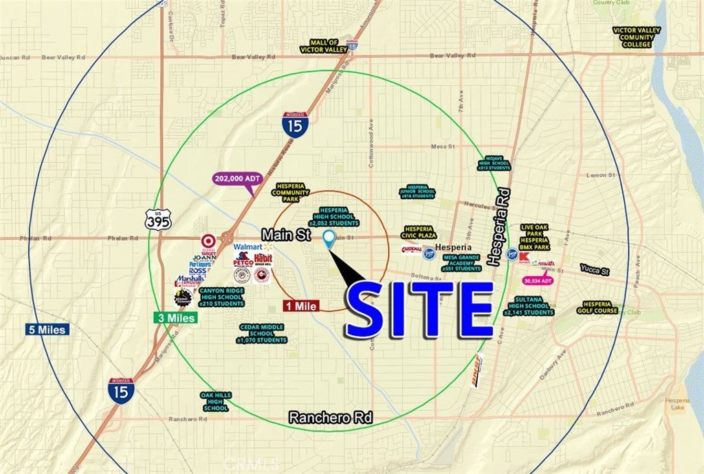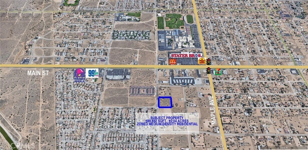 2.04 acres vacant land zoned Medium Density Residential within the City of Hesperia. This Main Street Corridor Specific zone offers an opportunity to deliver medium density multi-family housing in a garden setting such as courtyard apartments, condominiums and walk-up townhomes. This zone also permits single family residences in small lot subdivisions. The gross residential density range permitted in this zone is 8 – 15 units/acre This flat, street-level parcel has paved access, water, sewer, and power (buyer to verify all utilities).