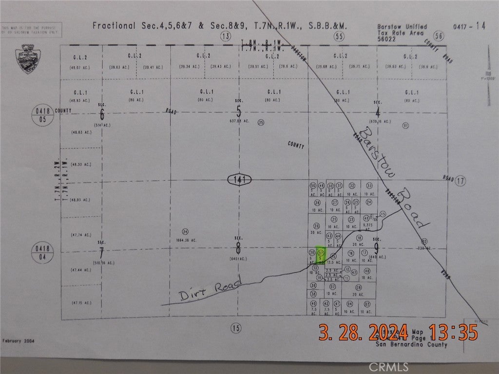 Two parcels, total 10 acres of beautiful desert land on Ranch Road. This road is south of the Slash-X area, west of Barstow Road and north of Brack Road. Together they form a square that is 660' x 660'. The larger of the two parcels, APN 0417-141-46 is 9.37 acres. APN 0417-141-45 is 0.63 acres and is located at the NE corner of the 9.37 acre parcel. Current owner had a well put in years ago and it did produce water. The property was vandalized over the years, including the well. The well has a cement slab, there is also a small cinder block building and another cement slab where perhaps another building used to be. Ranch Road is a dirt road that goes to the property from Barstow Road then jogs around the property. DIRECTIONS: From Barstow Rd at Rimrock Rd.: Go south on Barstow Rd for approx. 11.8 miles to Ranch Rd. Turn right, go approx. 1/4 mile, road will jog to the left for about 400' then turns 90 degrees to the right & continues west to run along the approx. south boundary of Subject property.