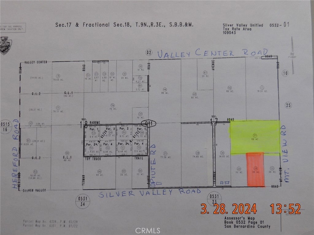 Motivated Seller, make offer. PRIME location in Newberry Springs. This has to be one of the best opportunities available in the area. Two adjoining parcels, totaling 80 acres on paved road, centrally located in Newberry Springs. The 20 acre parcel fronts on Silver Valley Road, the 60 acre parcel is behind the 20 acre parcel and has frontage on Mountain View Rd. Palos Verdes Road is at the NE corner of the 60 acre parcel. The parcels are NW of the corner of Silver Valley Rd and Mountain View Rd. The two parcels together are shaped like a "T". The parcel numbers are 0532-011-28 (20 acres) & 0532-011-37 (60 acres). These parcels are located approximately just 660' east of the homes at 44522 Silver Valley Rd. Silver Valley Elementary School is just over a mile east of this property. What a great place this would be to build your ranch. Alfalfa fields are nearby. Lot sizes indicated include both parcels and are taken from tax assessor's public records.