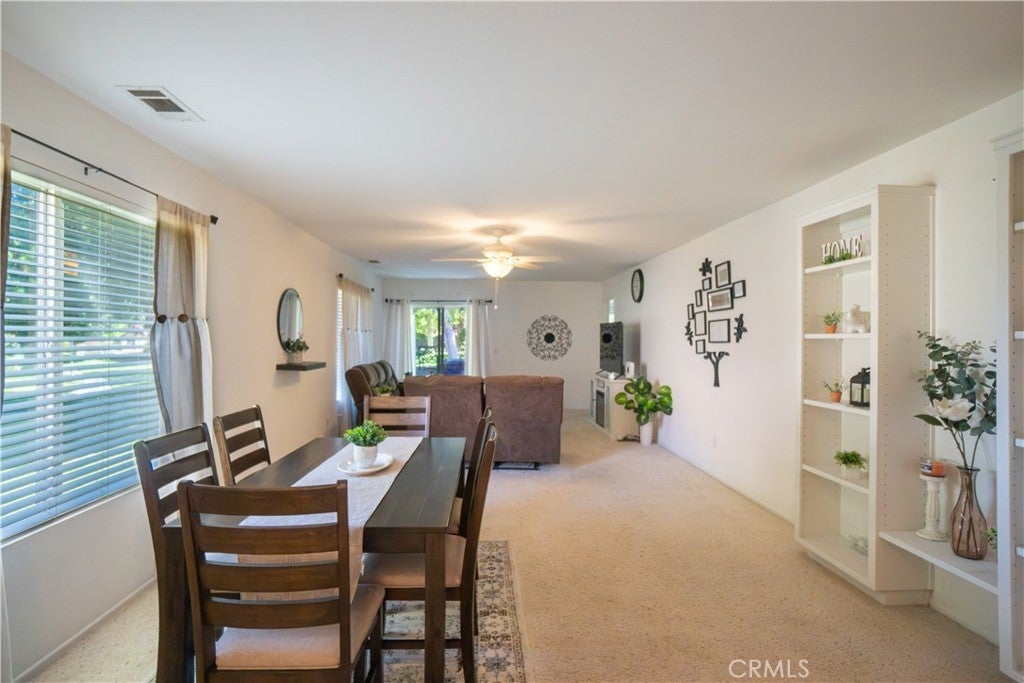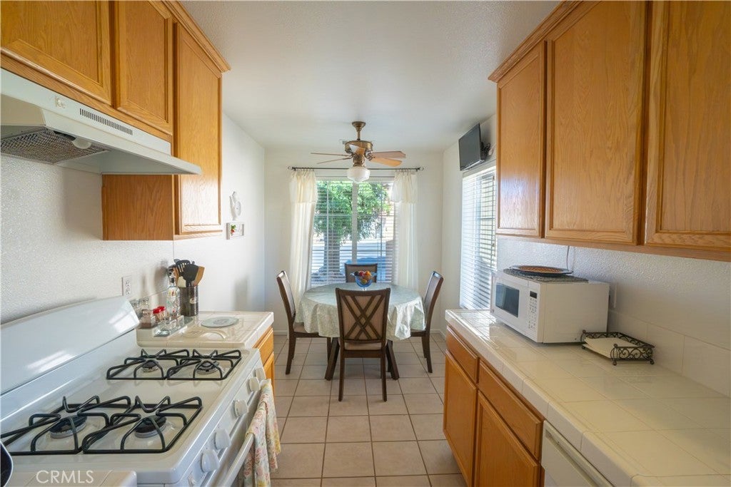 Beautiful house features 2beds and 2baths on an oversized lot, located in a well maintained senior gated community. Kitchen features tile countertops and floors and lots of shelves and cabinets and a breakfast nook area. Spacious living room/dining room area with ceiling fan and built-in shelves. There are ceiling fans thru-out the home. Each bedroom has a walk-in closet and nice bathroom. The secondary bedroom has its own private courtyard/patio area. Extra room with ceiling fan, perfect to use as a home office.The garage, with laundry has loads of storage cabinets. Private covered patio, that looks out over the green grass and trees of the large green belt /park area. MUST SEE TO APPRECIATE!!!