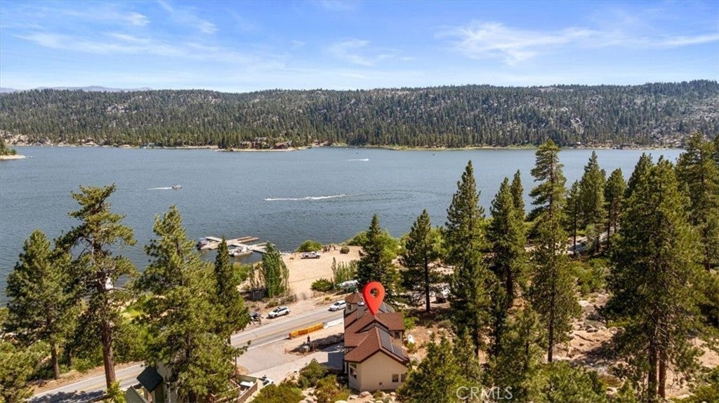 Epic lake views! Located near the dam in a deep-water area of Big Bear Lake, this one-of-a-kind lakeview home offers dock privileges with sandy beach access and some of the most breathtaking views on the mountain. From sunrises and sunsets to moonrises over the lake, every moment here is framed by nature’s beauty. Backing to the National Forest, this peaceful retreat is a haven for outdoor lovers—enjoy fishing, water sports, hiking, biking, and regular sightings of bald eagles, deer, and other local wildlife. A dramatic three-level lighted waterfall welcomes you to a thoughtfully designed, handicap-accessible home featuring a rare five-level elevator. Three spacious private suites each include a full bath; two of the suites also feature kitchenettes. A balcony on each of the three levels offers breathtaking views of the lake and waterfall. At the top, the fourth-floor turret offers sweeping panoramic views and a generous 10’ x 10’ walk-in closet. The main living area is open and airy, with soaring ceilings, a brand-new wood-burning stove, and new stainless steel appliances in the large kitchen—perfect for gathering and entertaining. The primary suite includes a spa-like bath with a Jacuzzi tub and walk-in shower. Additional features include a whole-house reverse osmosis system with a 900-gallon clean water reserve, tankless hot water, owned solar panels, level concrete driveway, full RV hookups, and bonus storage/workshop spaces not included in the square footage. Drawings for main level addition included. Whether you’re seeking a full-time residence, a vacation home, or a income-generating vacation rental, this remarkable lakeside sanctuary in quiet and scenic Fawnskin is a rare opportunity not to be missed.