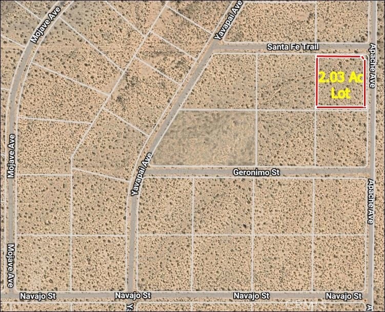 Seller financing may be available for this 2.03 acre corner lot only 1 mile west of Highway 395 is flat and don't have any Joshua Trees, this lot is really close to highway 395, easy to find and you don't need a 4x4 vehicle to get there, it is very easy to find, if you going north on Highway 395 from Shadow Mountain Rd, just drive 5.2 miles to Wheeler Rd, pull to the side to safely make a left on Wheeler Rd, then just drive for one mile to Apache Trail which is only a mile from Highway 395, and is the first street you will see to your left, make a left on Apache Ave, and drive less than one mile to the corner of Apache Ave and Santa Fe Trail which is only about 0.8 of a mile distance from Wheeler Rd, coordinates are 395 34.799190, -117.508441 adjacent lot is also available and can be purchase together and save. The lot is pretty much flat, this may be a good investment to keep your money safe, while maintaining a pece real estate in your portfolio, this lot is just a short driving distance to Victorville to the south or to Helendale to the east, from where you can easily travel north to Barstow or all the way to Las Vegas or north on Highway 395 all the any cities in the northern California. The High Desert is now the future home of the recently approved High Speed Train from Apple Valley to Las Vegas and to the south to Rancho Cucamonga. The project is expected to break ground in the Victor Valley soon and be completed in over the course of the next few years, this projected is expected to bring in jobs and boost the economy of the High Desert.