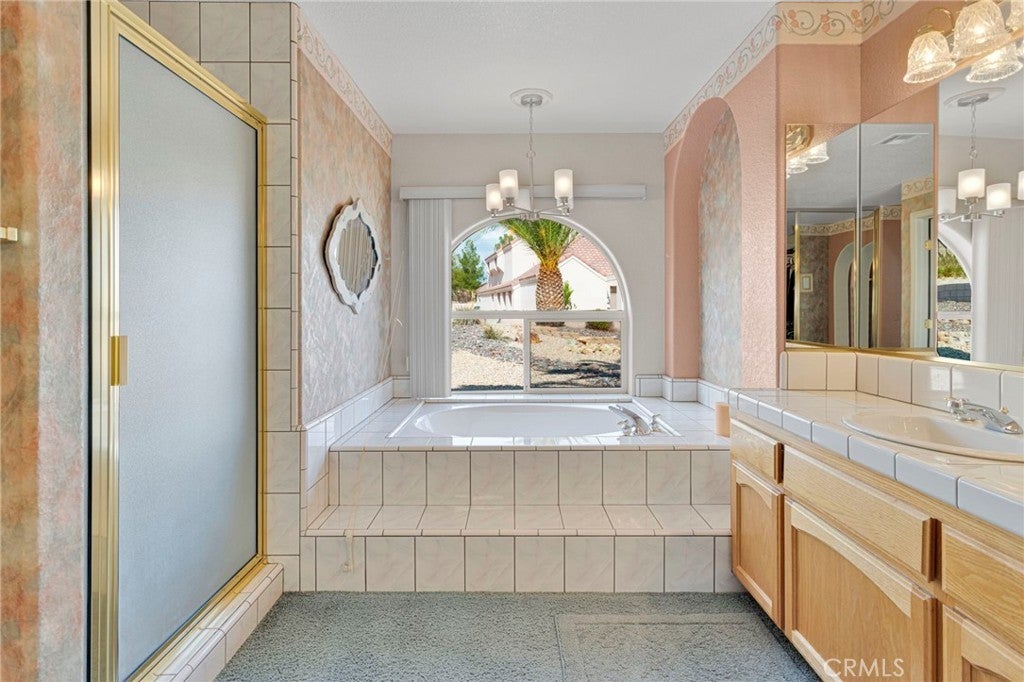 PRICE IMPROVEMENT!!! Custom-Built Deserada Home with Stunning Views & Timeless Charm! Pride of ownership shines throughout this meticulously maintained, custom-built Deserada home located in one of Apple Valley’s most desirable neighborhoods. Offering over 3,000 sq ft of living space, this spacious 4-bedroom, 3-bathroom home is designed for both comfort and elegance. Step inside and you’re greeted by abundant natural light, formal living and dining areas, and a warm, inviting atmosphere. The open-concept kitchen and great room are ideal for entertaining, complete with a cozy fireplace perfect for cool desert evenings. Enjoy your morning coffee in the sunny breakfast nook while soaking in breath taking views of the valley. The split floor plan ensures privacy for everyone. The luxurious primary suite features high ceilings, a fireplace, direct backyard access, a spacious bathroom with dual vanities, a soaking tub, tiled shower, and a generous walk-in closet. Step outside to your own oasis with a covered patio, low-maintenance desert landscaping, and beautiful views. The property also includes a 3-car garage with ample driveway parking. Nestled on a peaceful street with mature palms, octotillos, and an olive tree, this home offers a sense of seclusion while remaining conveniently close to St. Mary’s Hospital, shopping, restaurants, and the 15 freeway. Don’t miss your chance to own this Apple Valley gem—a perfect blend of comfort, style, and location!