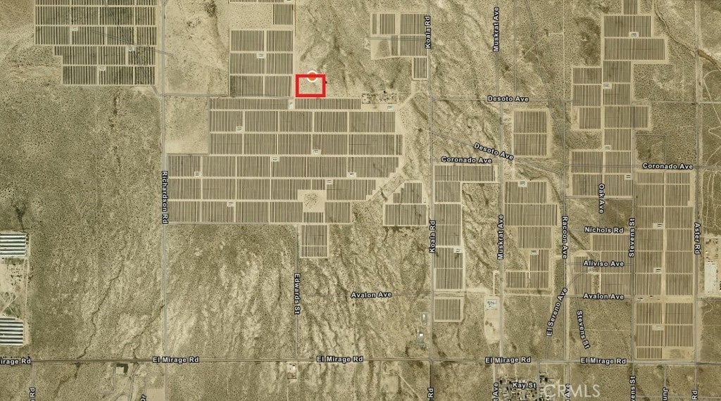 10.4 acres located in Adelanto, CA (El Mirage area). Per the assessors public information this property had a water well at one time - buyer to verify existence & condition of the water well PRIOR To Closing. The neighboring parcels are owned by a solar farm company. Come build your own off grid home or weekend get away retreat. This property is not far from popular off-roading trails and El Mirage Dry Lake OHV area. *Buyer to verify: all possible land use, zoning, utilities, boundary lines and land markers prior to close of escrow. APN# 0458-053-31 // CASH only - Coordinates: 34.617164, -117.462551